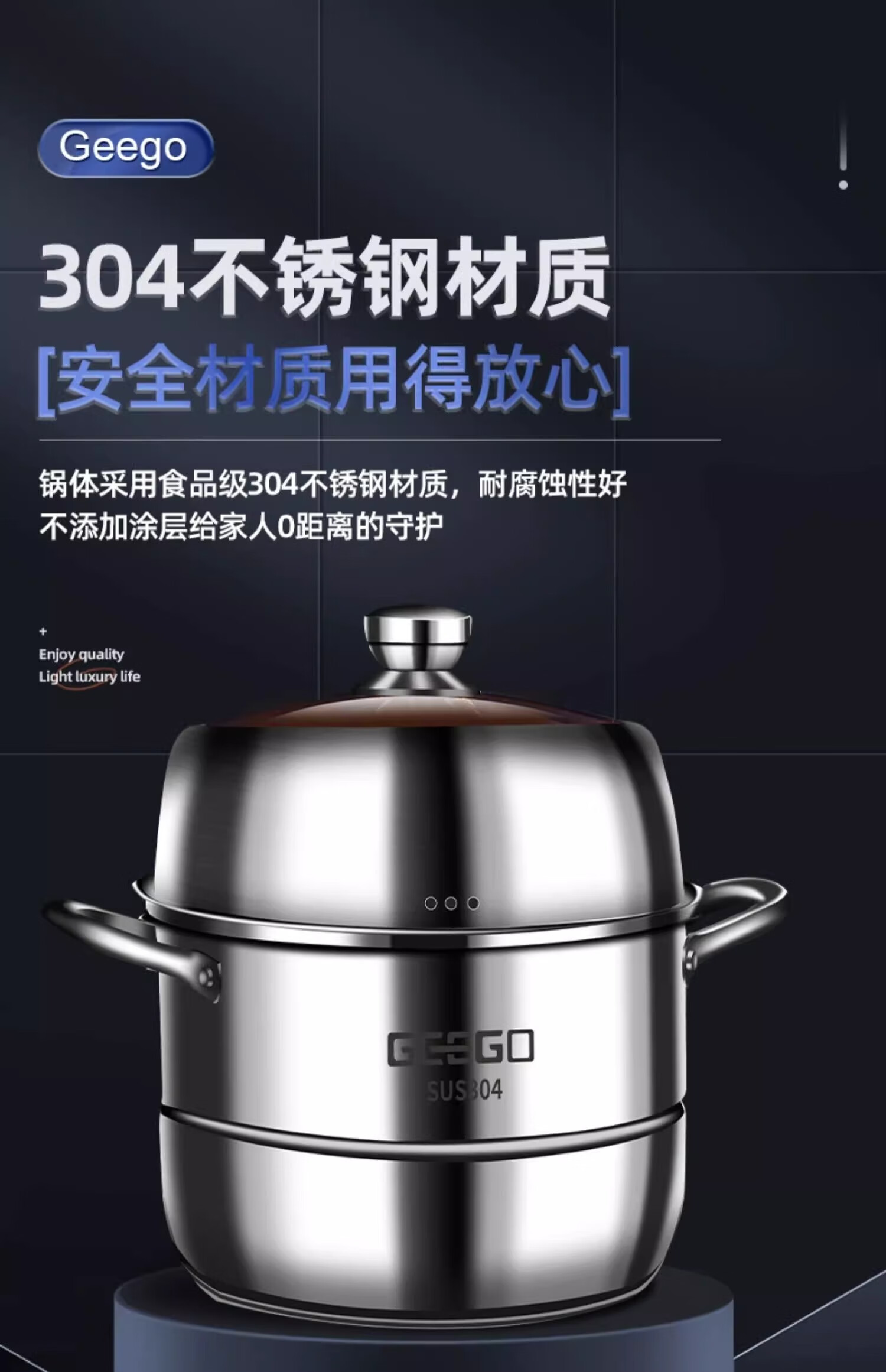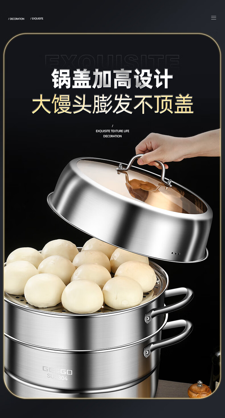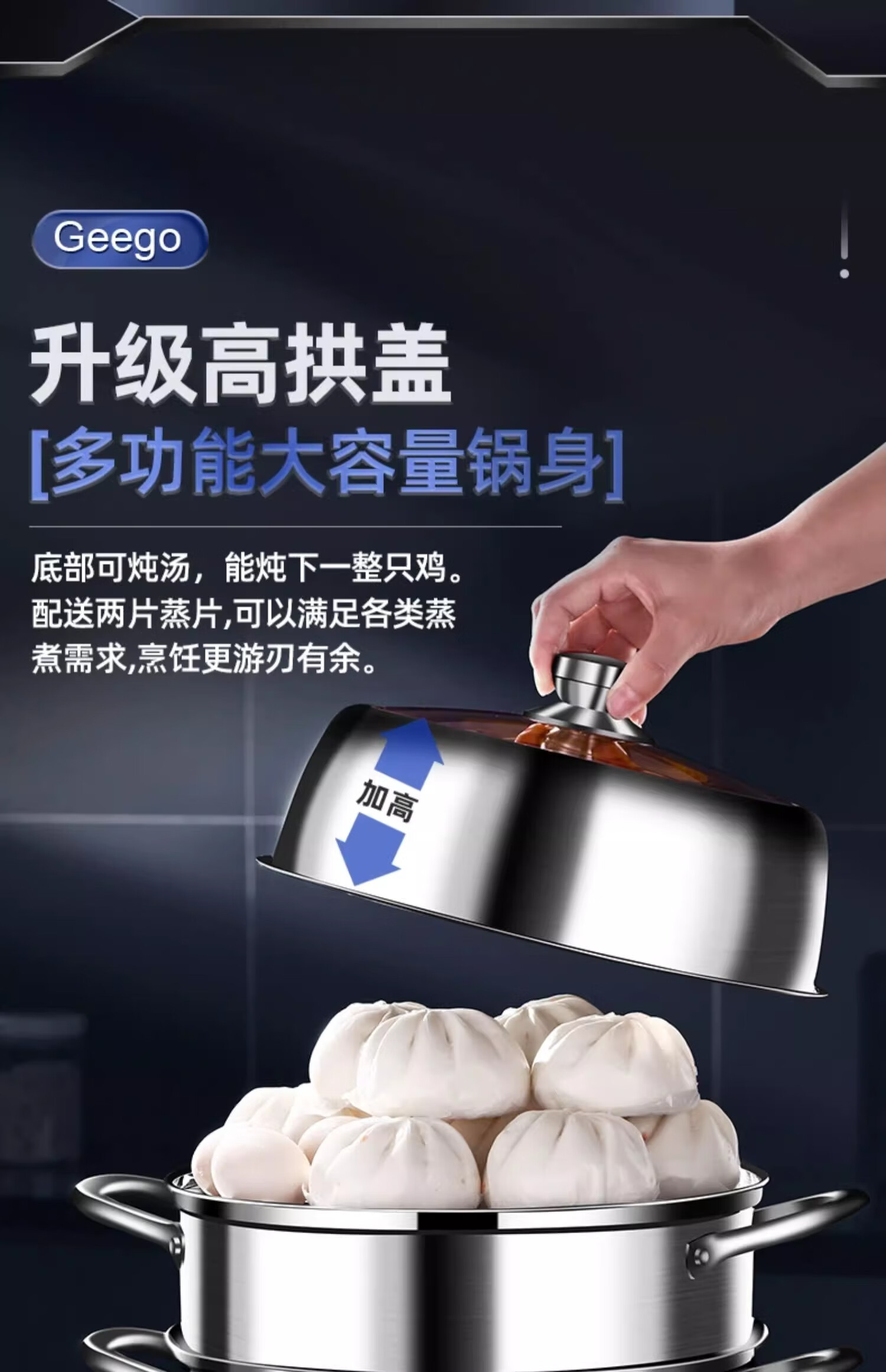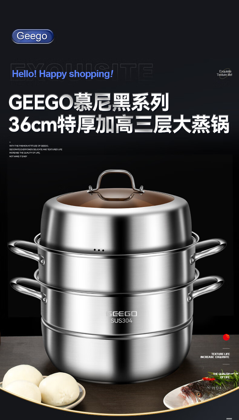 GEEGO thickened 304 stainless steel steamer three layers 36cm large induction cooker universal large steamer gas stove large capacity thickened 304 large steamer about 4.0KG 3 layers 38cm