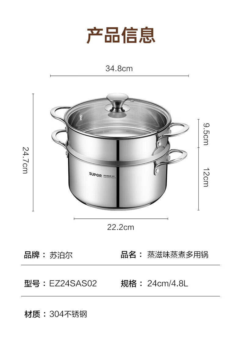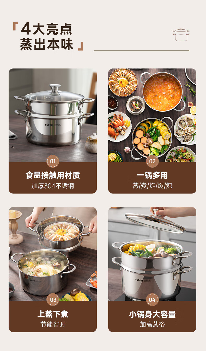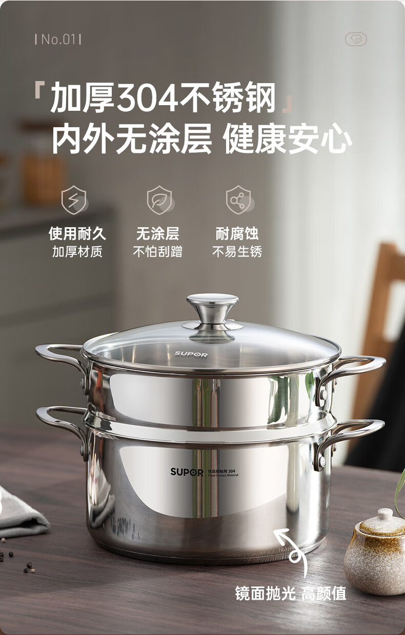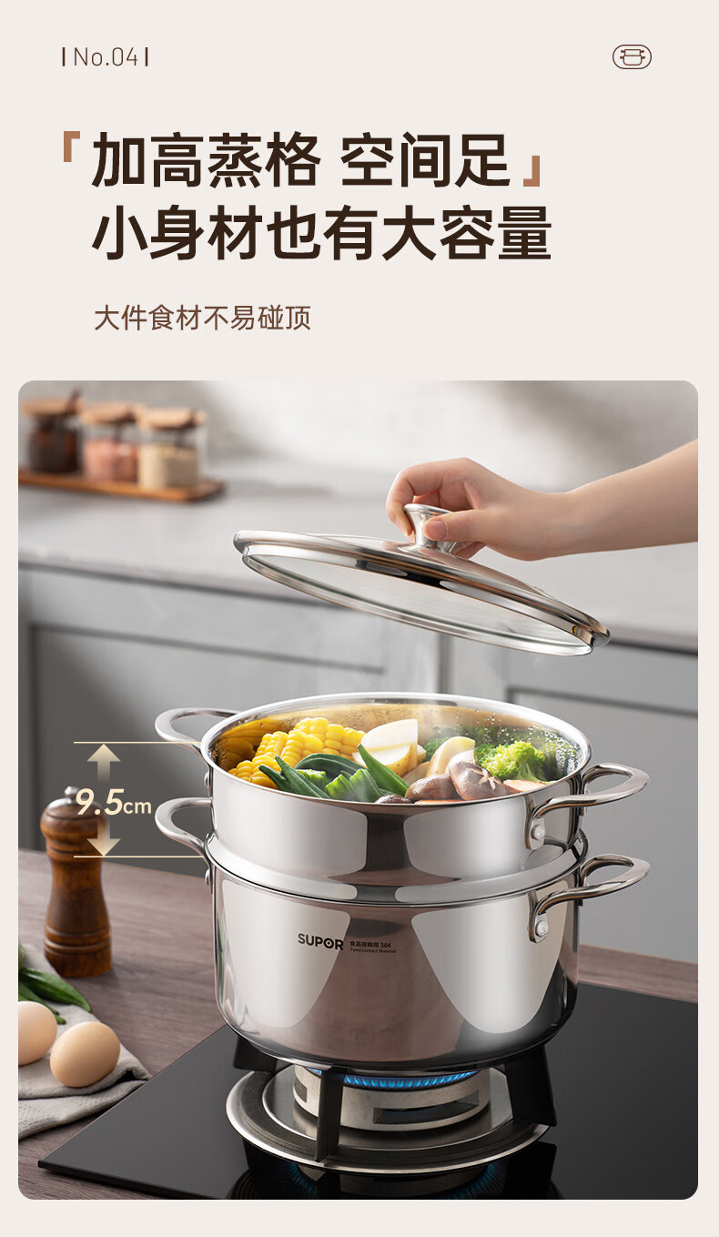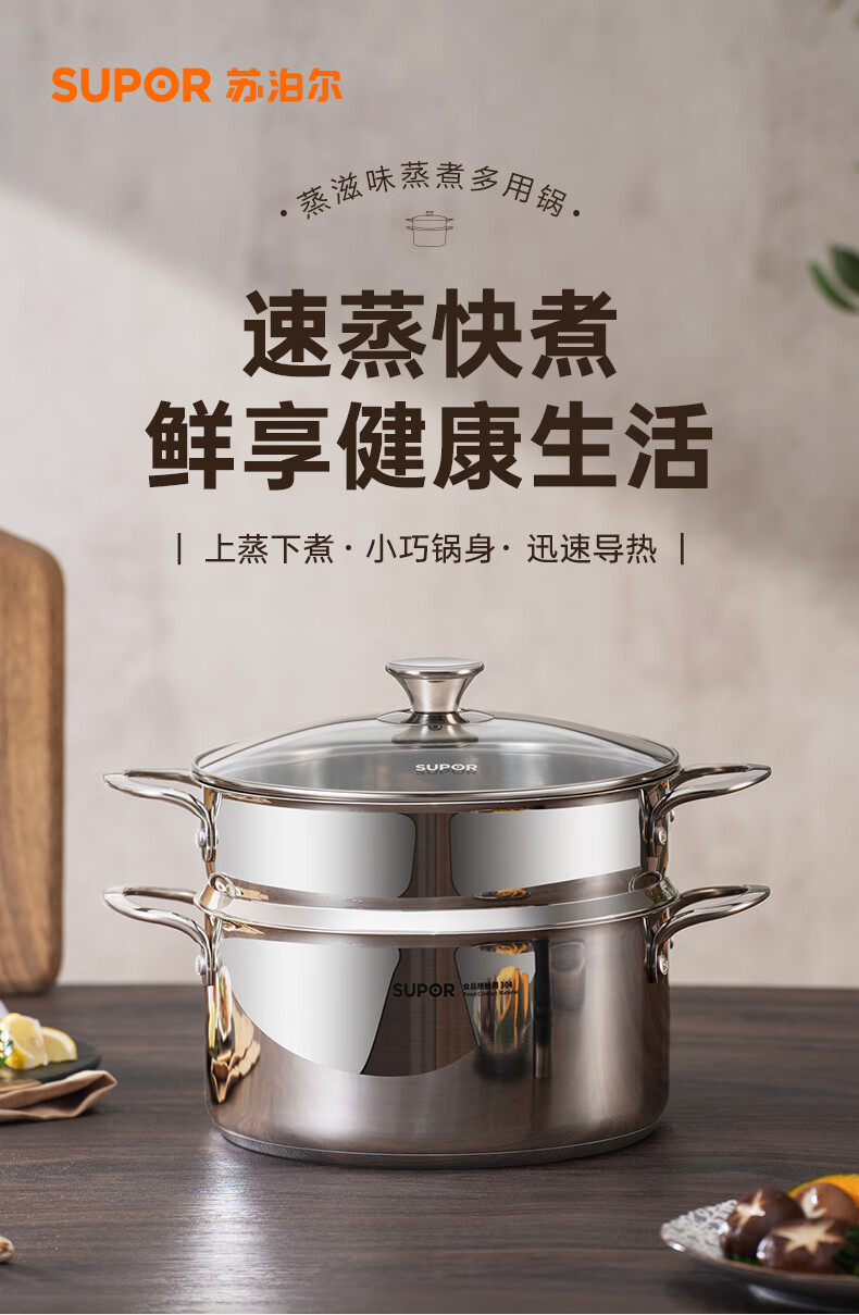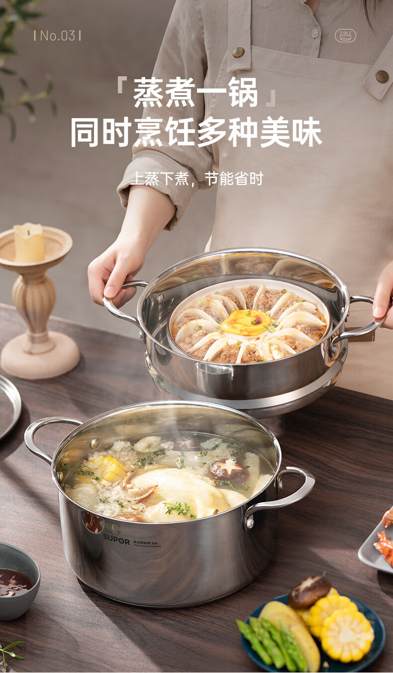 SUPOR thickened 304 stainless steel steamer, two-layer, universal for gas stoves and induction cookers, double-layer soup pot for steamed buns and buns, dual-purpose steamer for cooking, 24cm