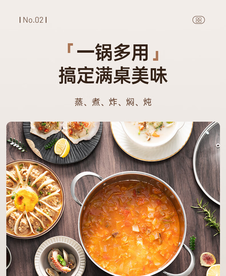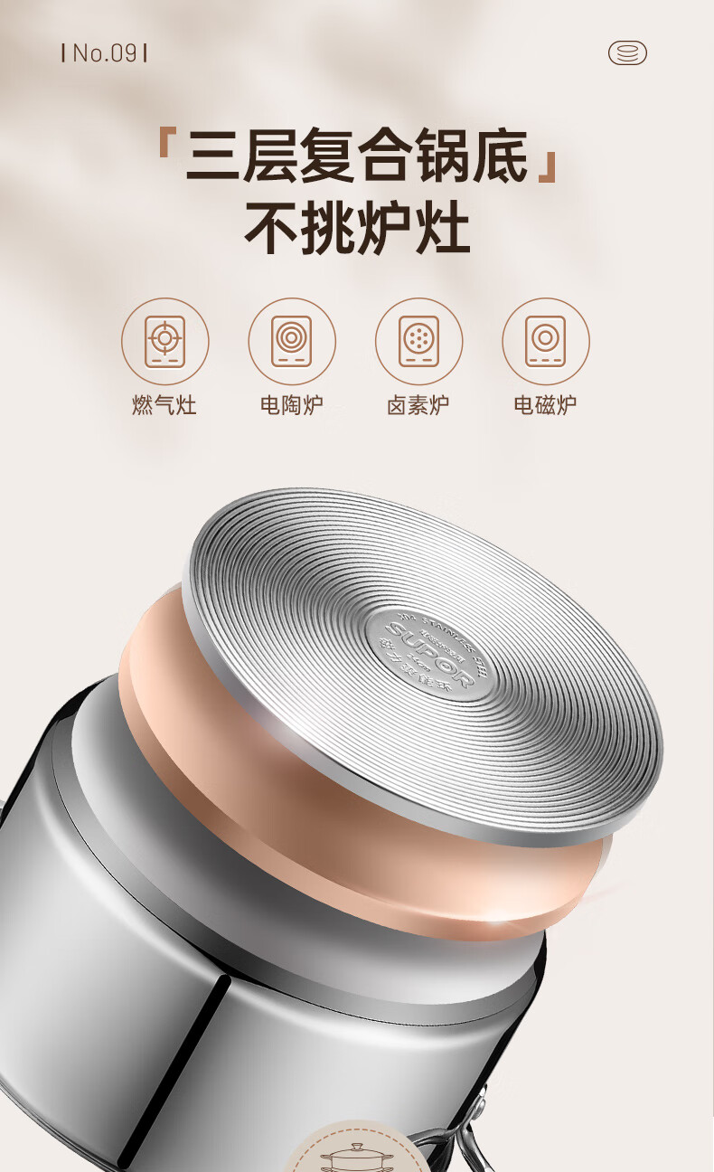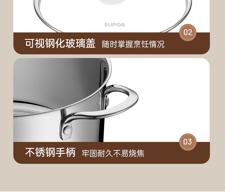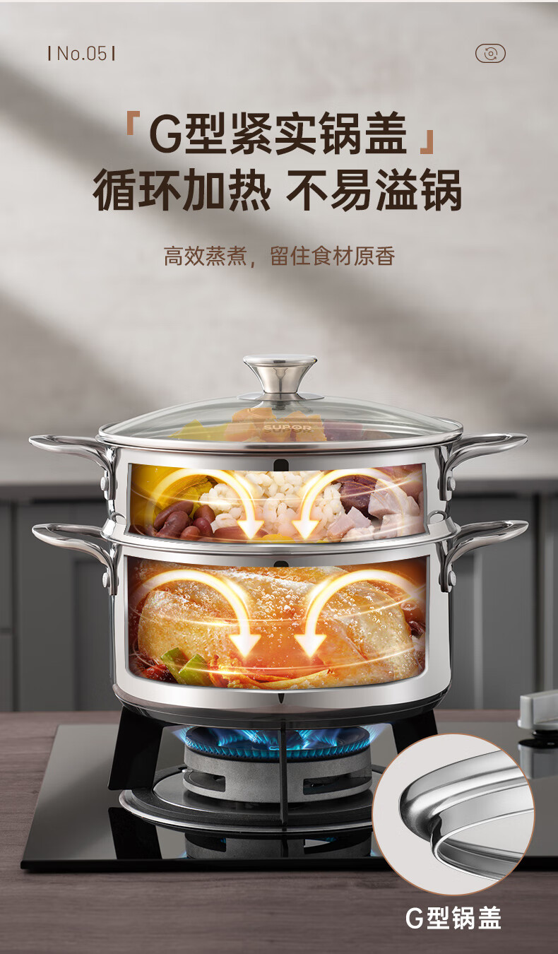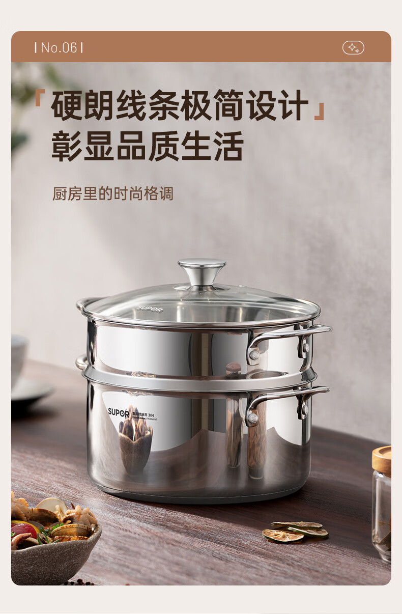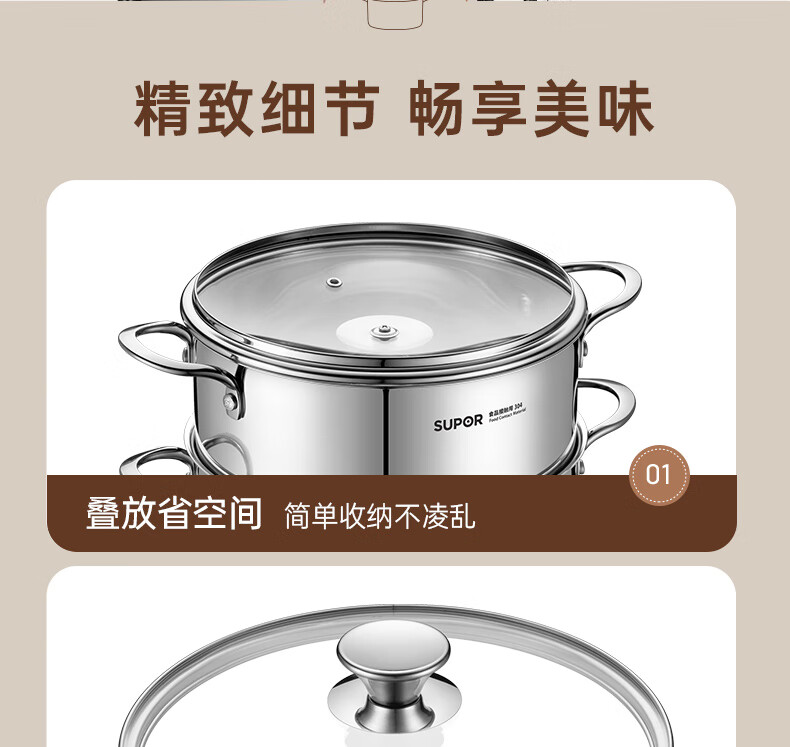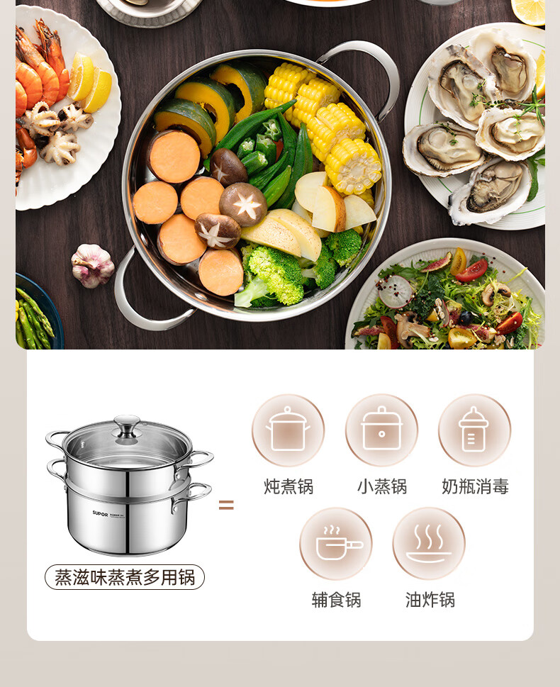 SUPOR thickened 304 stainless steel steamer, two-layer, universal for gas stoves and induction cookers, double-layer soup pot for steamed buns and buns, dual-purpose steamer for cooking, 24cm