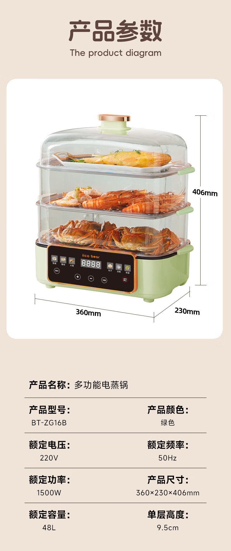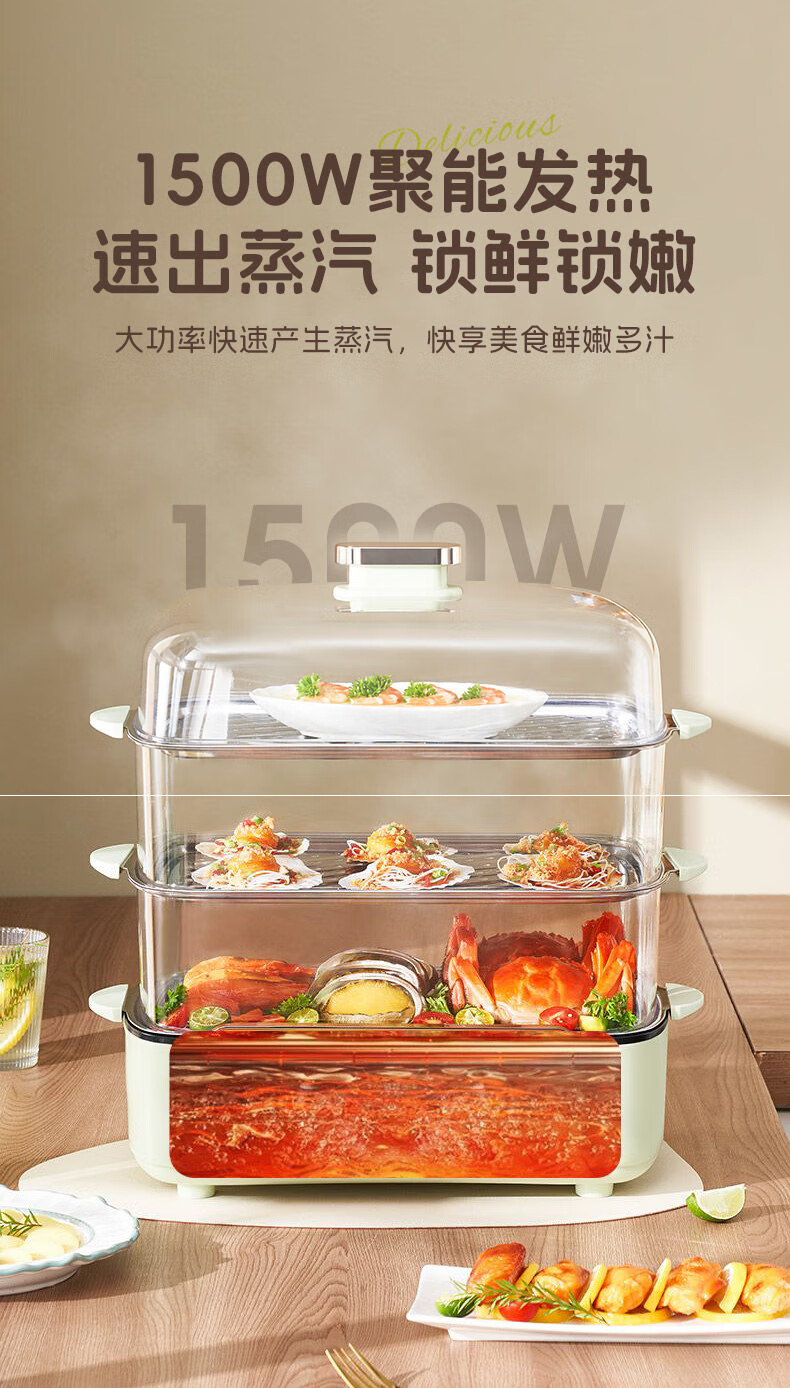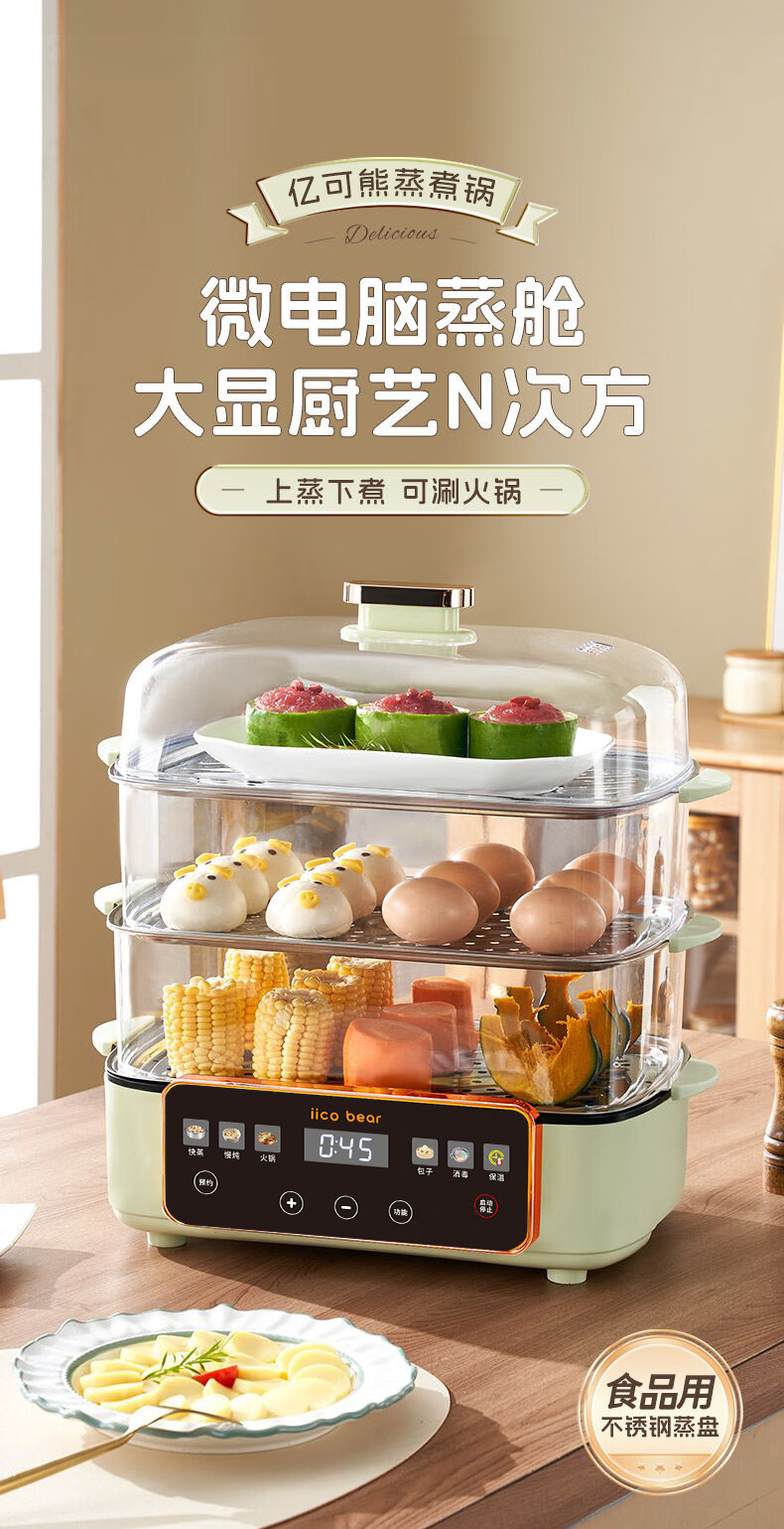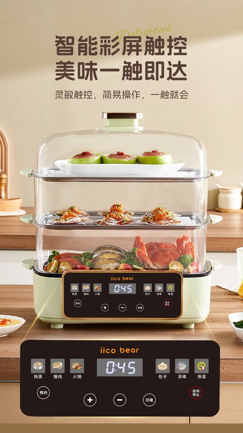 Iicobear electric steamer electric cooking pot multi-functional household steamed fish steamed bun pot three-layer large-capacity timed stew and steam all-in-one pot retro green 48L with steaming pad 3 layers 36cm