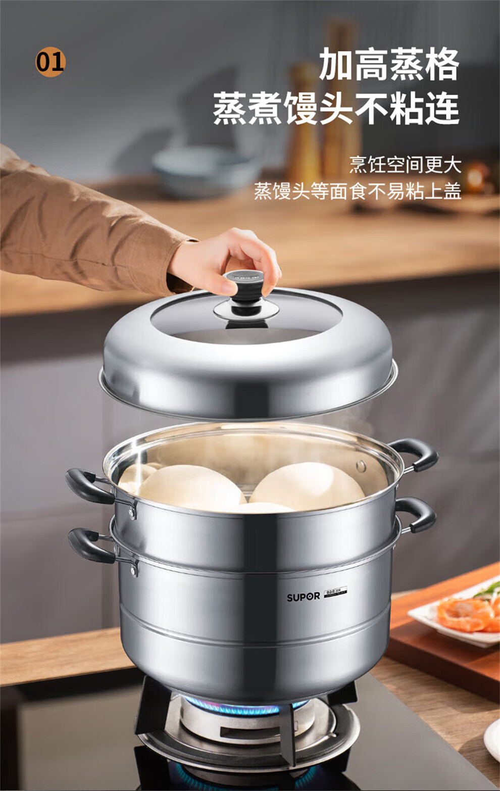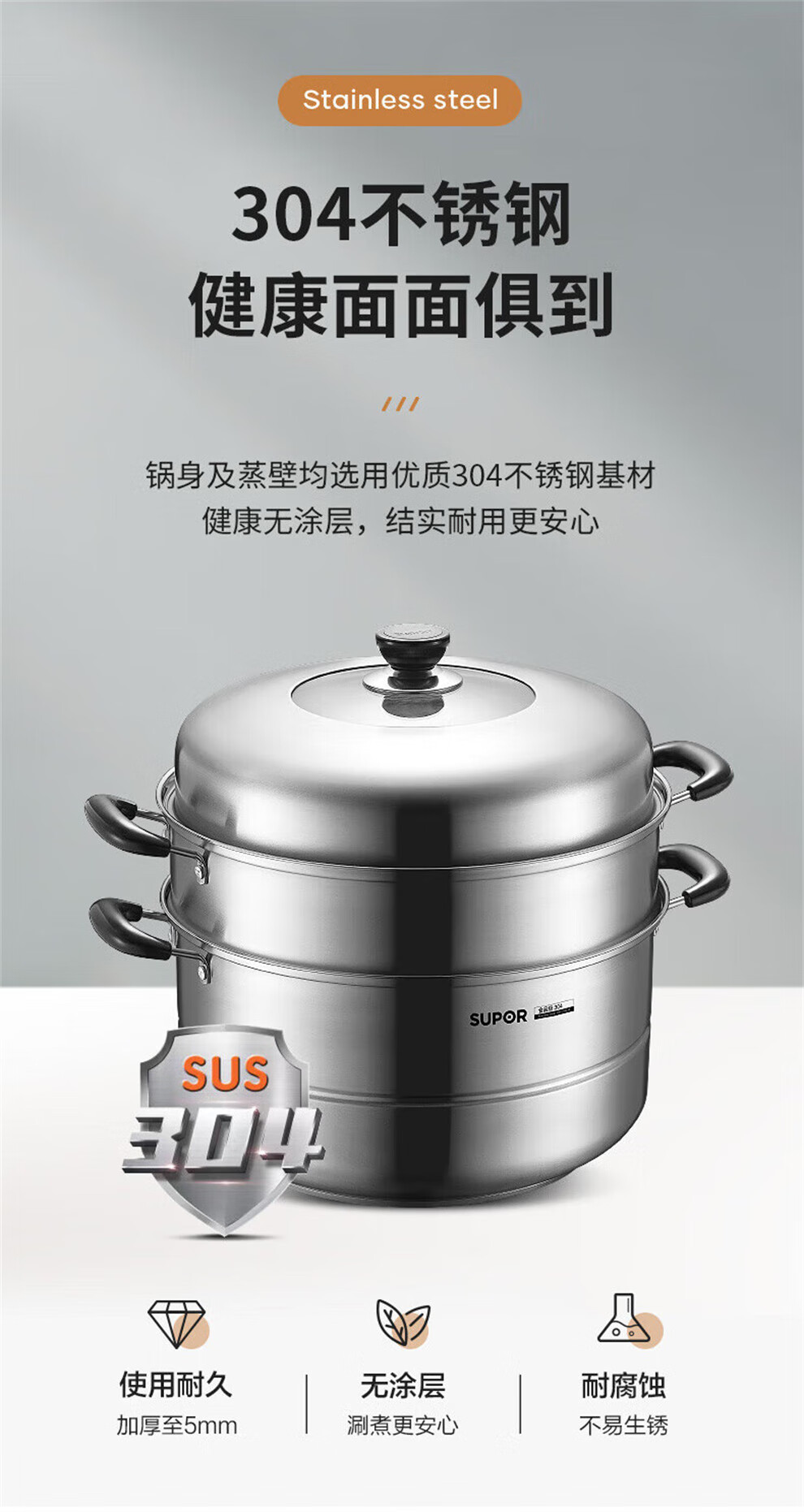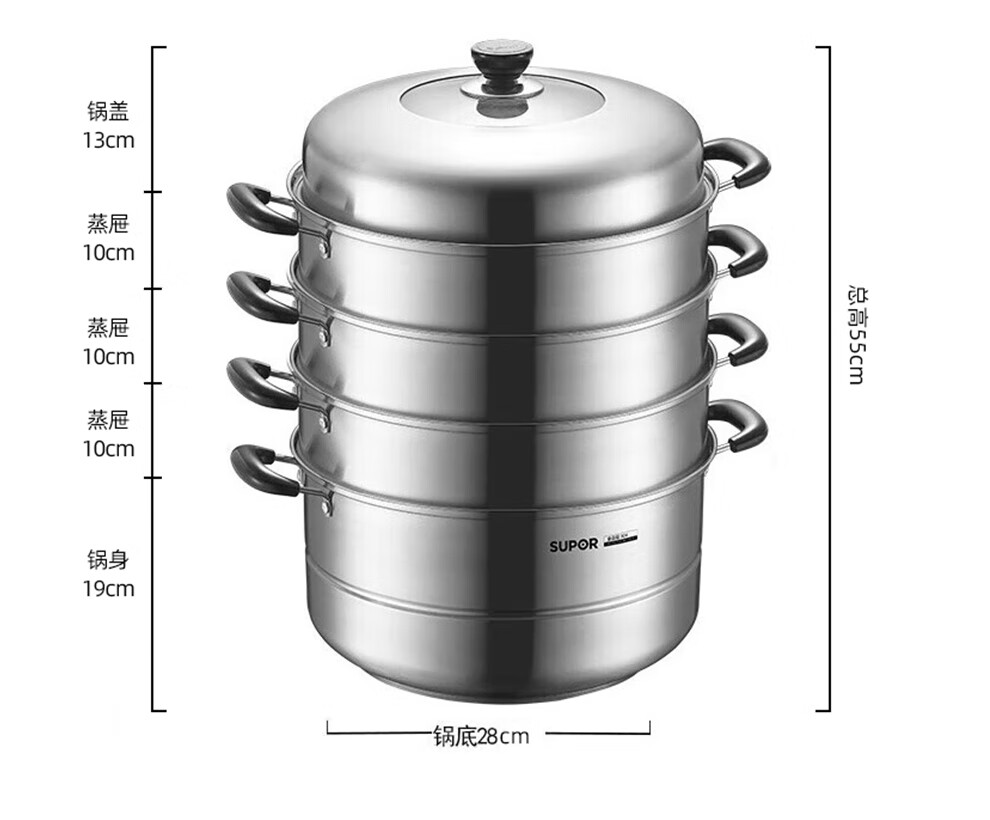 Supor large-capacity steamer three-layer household steamer 304 stainless steel enlarged steaming and cooking dual-purpose pot induction cooker gas universal 3-layer steamer + 1 original steamer becomes 4 layers 34cm