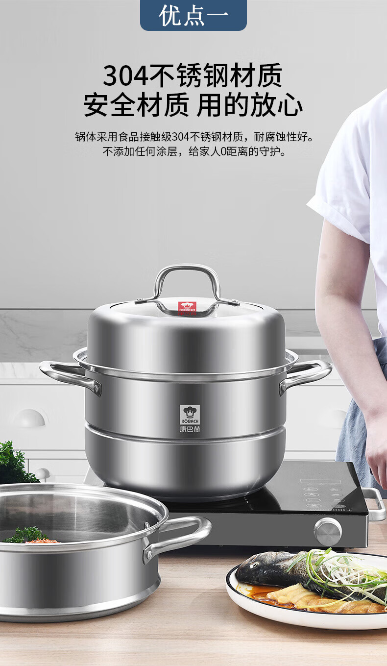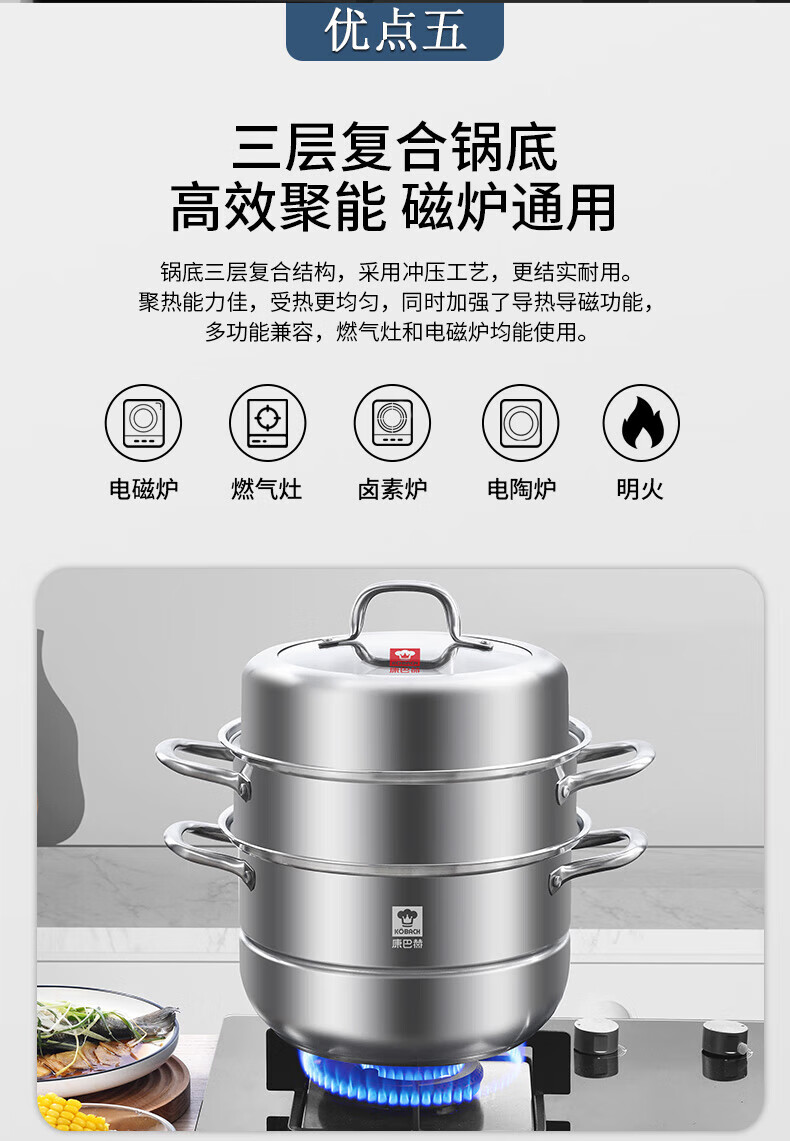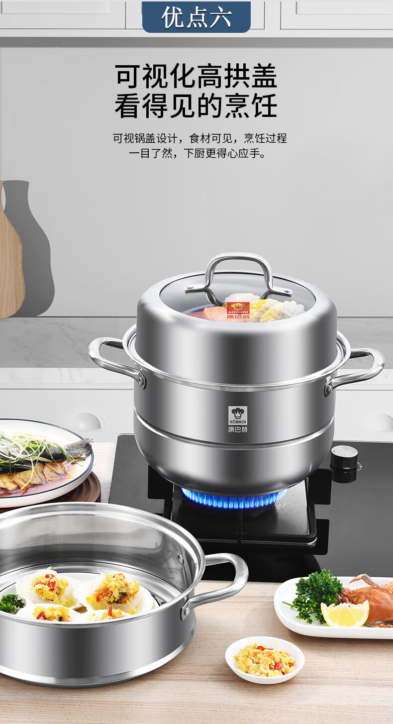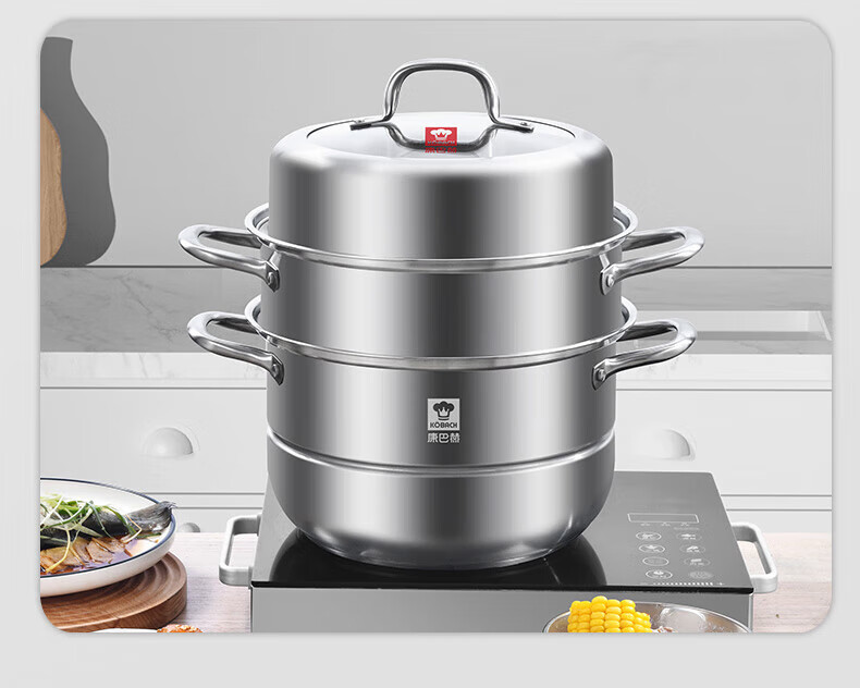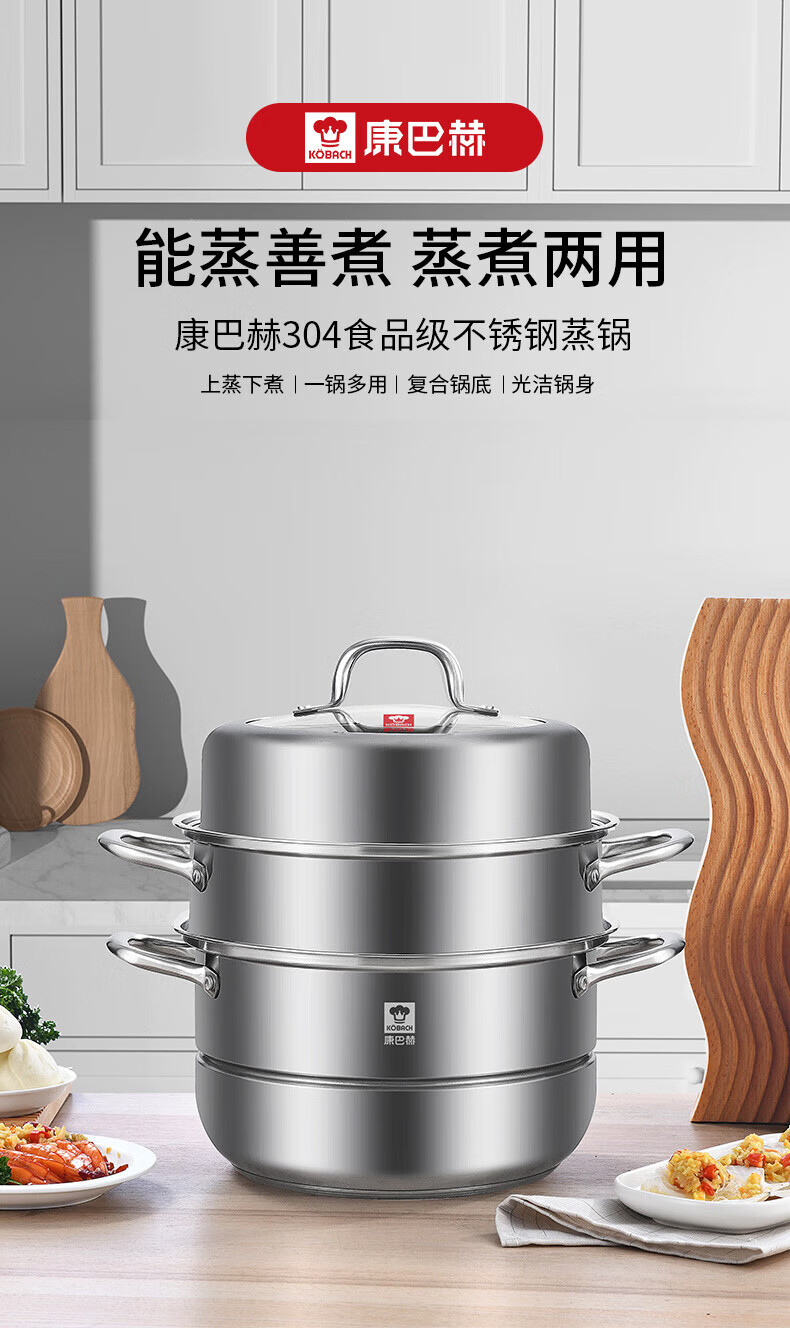 Konbach (KBH) steamer 304 stainless steel steamer double-layer composite bottom soup pot gas stove induction cooker universal flagship model high cover 2 layers 30cm