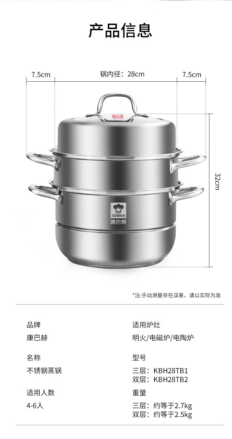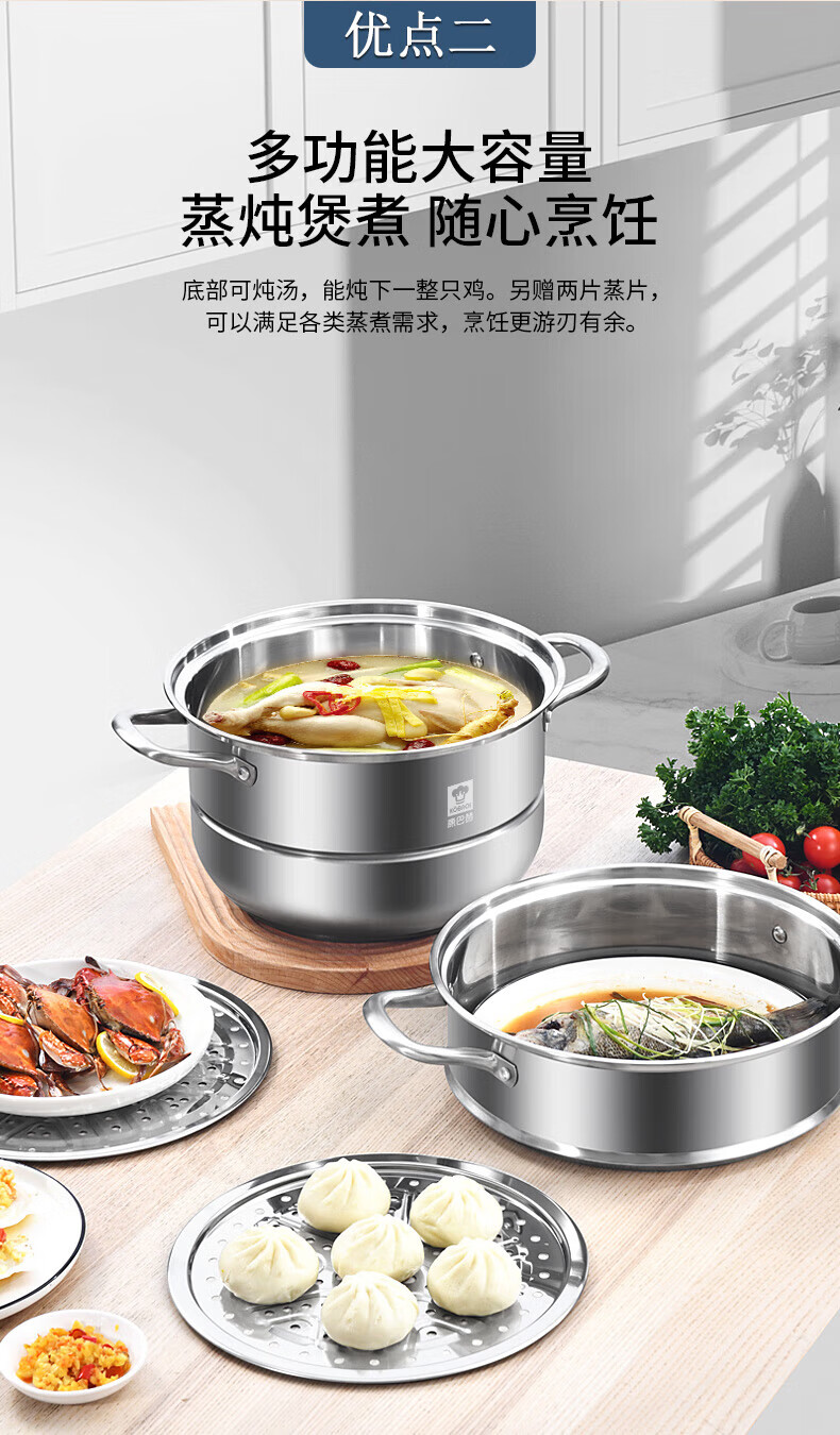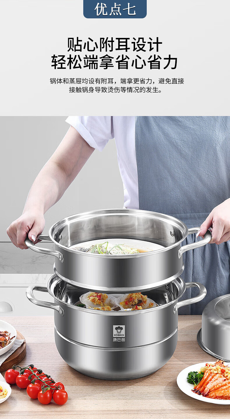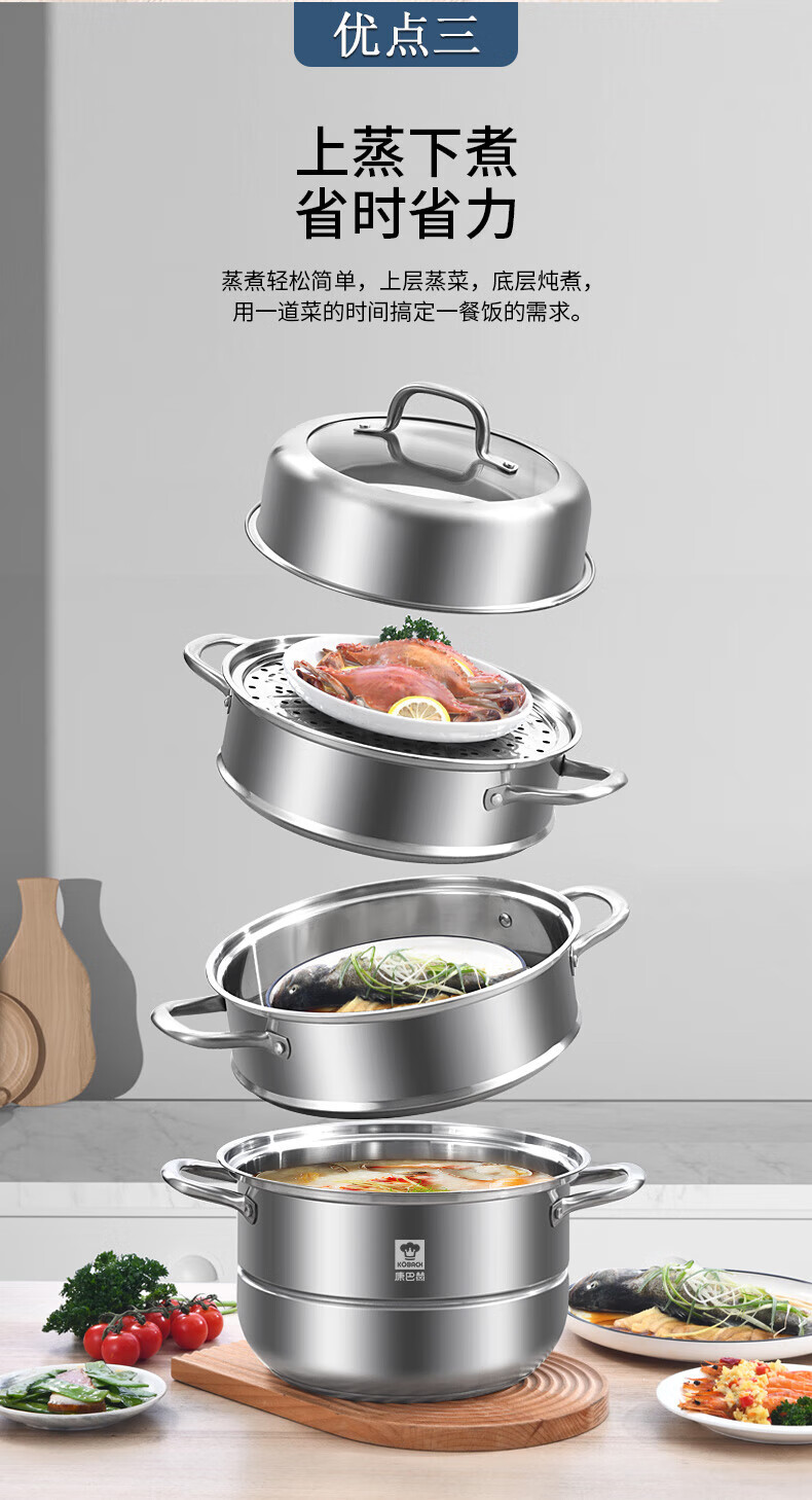 Konbach (KBH) steamer 304 stainless steel steamer double-layer composite bottom soup pot gas stove induction cooker universal flagship model high cover 2 layers 30cm