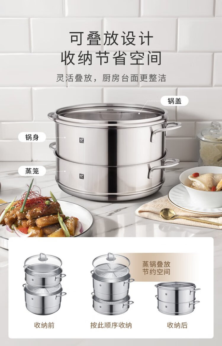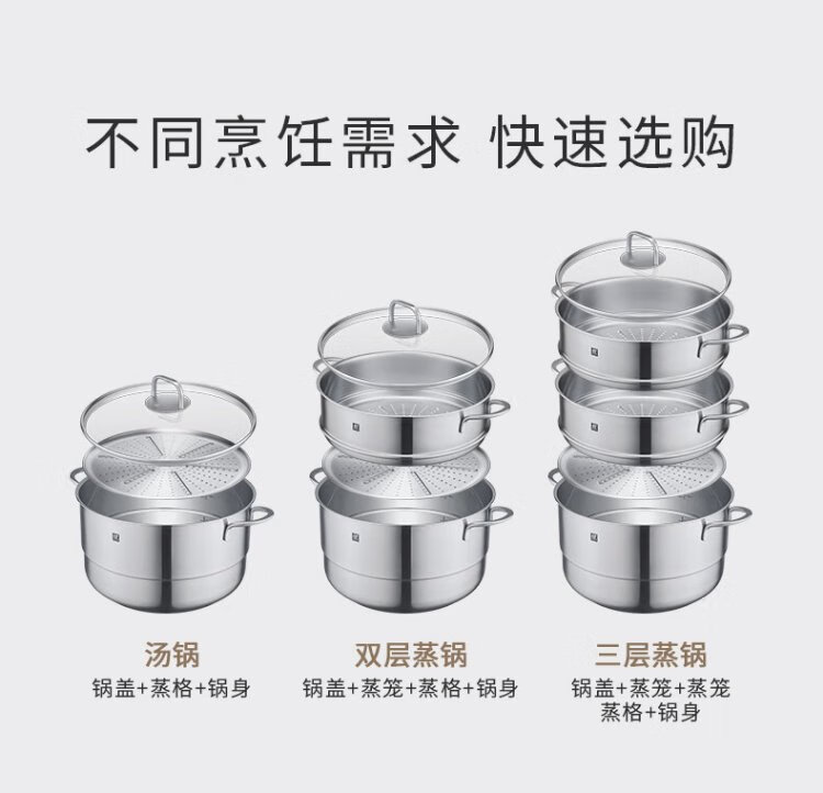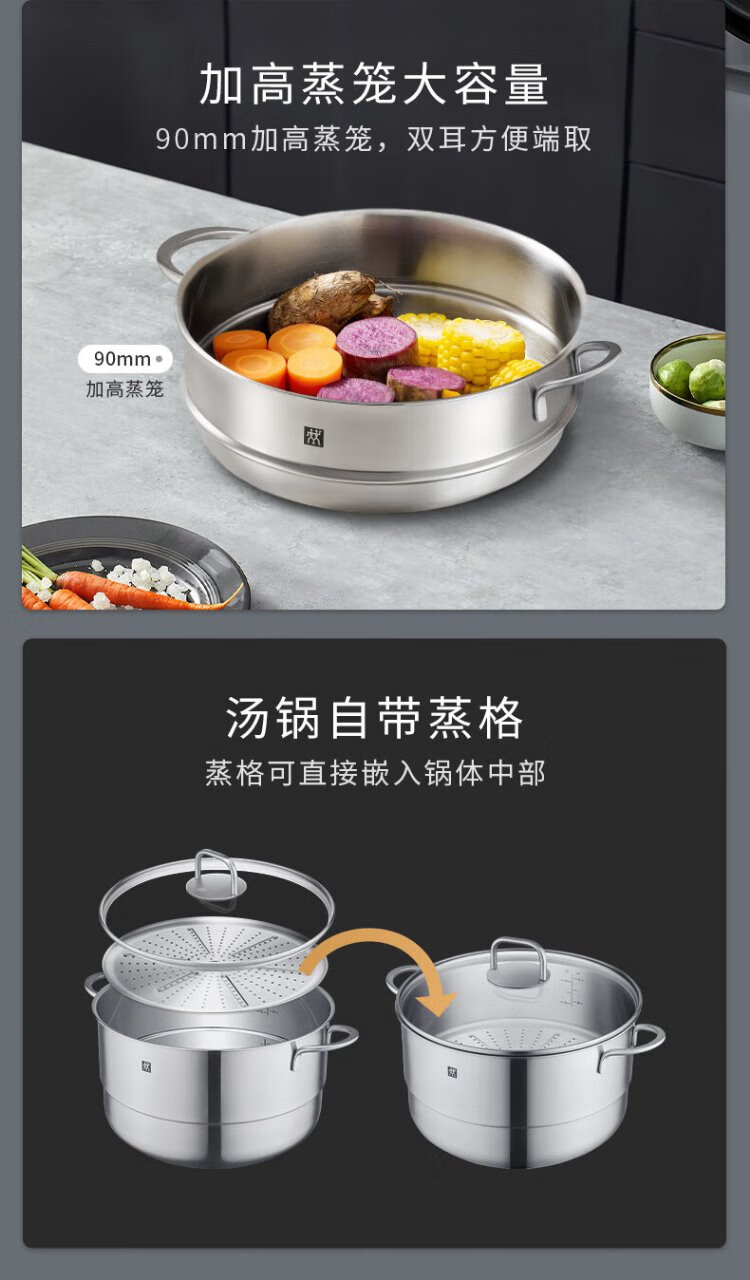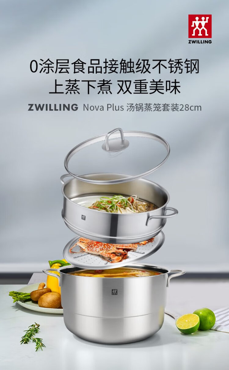 ZWILLING stainless steel soup pot, steamer, steamer, dual-purpose pot, fish pot, steamed bun set, universal gas induction cooker, including steam grid, soup pot + 2 steamers, 28cm