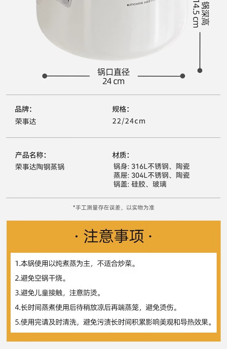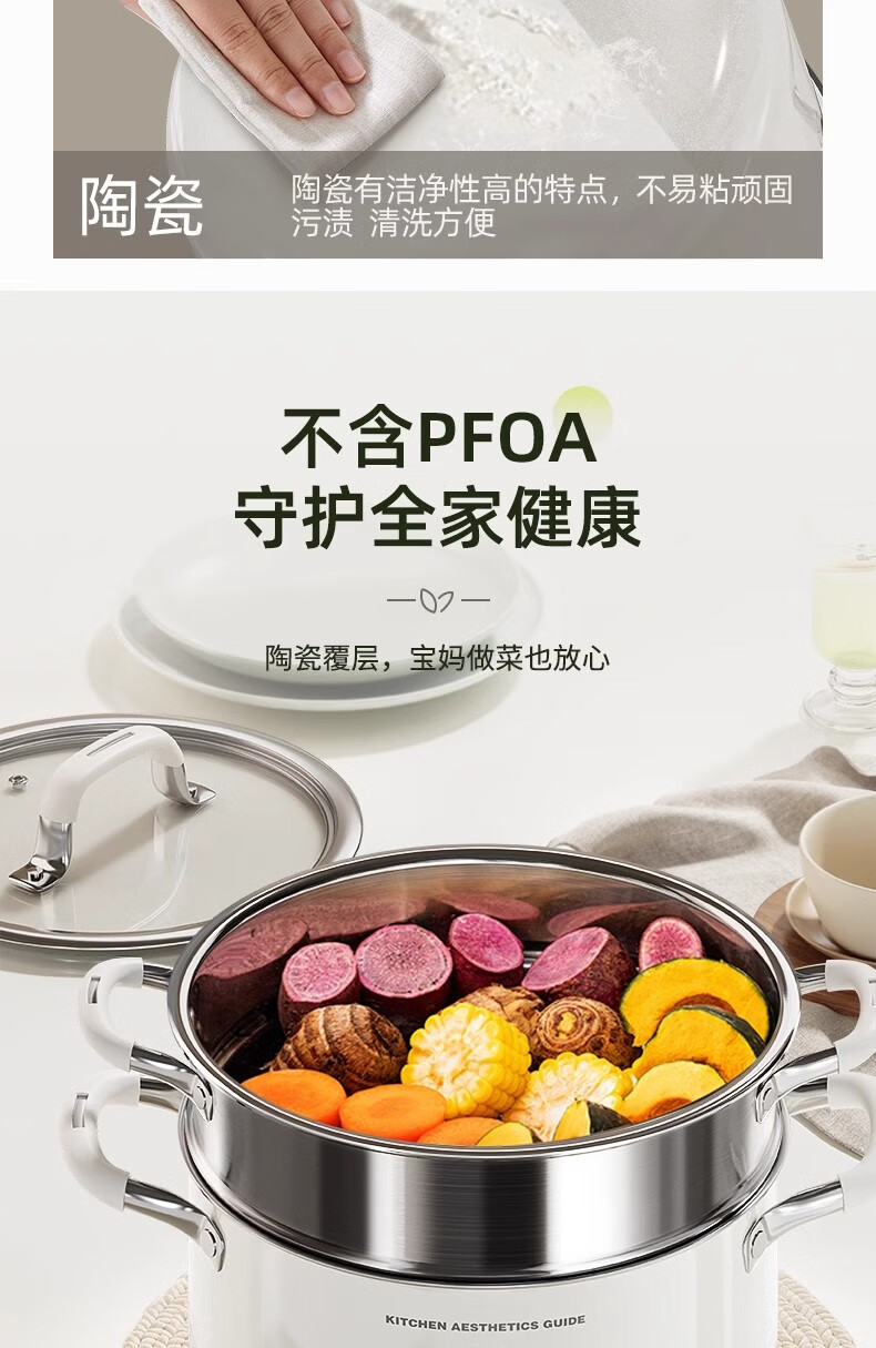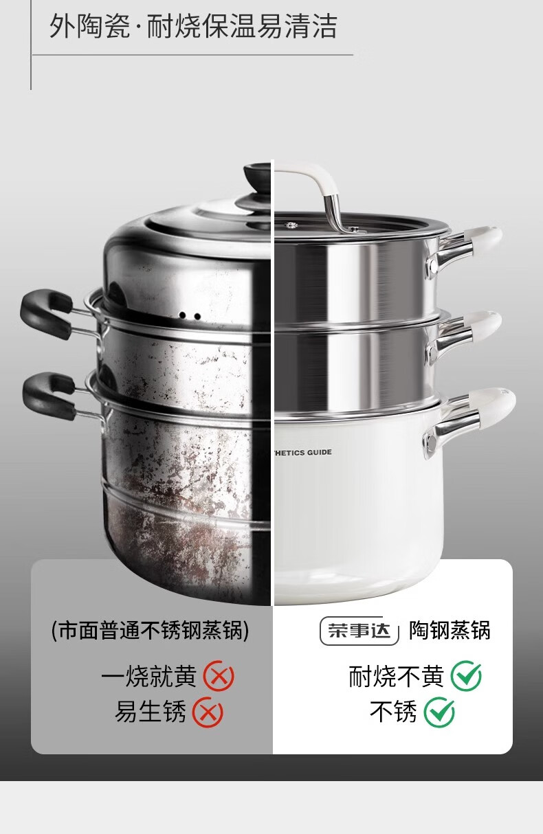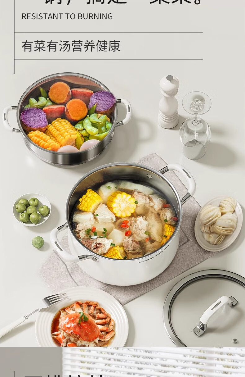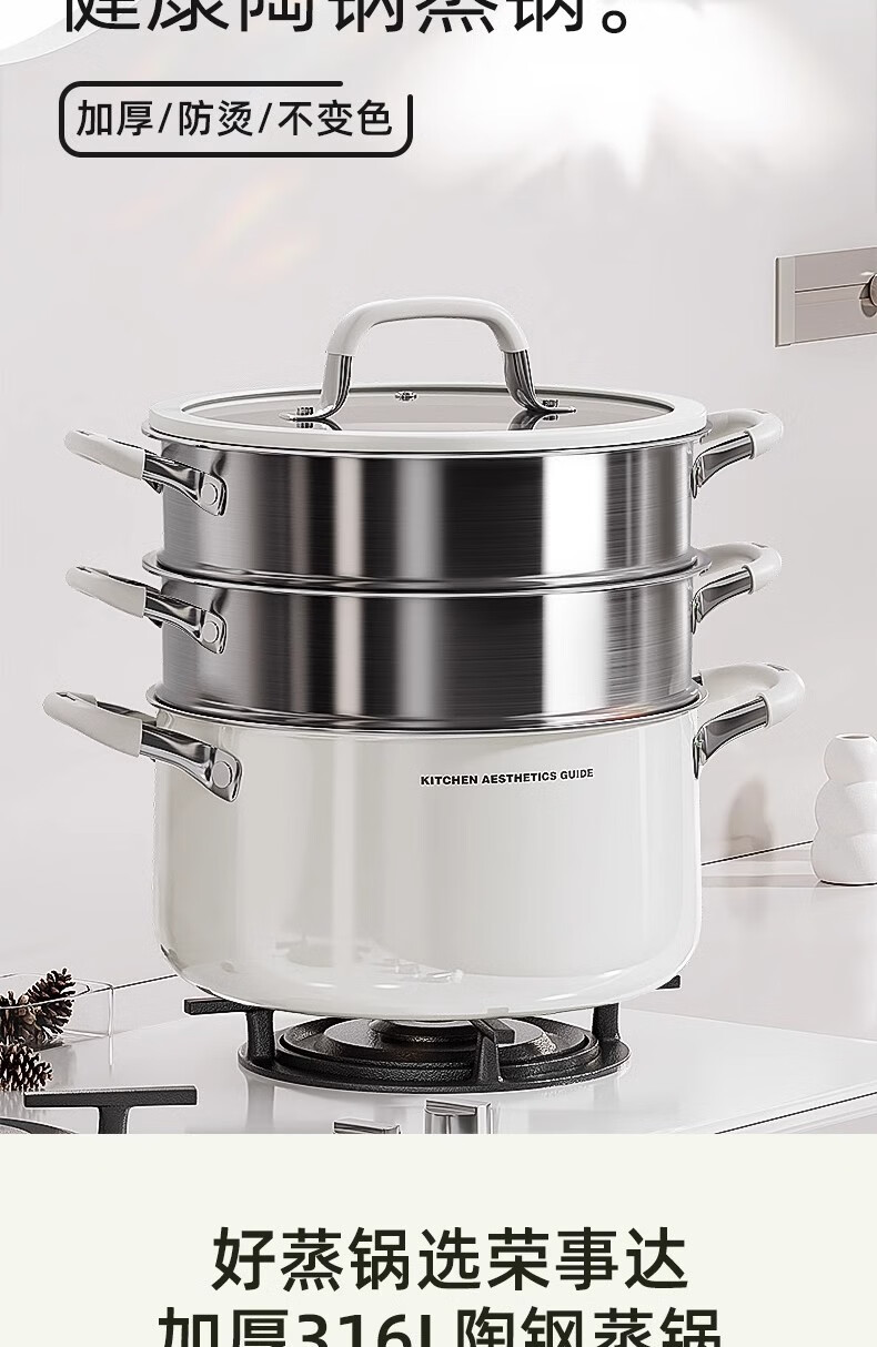 Royalstar thickened 316 stainless steel steamer uncoated food grade ceramic household special gas steaming stew pot thickened ceramic steel rust-proof and antibacterial double-layer 24cm 316L stainless steel
