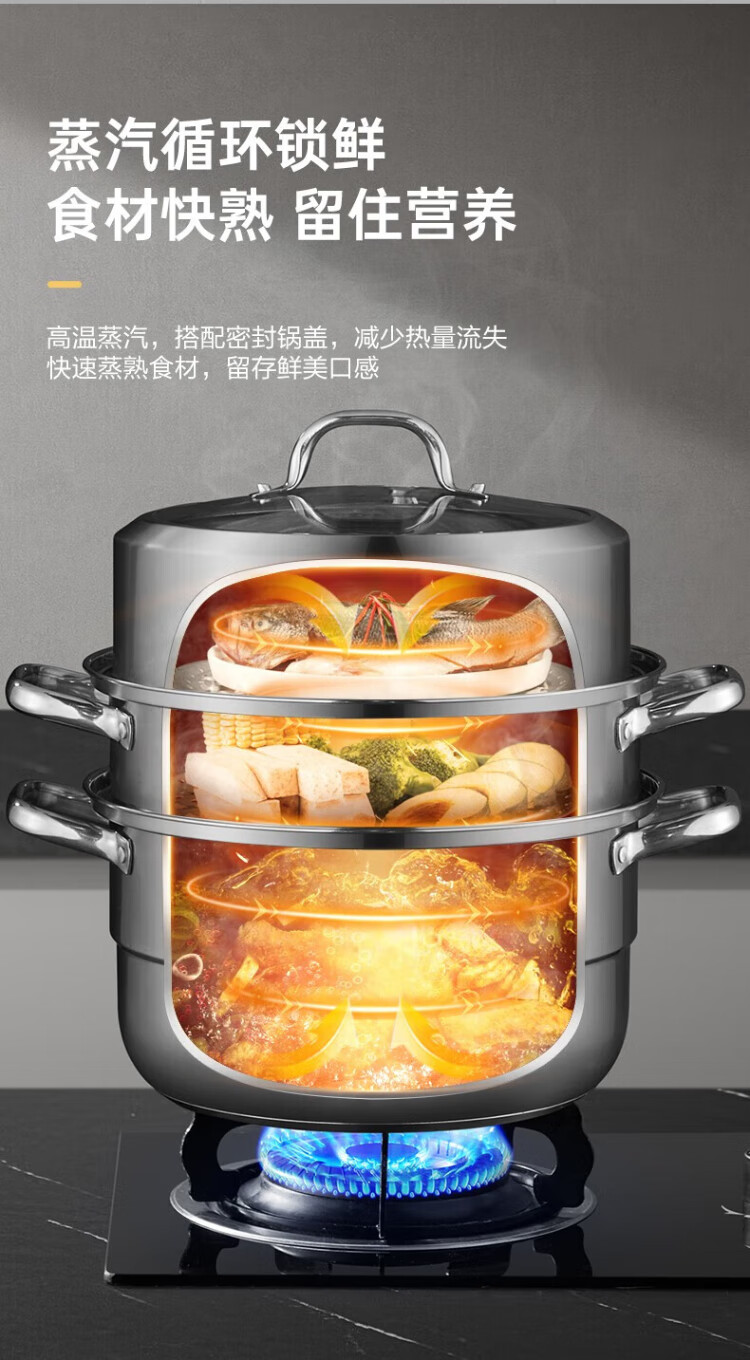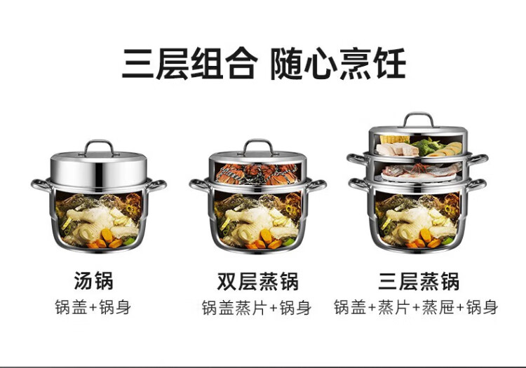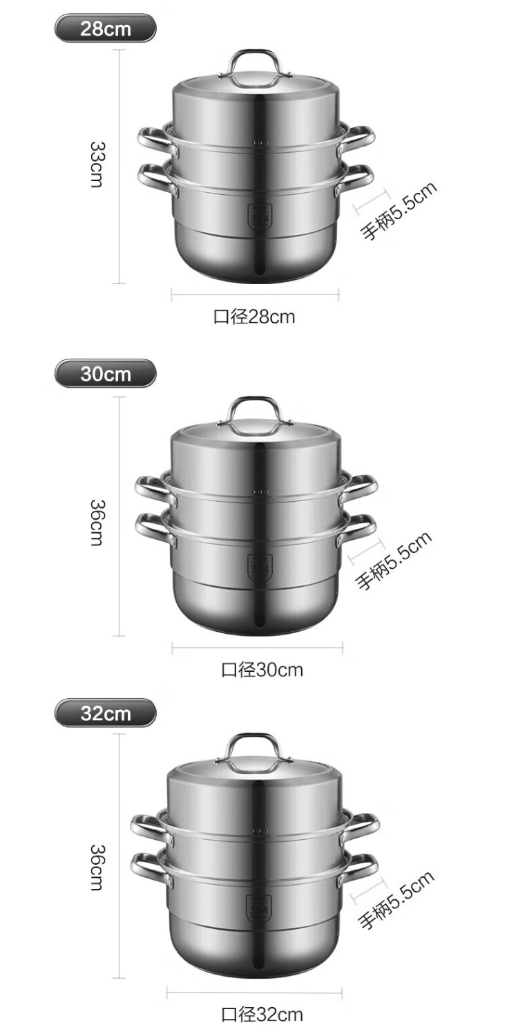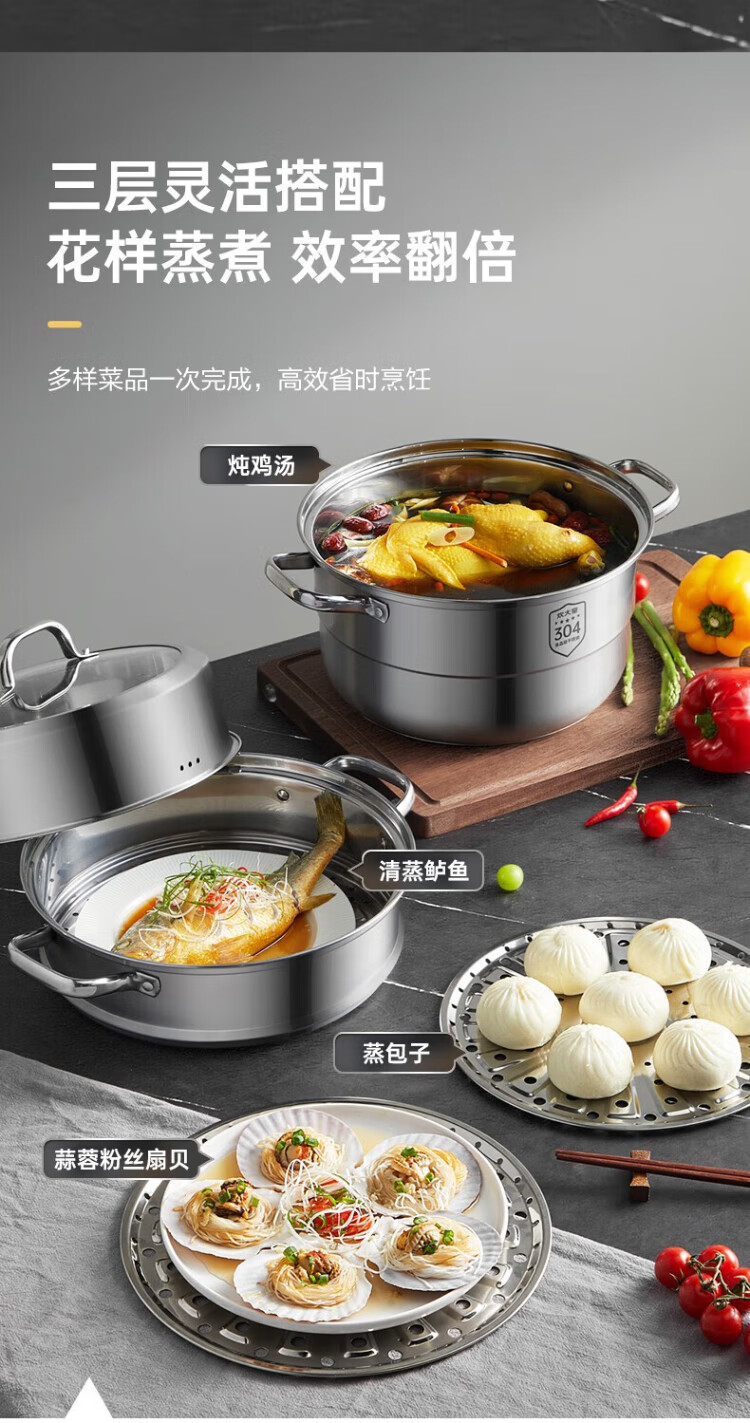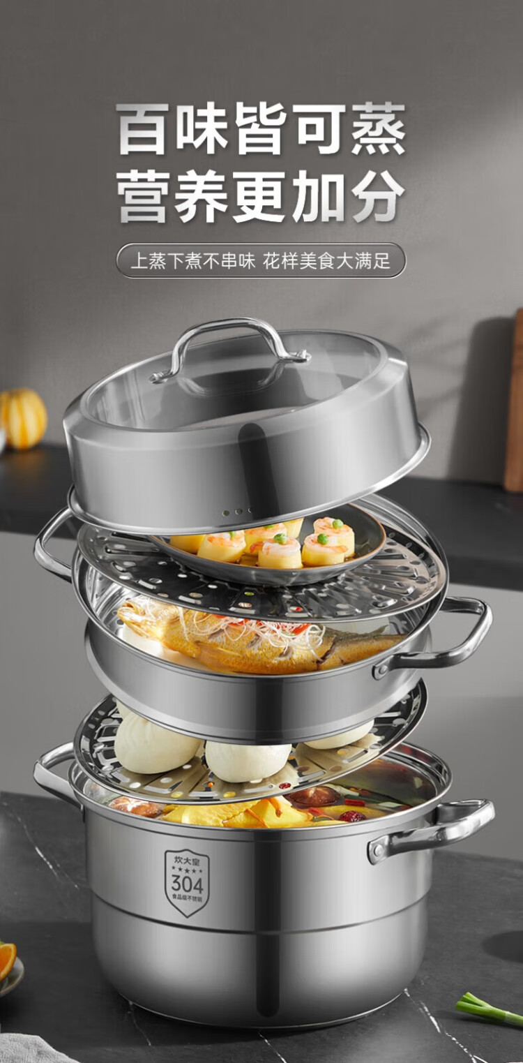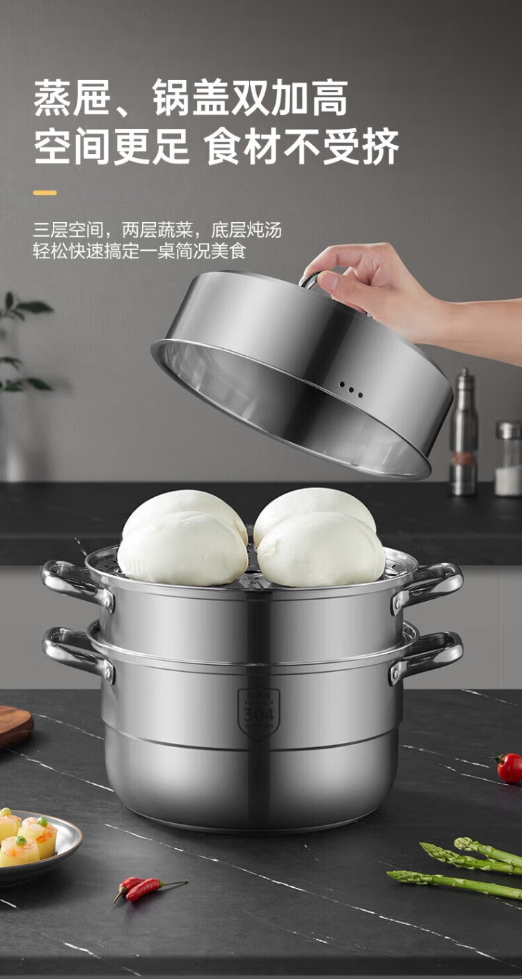 Cuidahuang 304 stainless steel three-layer steamer household composite bottom soup pot for steaming steamed buns and steamed buns with visible and erectable high arch lid 304 stainless steel three-layer steamer 30cm