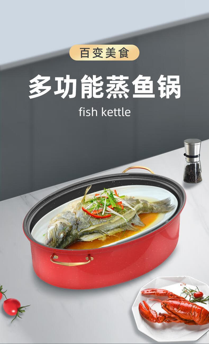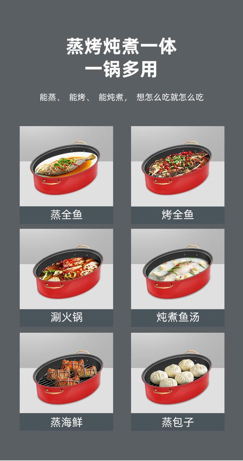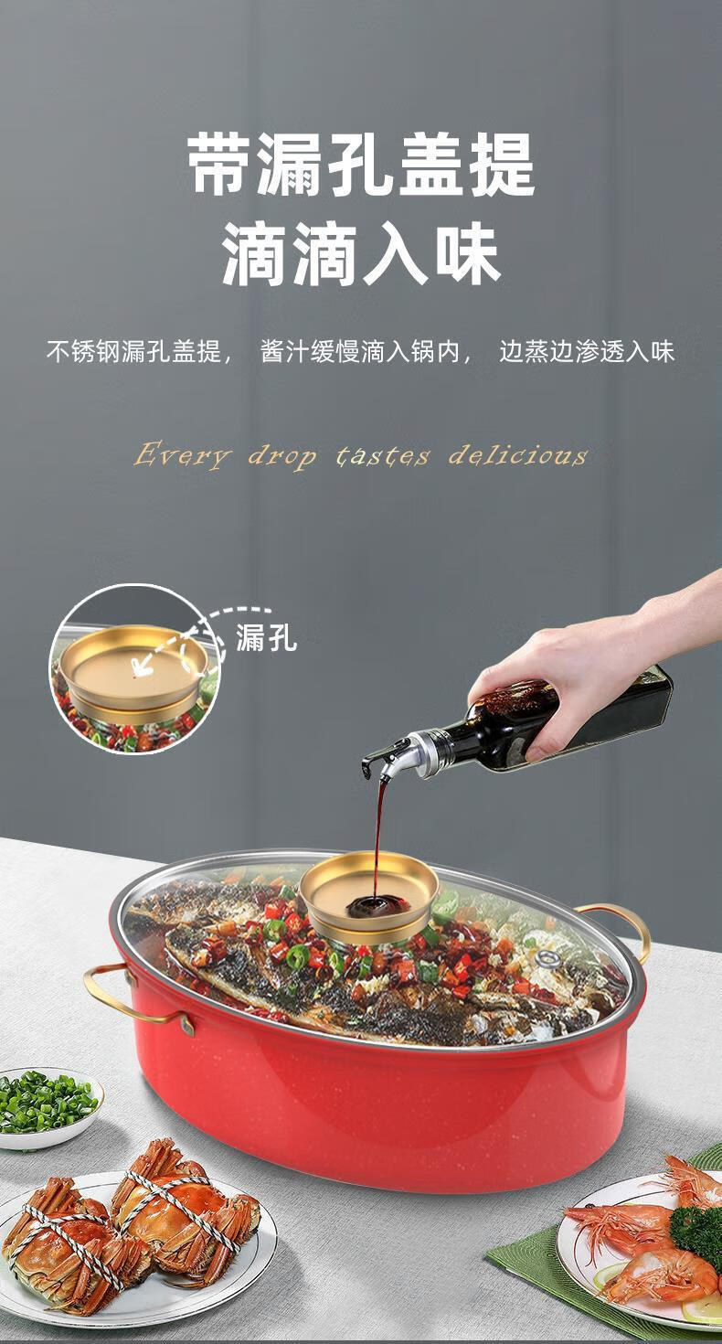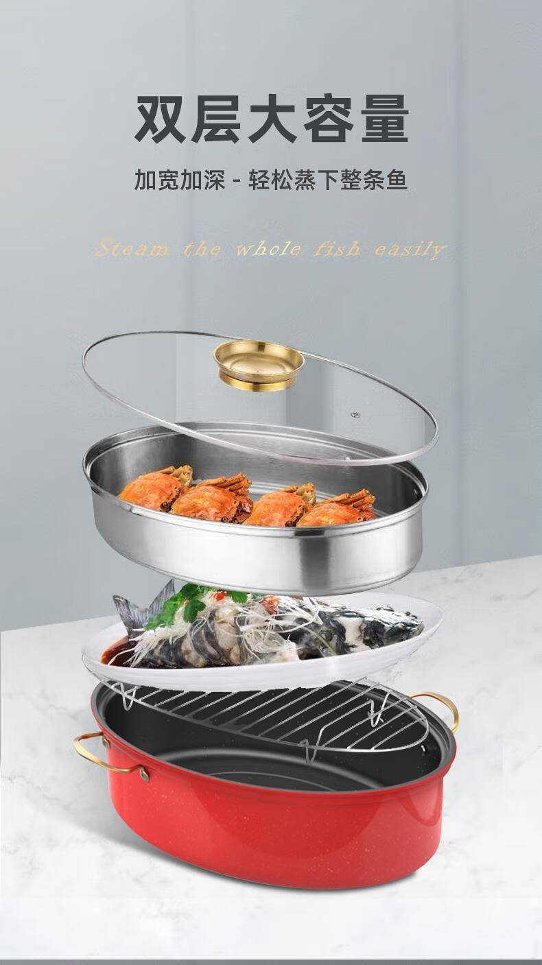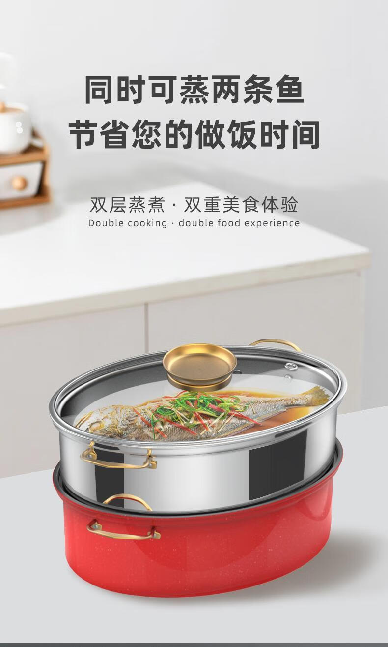 The same type of steaming fish pot, household oval medical stone multi-functional steamer, food-grade stainless steel leaky lid, Chinese red double-layered fish steaming pot (free three-piece set)