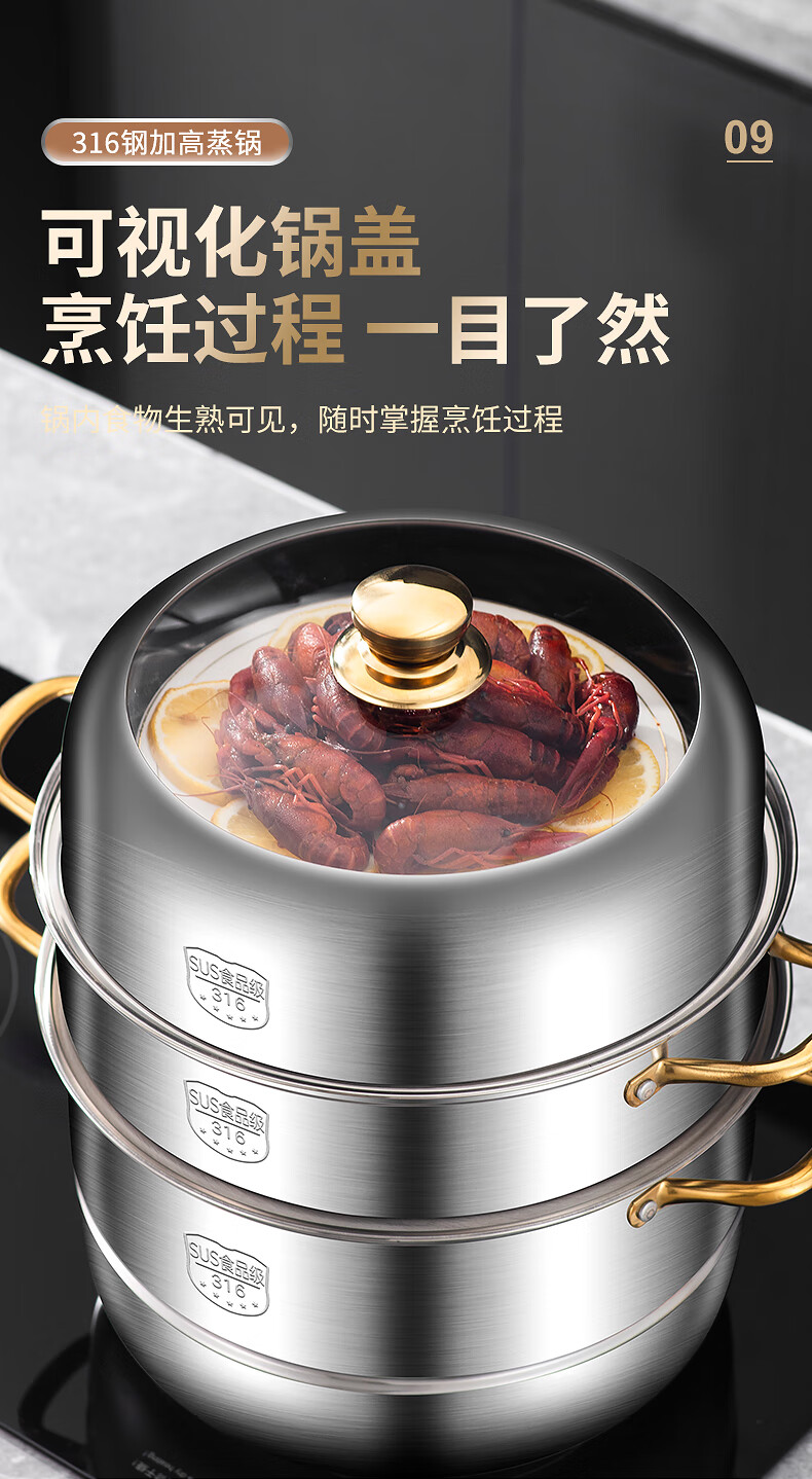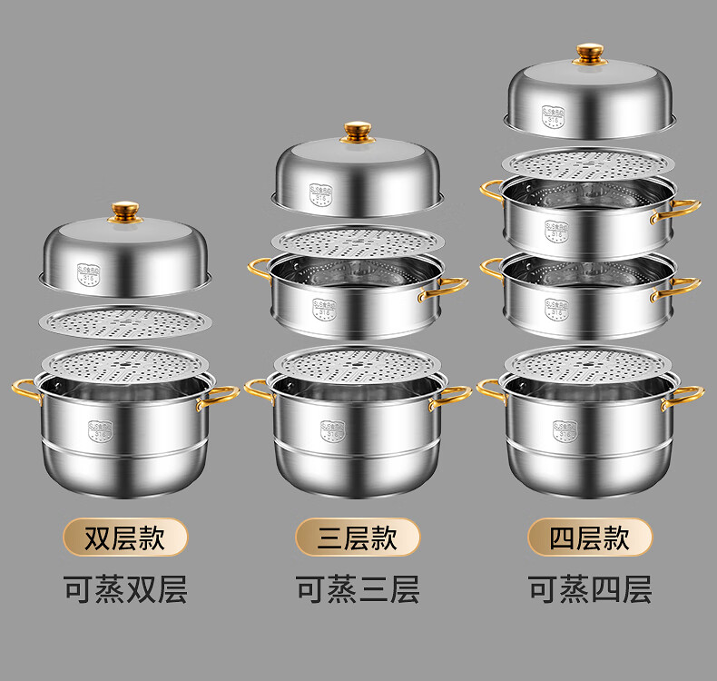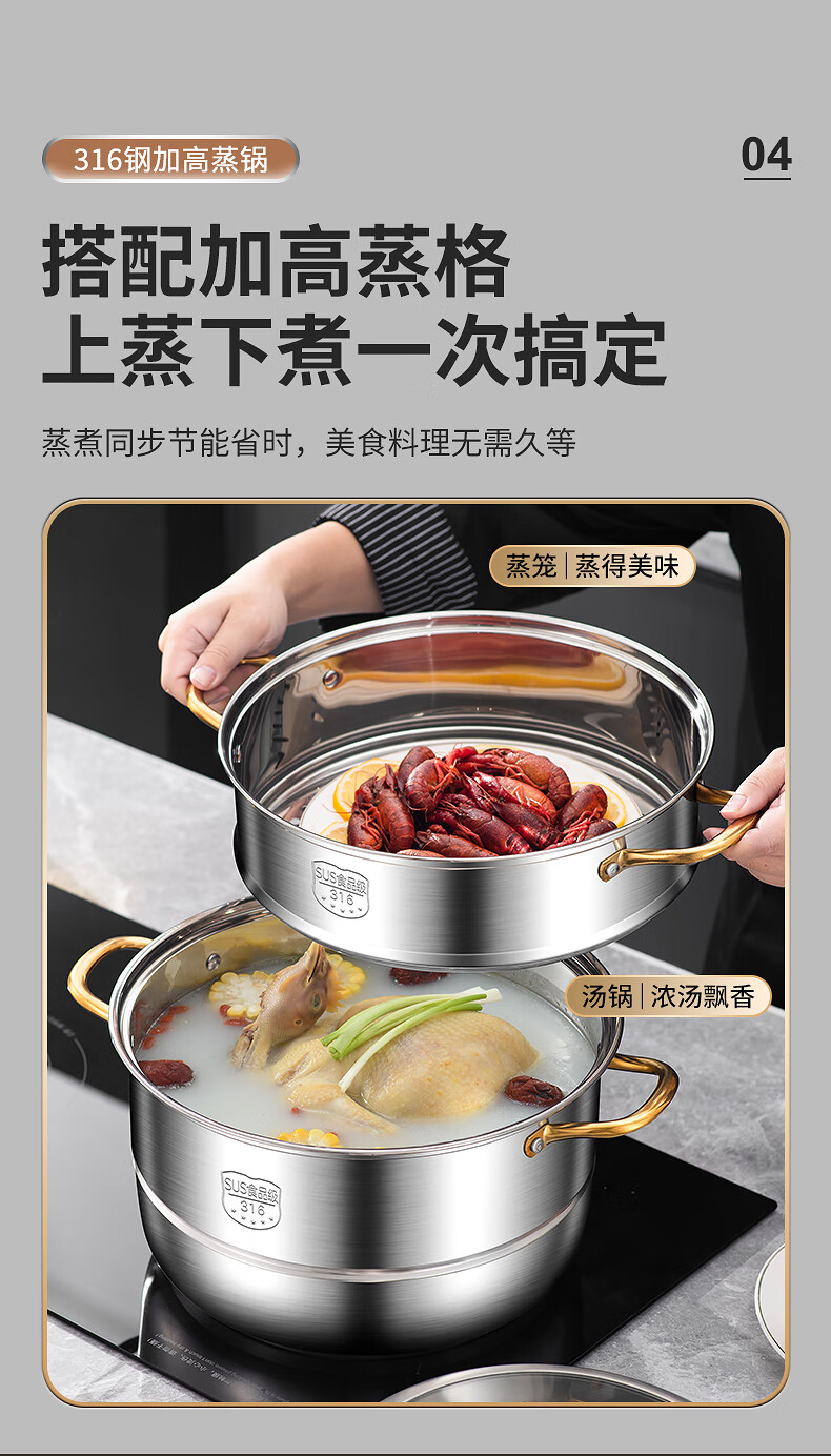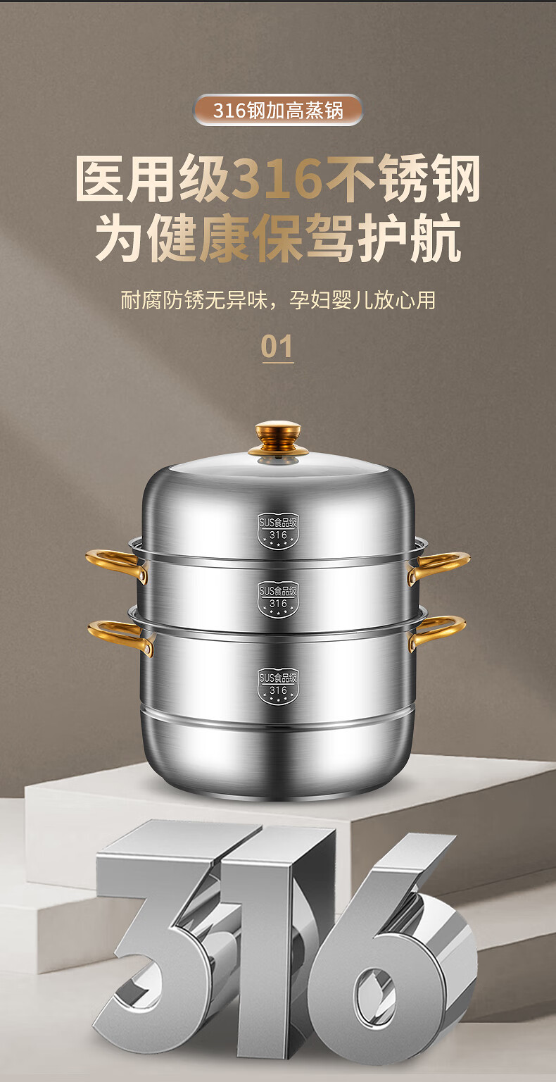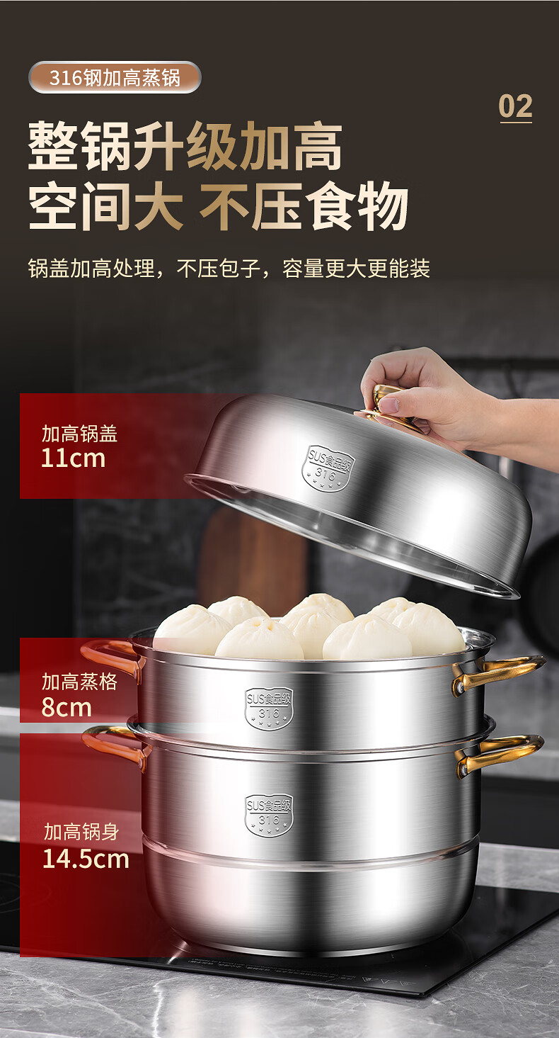 SUPOR steamer 316 stainless steel thickened household two-, three- and four-layer steamer for steaming steamed buns large-capacity induction cooker pot for gas 316 golden ear steamer two-layer 30cm extra thick flagship exclusive model + five-year warranty