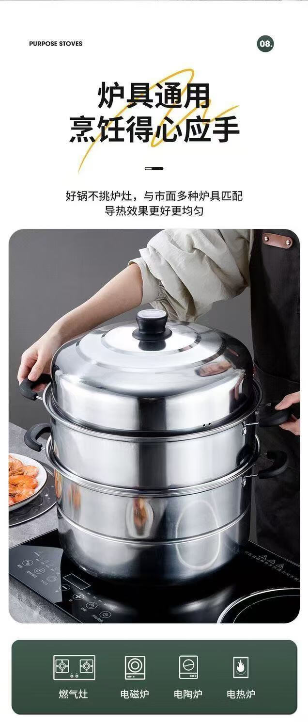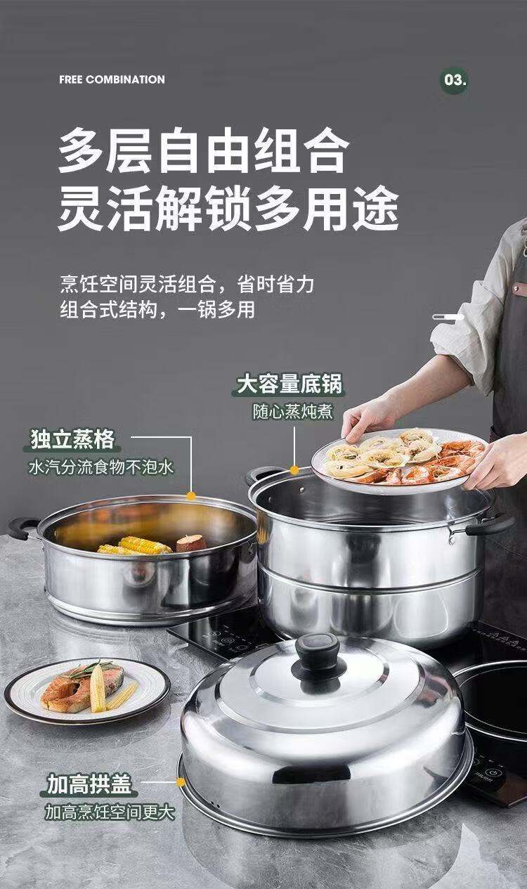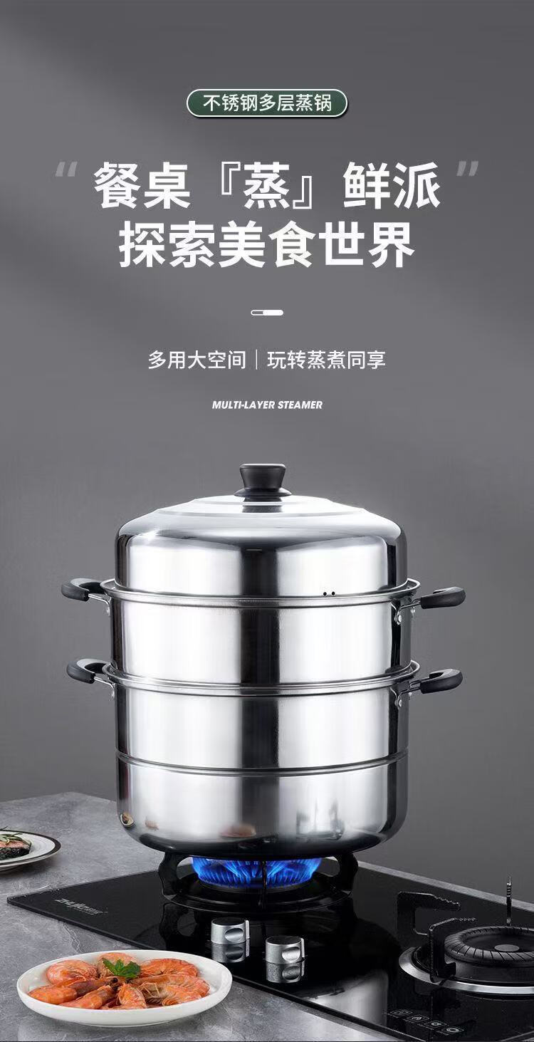 Thickened stainless steel double-layer steamer household two- and three-layer pot large soup pot steamed buns steamed fish pot induction cooker gas stove thickened version 3 layers 32cm