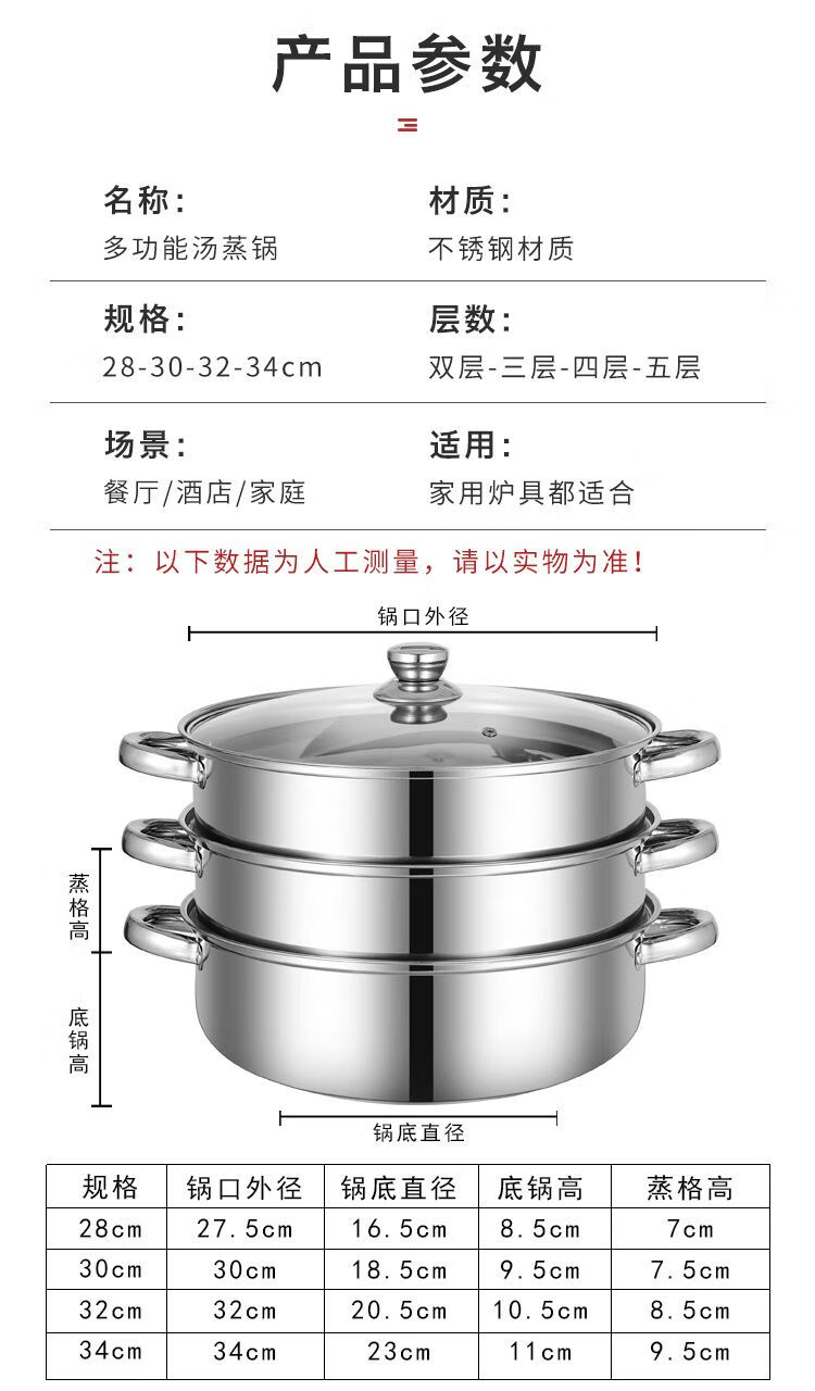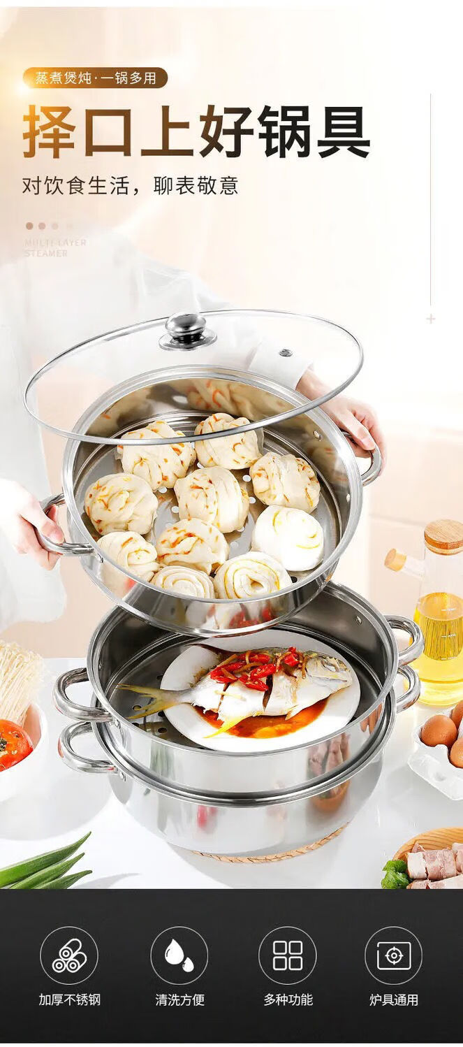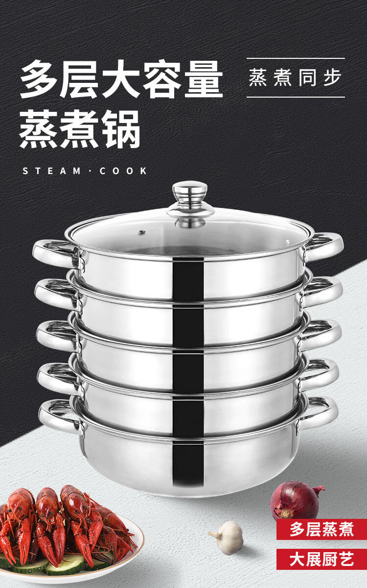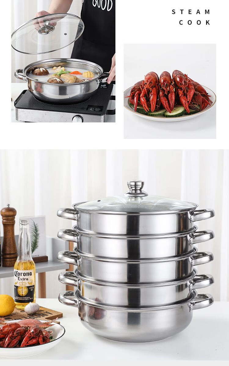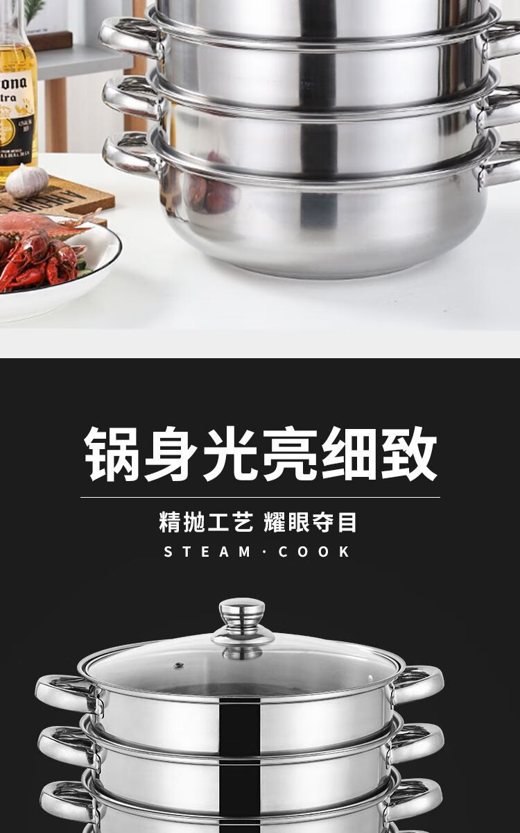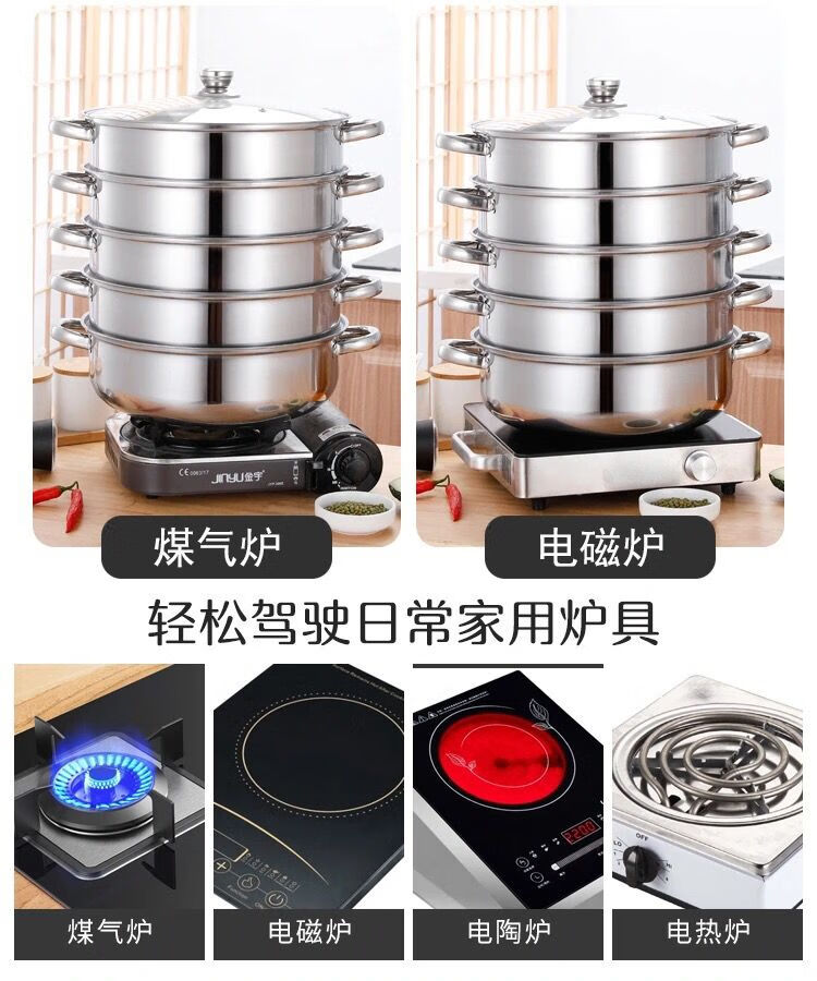 Hua Muxi thickened stainless steel steamer steamed buns soup pot hot pot two-layer three-layer multi-layer steamer induction cooker gas stove pot extra thick and deepened 34cm five layers 1 pot + 4 steamers free steaming cloth scouring pad