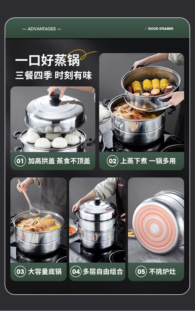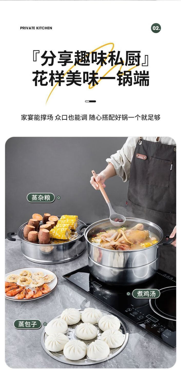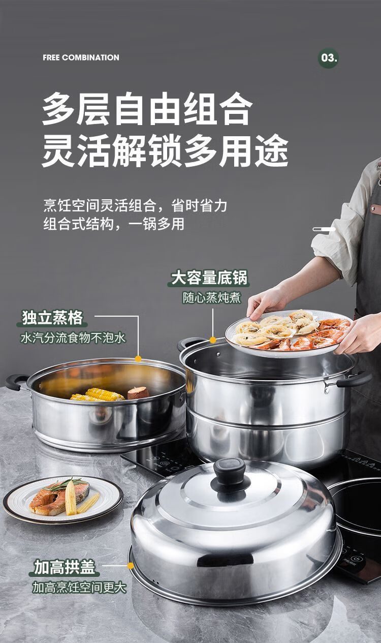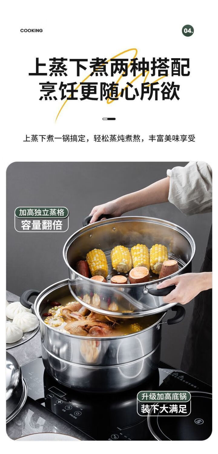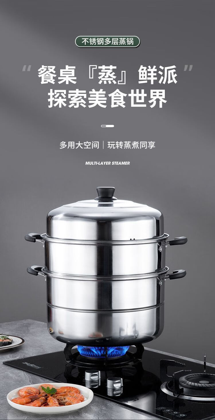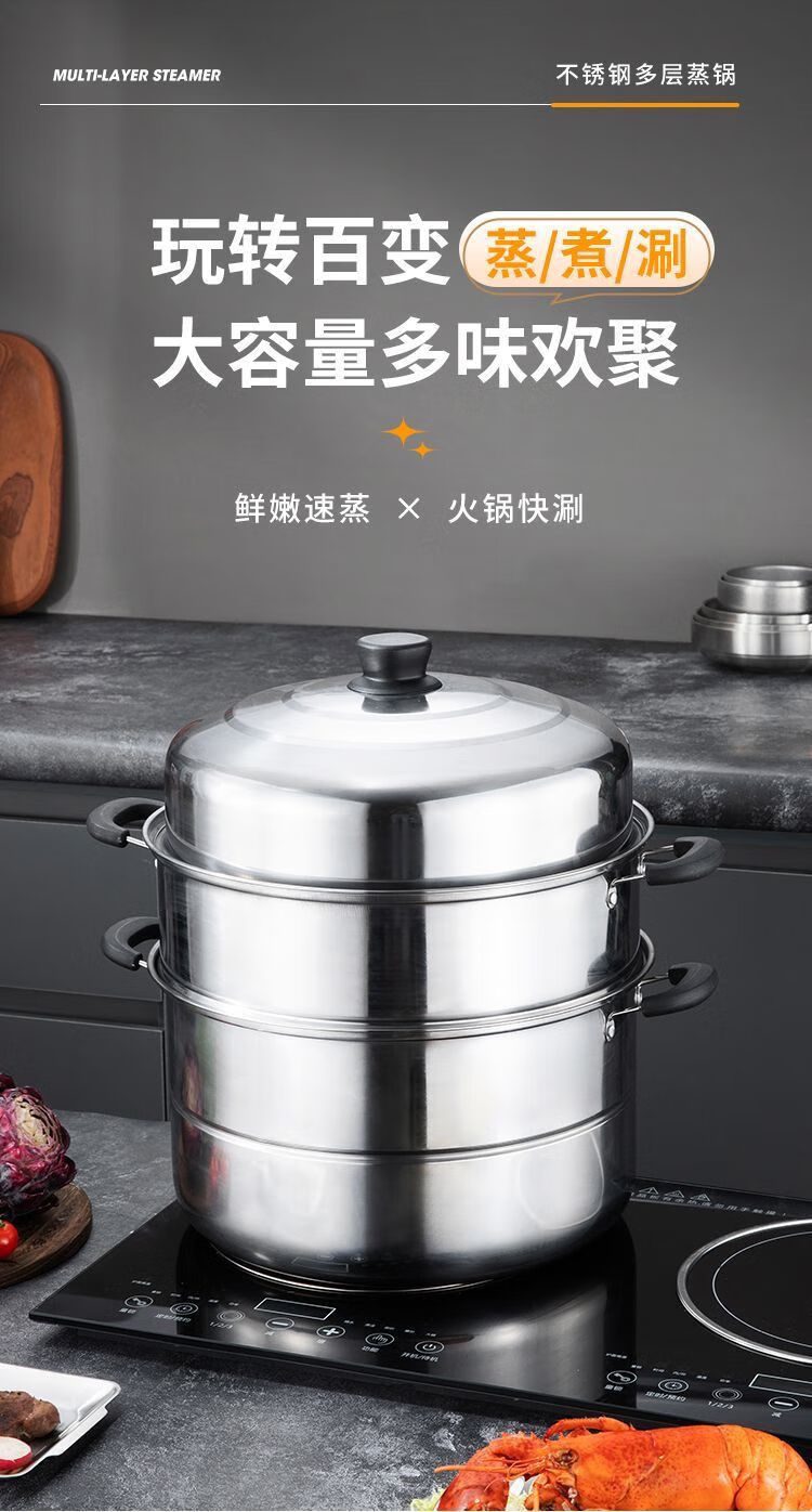 Thickened steamer stainless steel soup pot household two-layer three-layer multi-layer steamer hot pot induction cooker open flame universal pot silver 2 layers 26cm