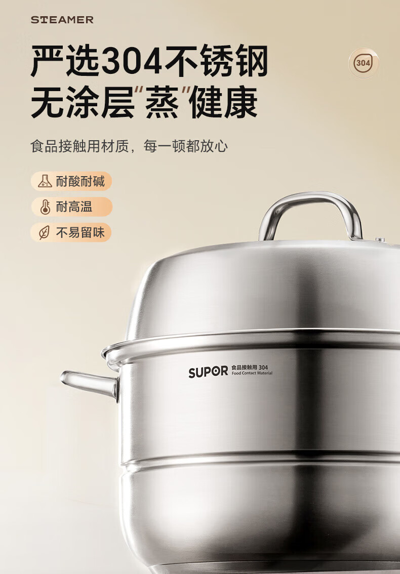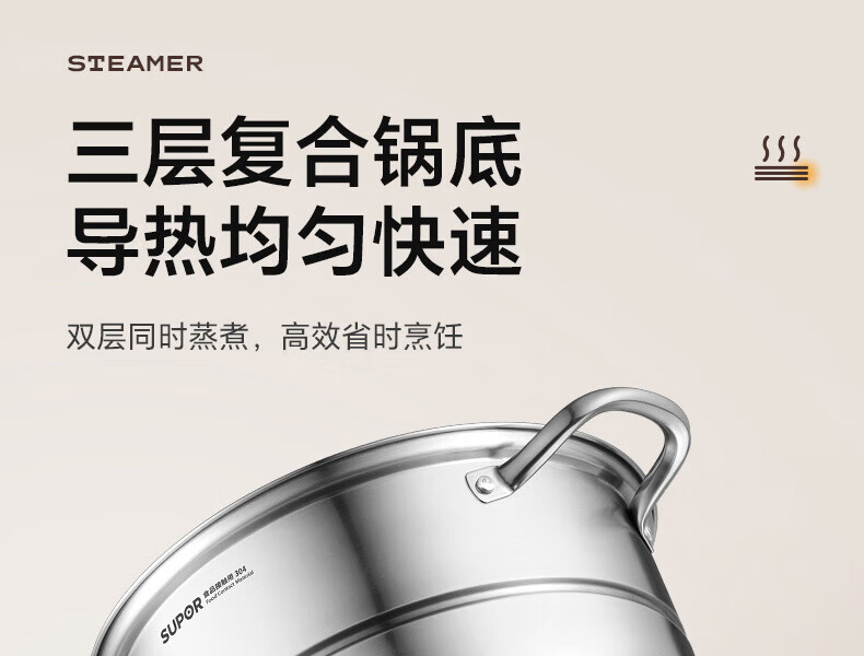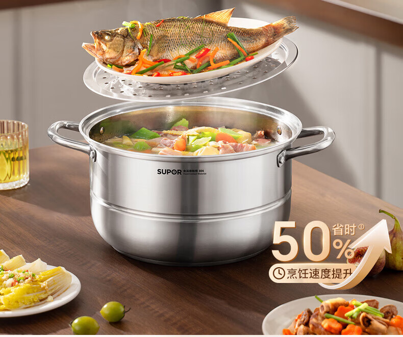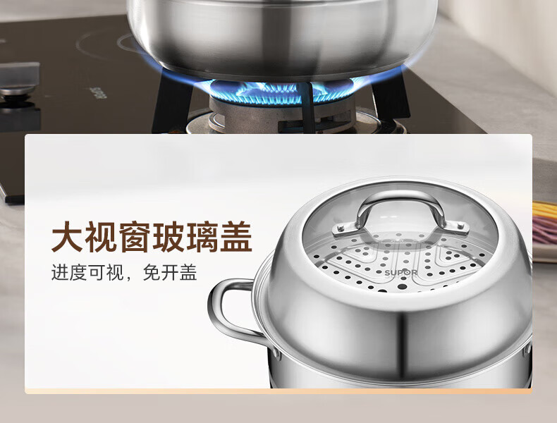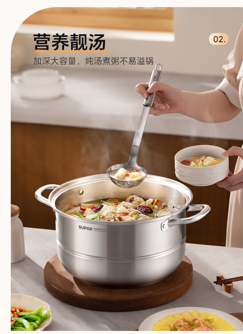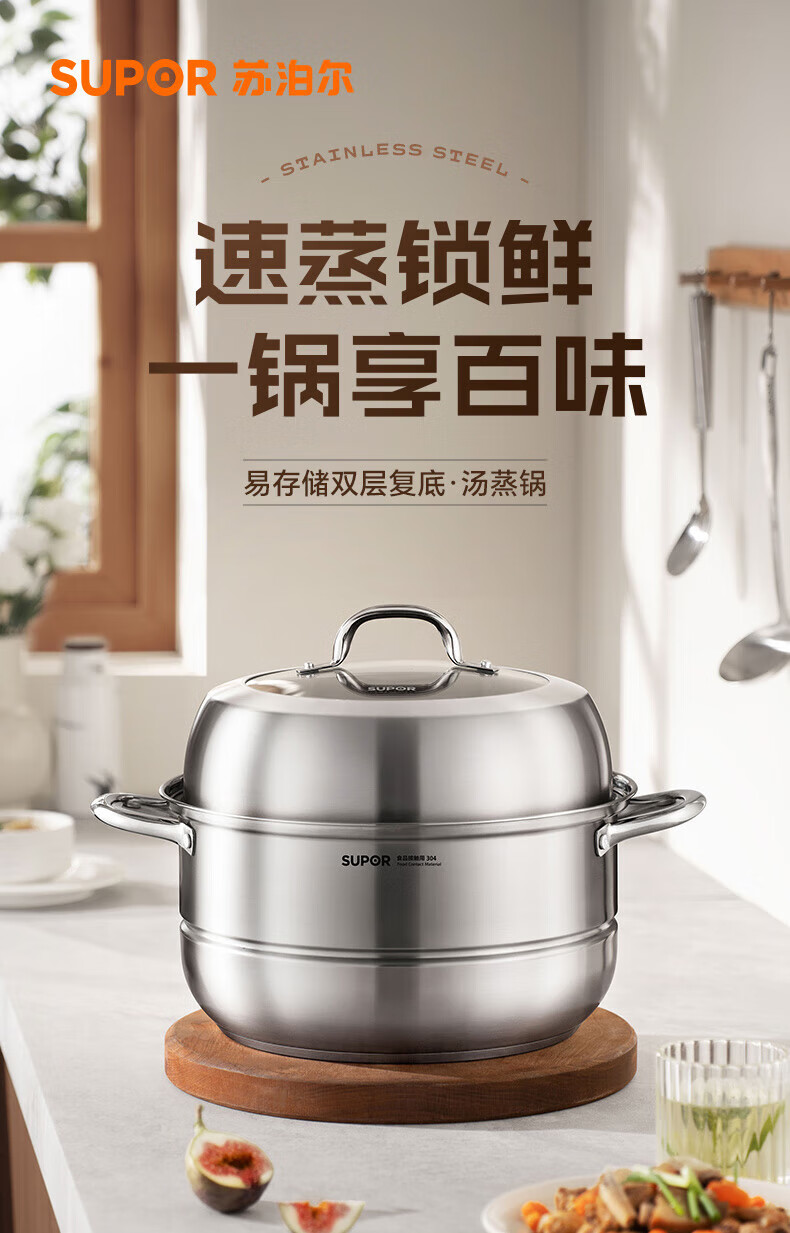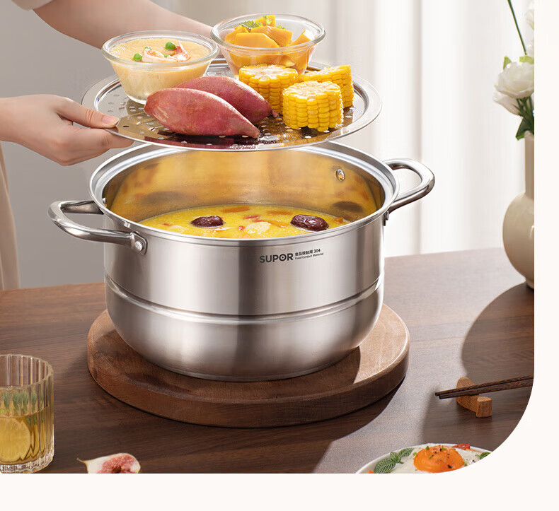 Supor uncoated 304 stainless steel steamer household double-layer large-capacity stew and steam integrated three-layer composite bottom gas stove three-layer large capacity 304 stainless steel 30cm