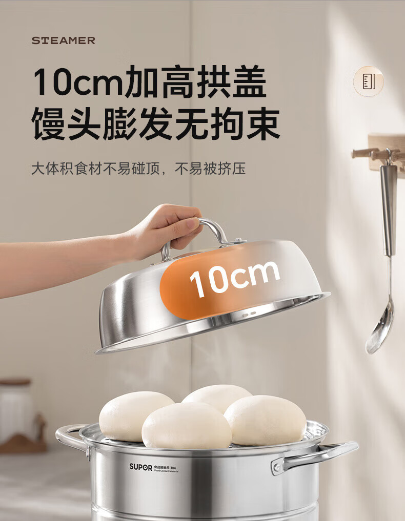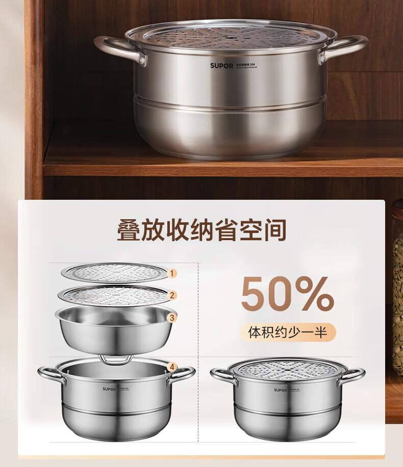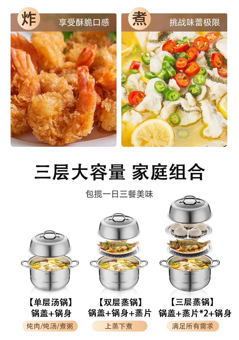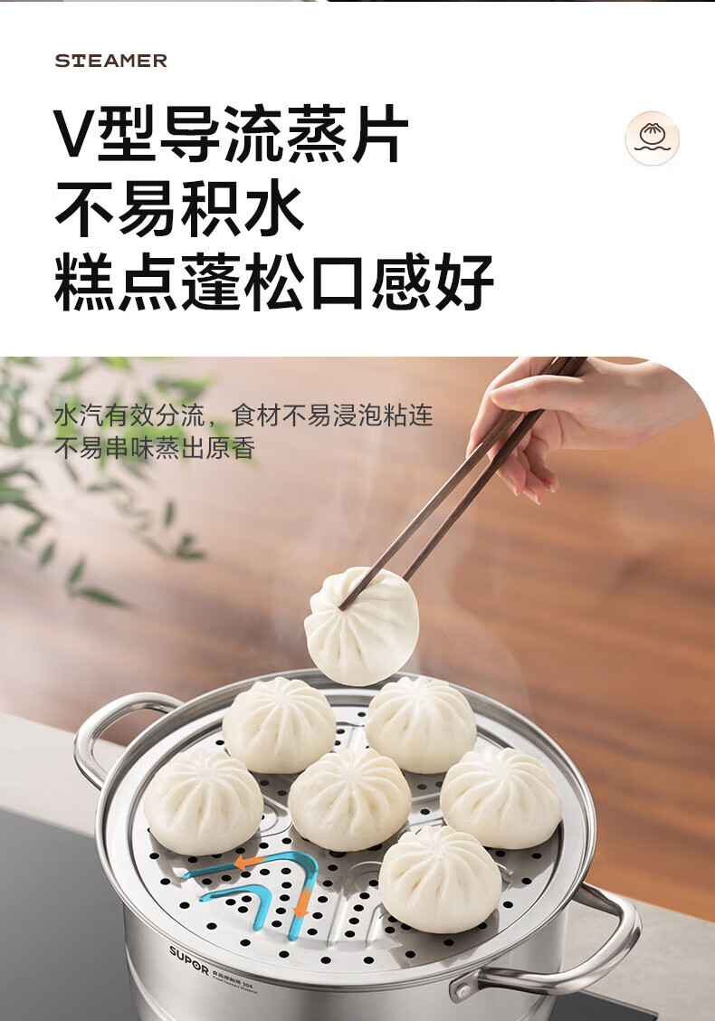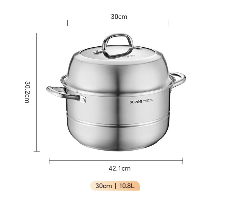 Supor uncoated 304 stainless steel steamer household double-layer large-capacity stew and steam integrated three-layer composite bottom gas stove three-layer large capacity 304 stainless steel 30cm