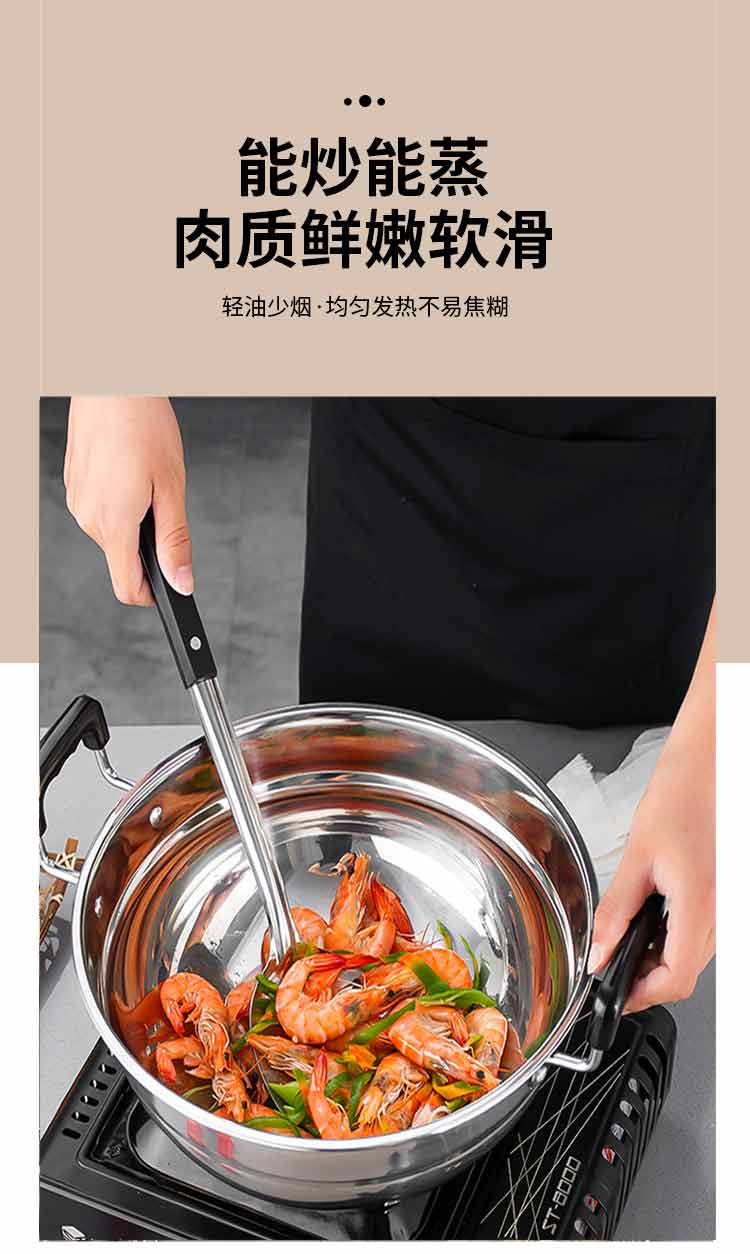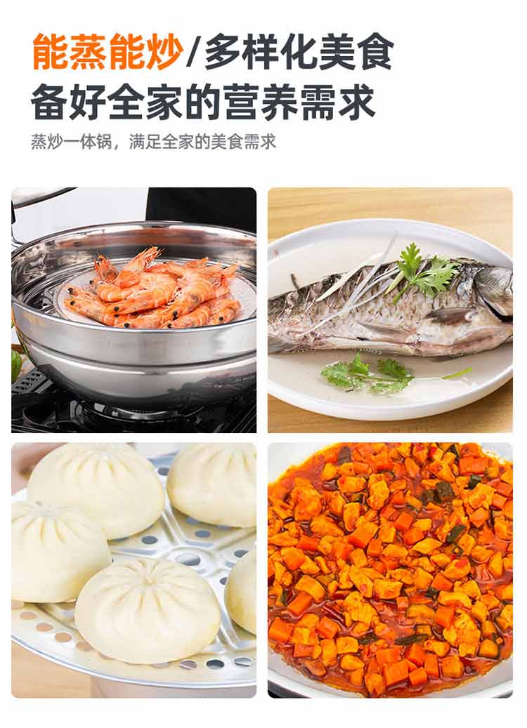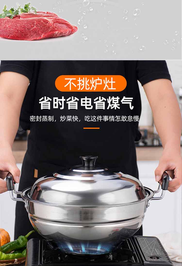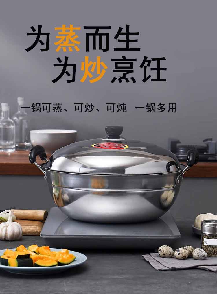 304 stainless steel double-eared wok, steaming and cooking integrated pot, stew and wok, household steamer multi-function, round bottom + steaming sheet + lid 32cm stainless steel steamer