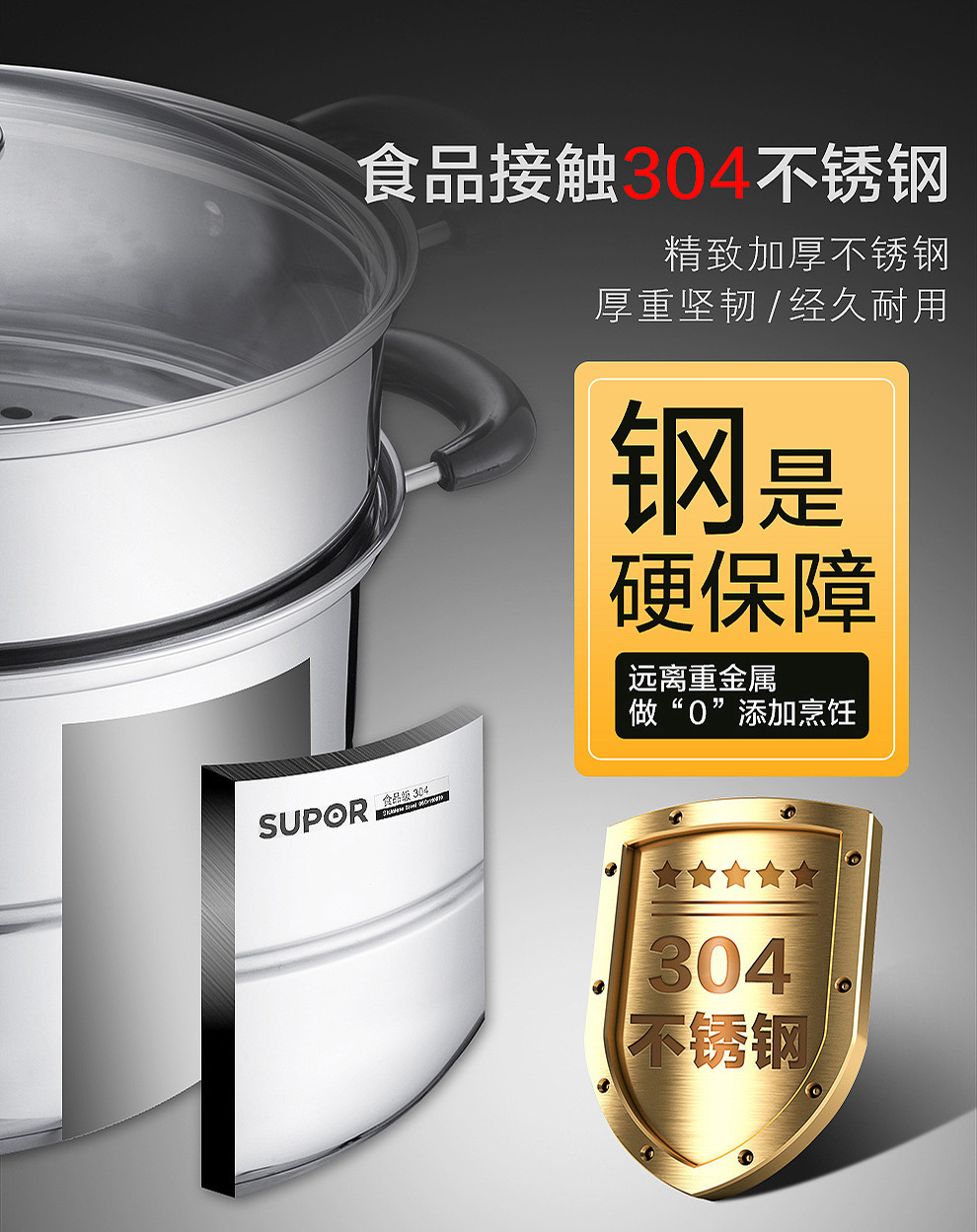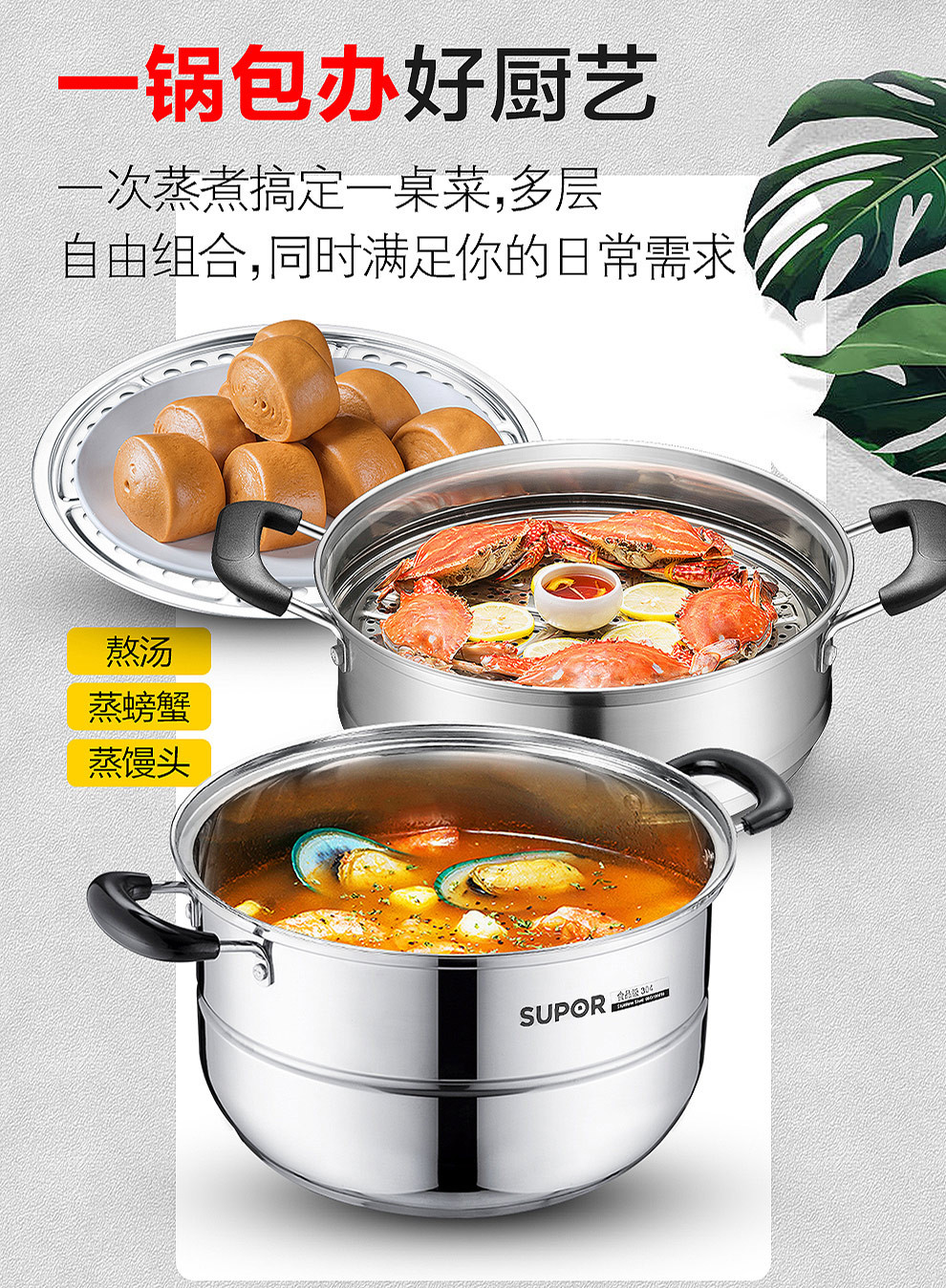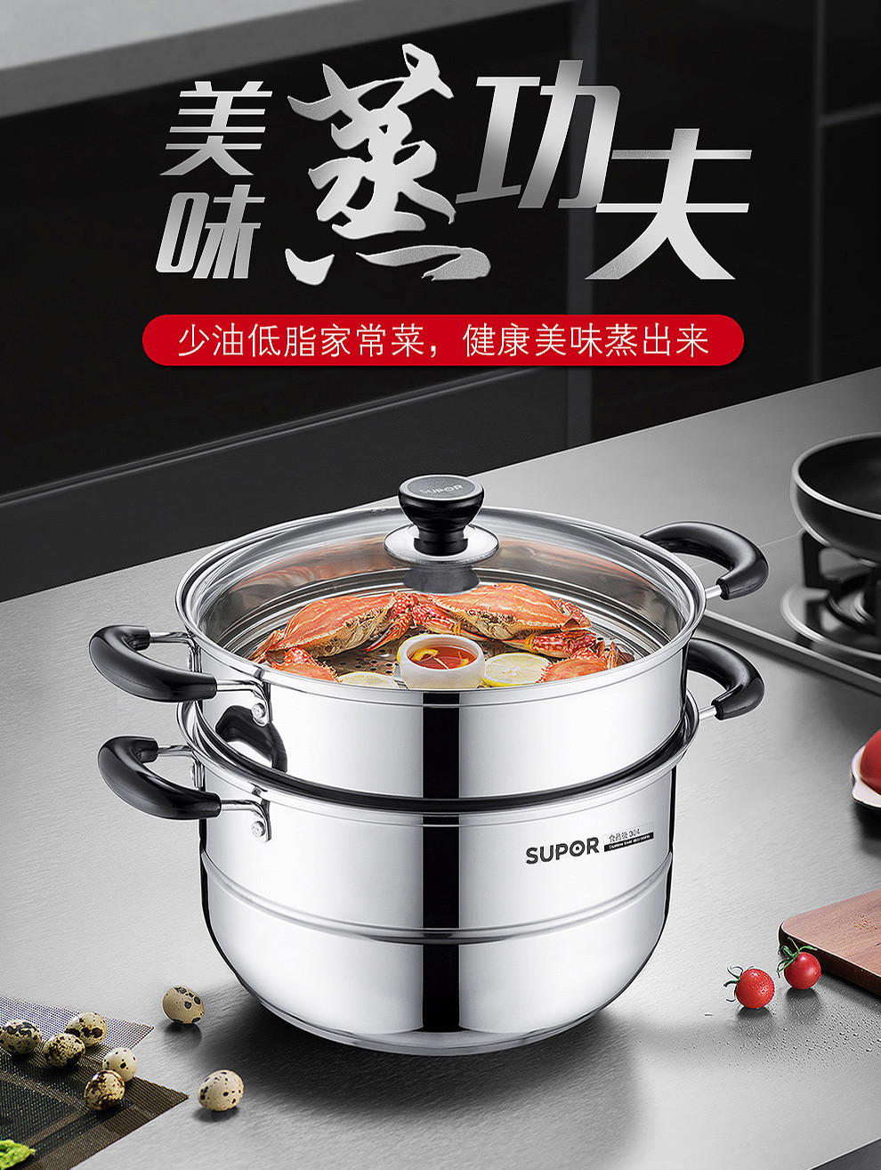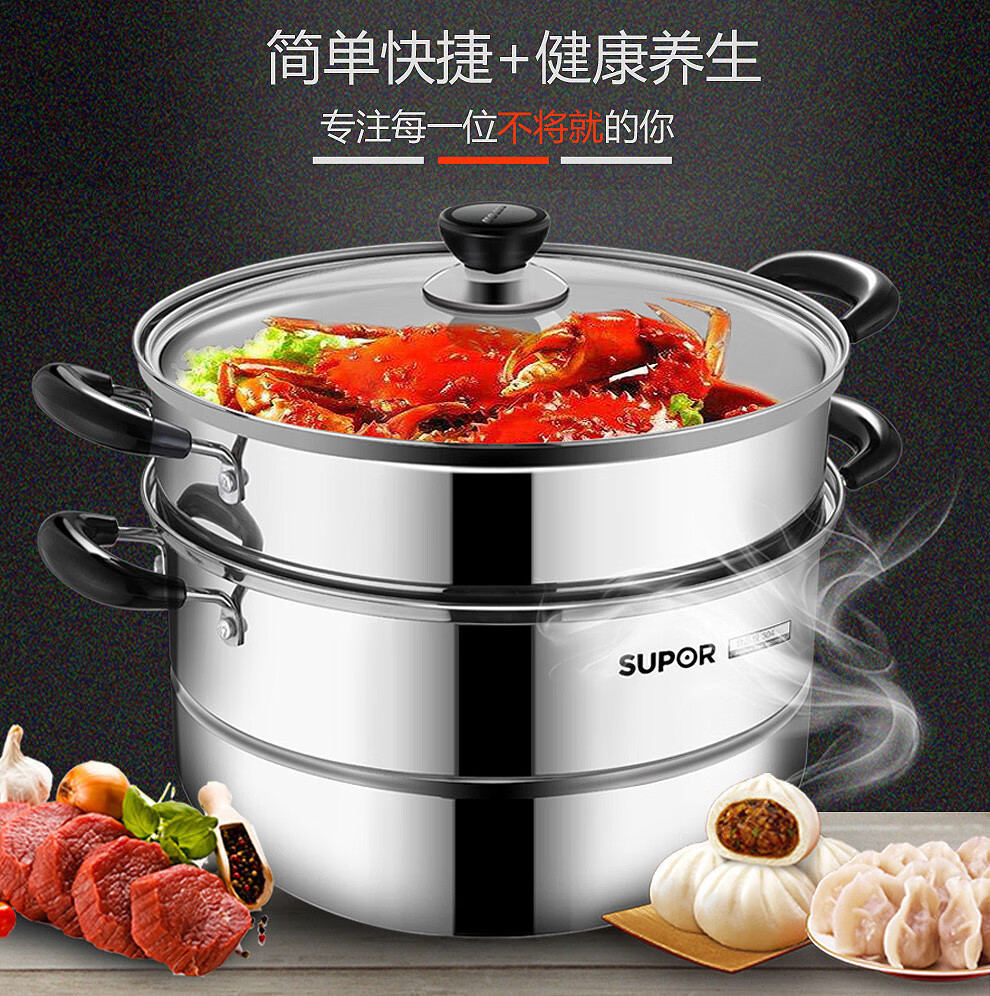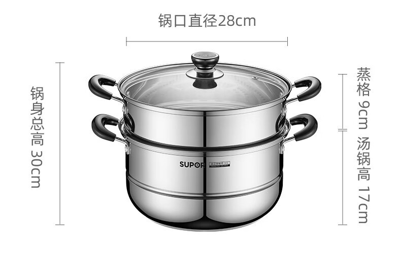 SUPOR steamer, two-layer, 28cm double-bottom thickened 304 stainless steel steamer, suitable for both induction and gas stoves