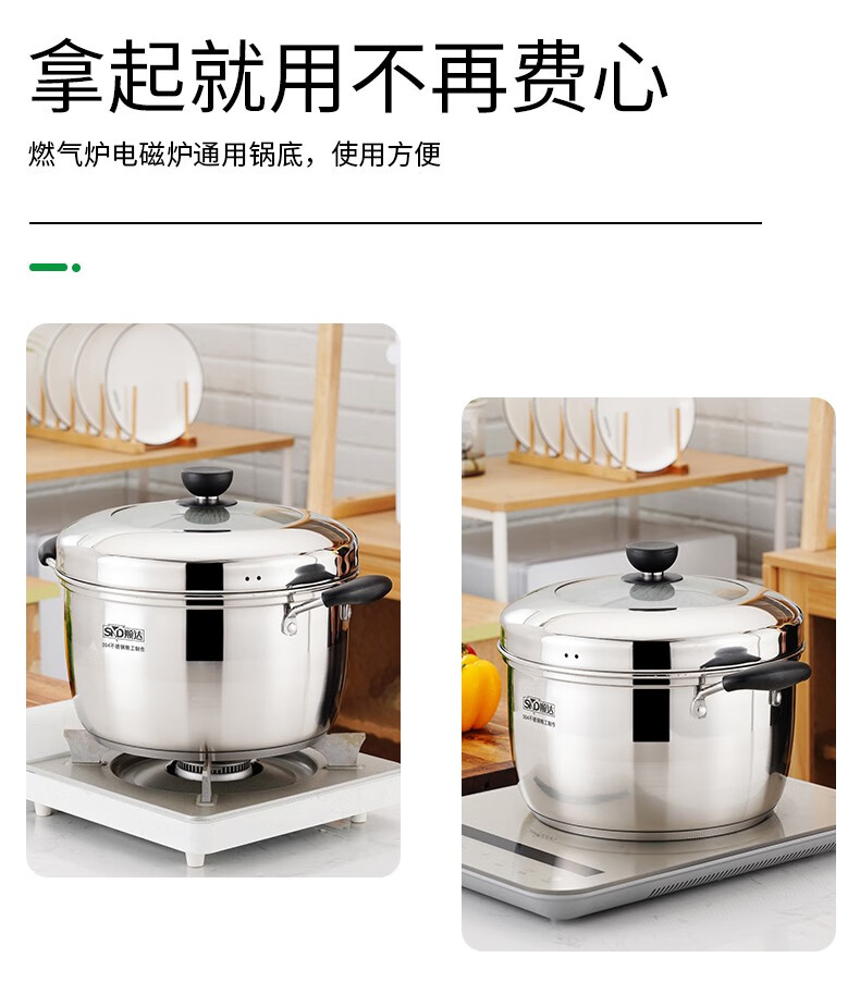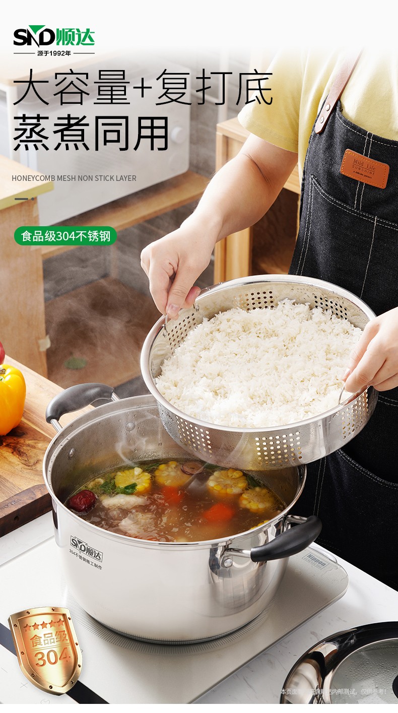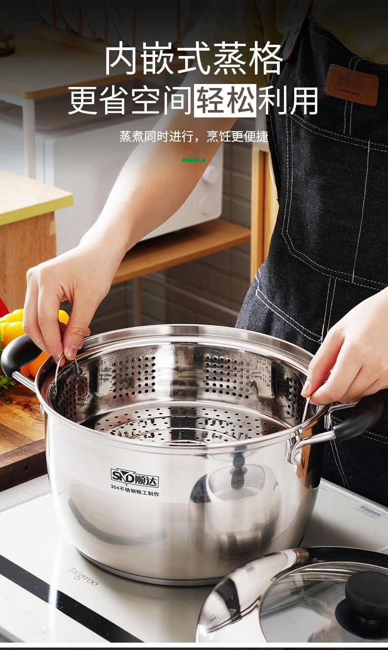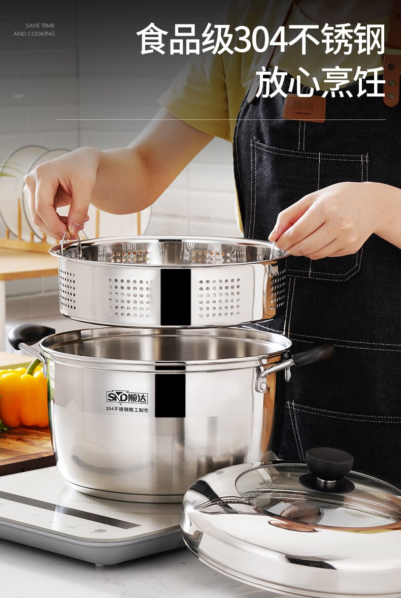 Shunda (SND) Japanese steamer 304 stainless steel thickened double bottom single layer multi-purpose soup pot open flame induction cooker universal 26cm