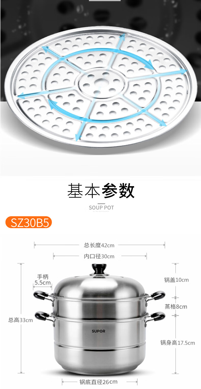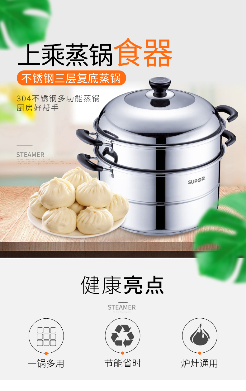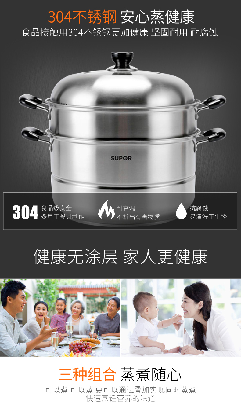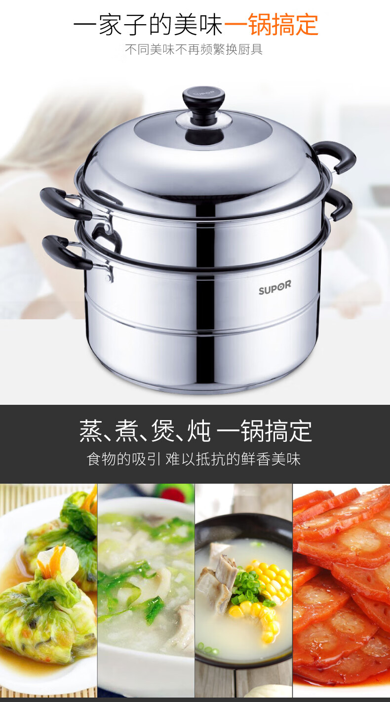 SUPOR steamer, two-layer stainless steel, double bottom, 304 stainless steel, steamed fish, steamed buns, steamed buns, 30cm, 2 layers, 30cm