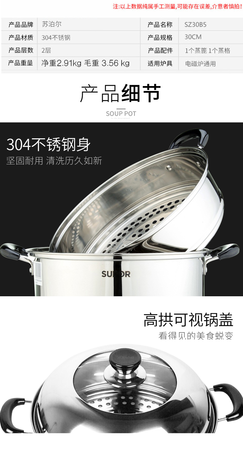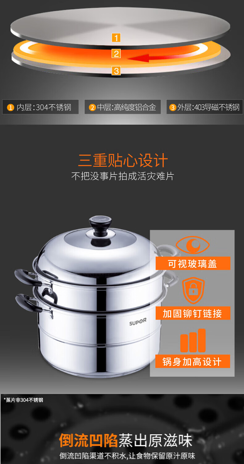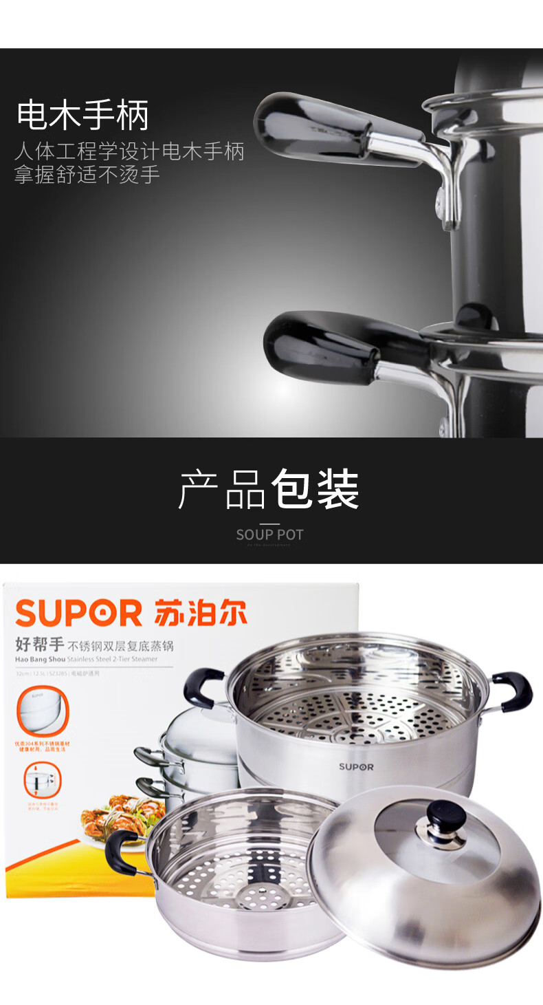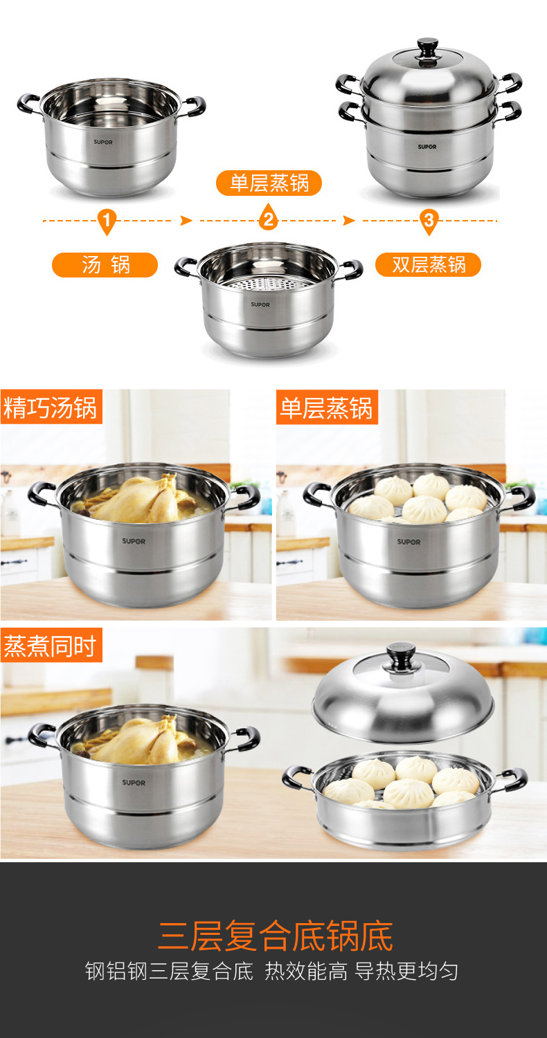 SUPOR steamer, two-layer stainless steel, double bottom, 304 stainless steel, steamed fish, steamed buns, steamed buns, 30cm, 2 layers, 30cm