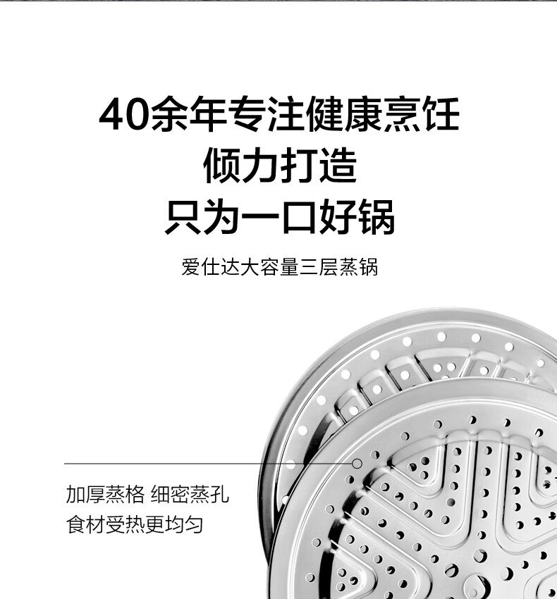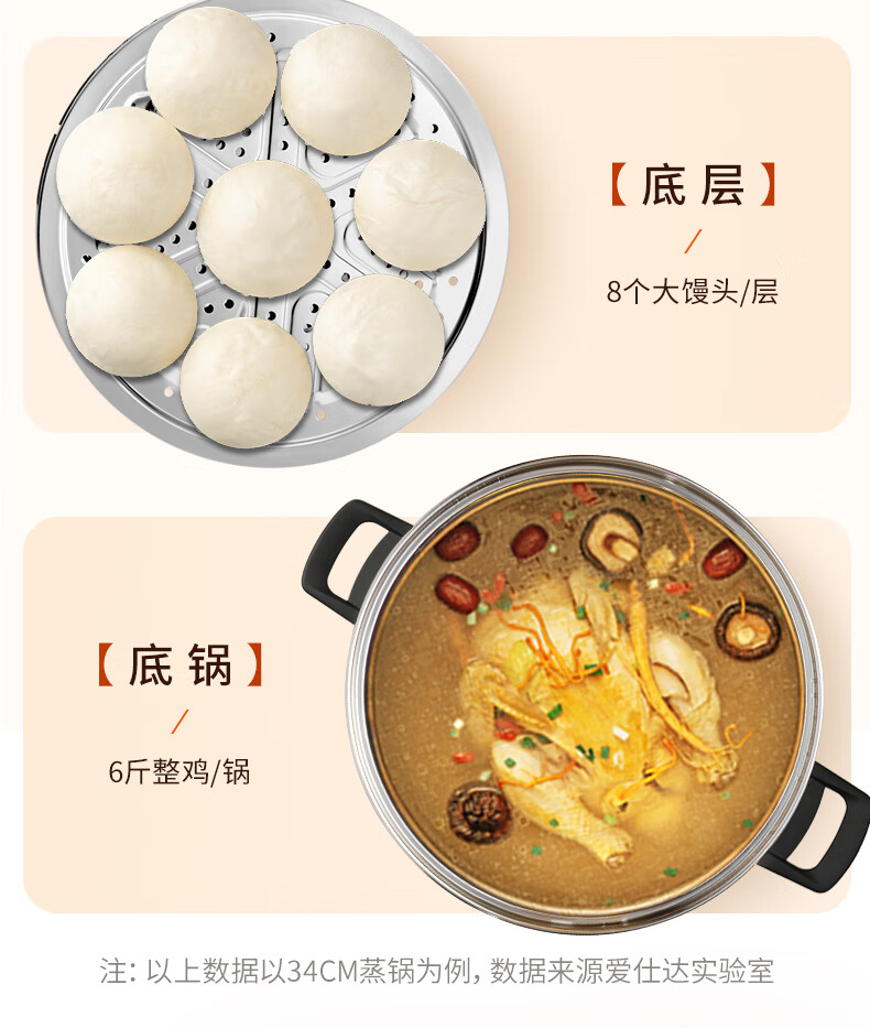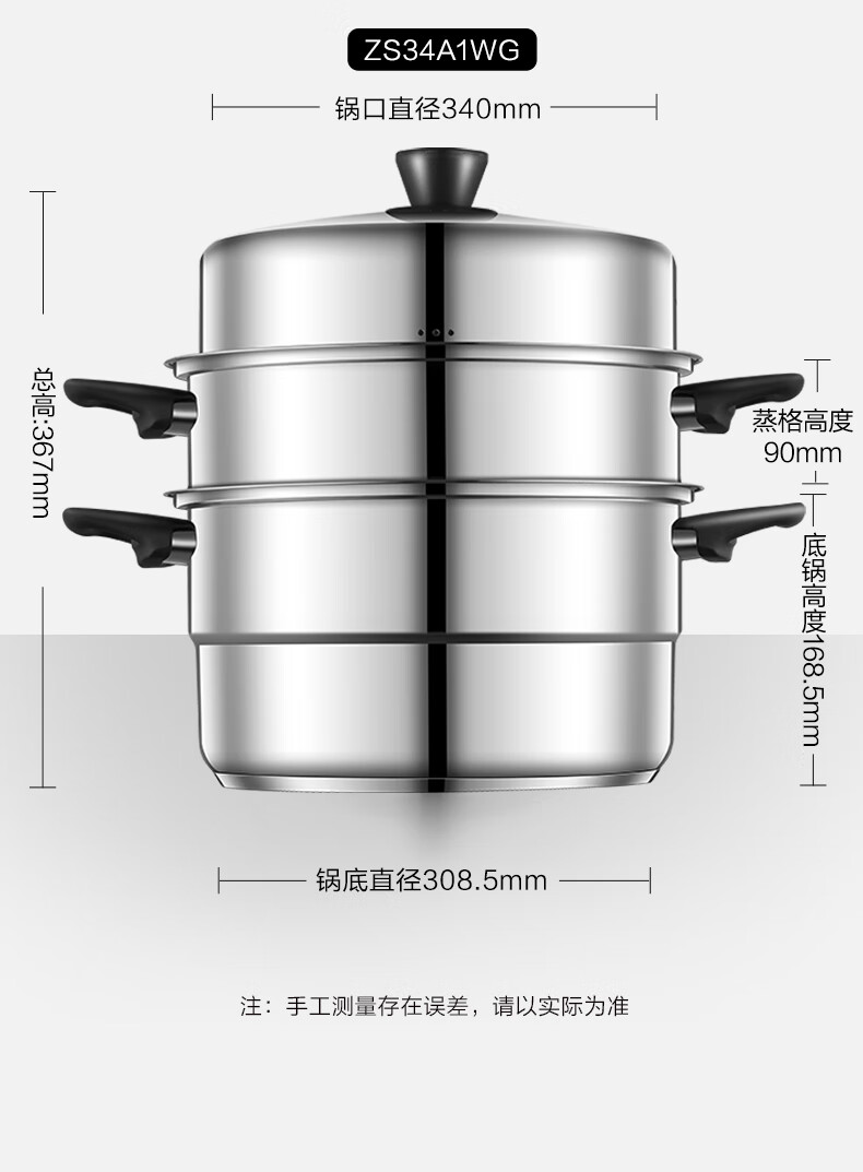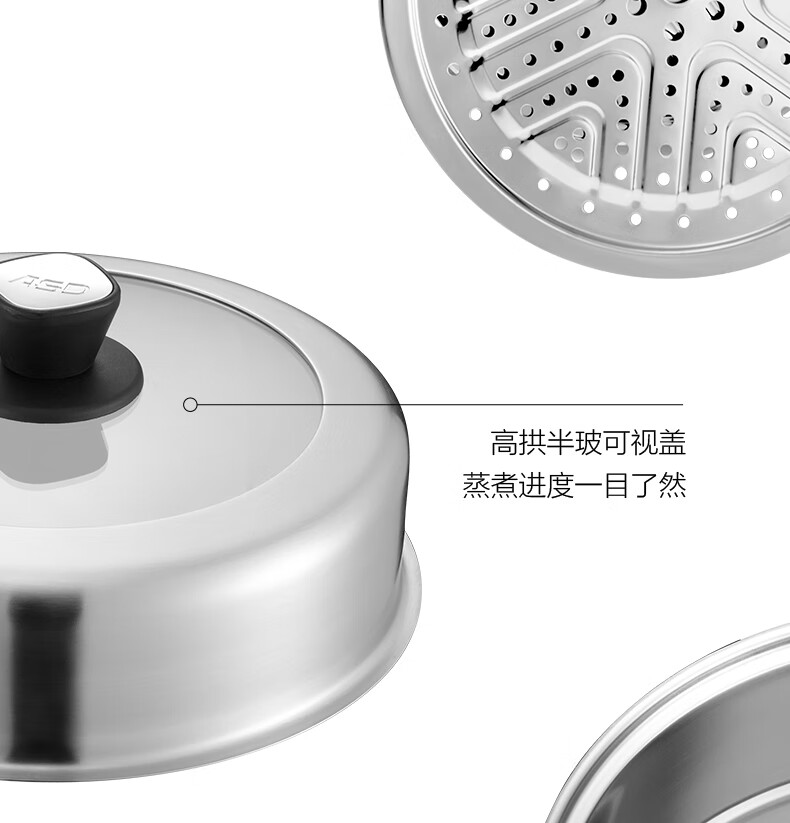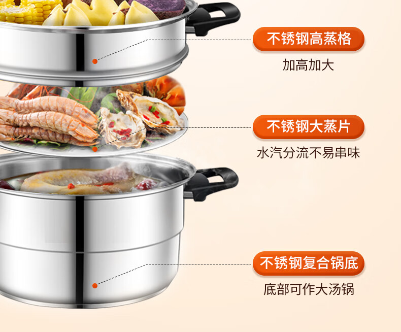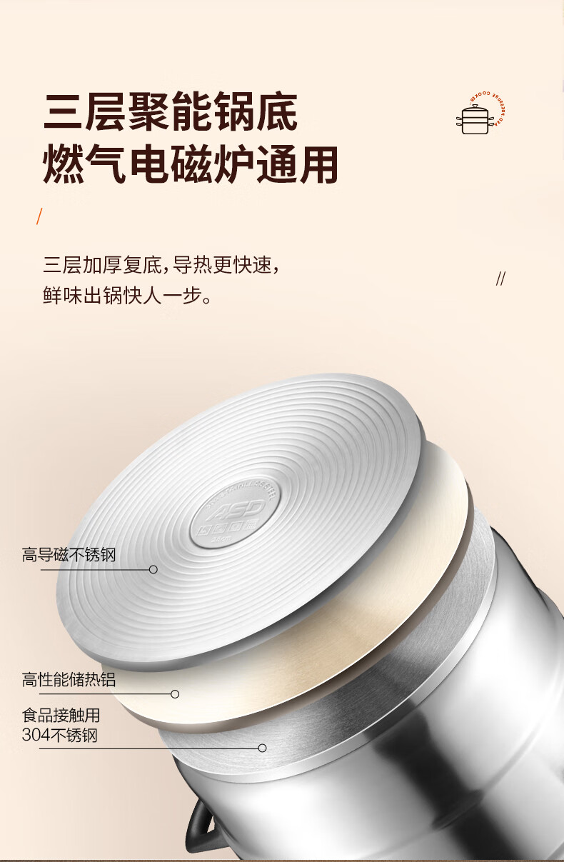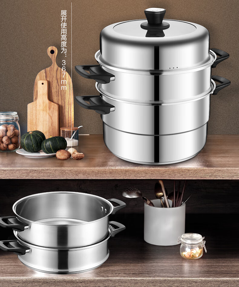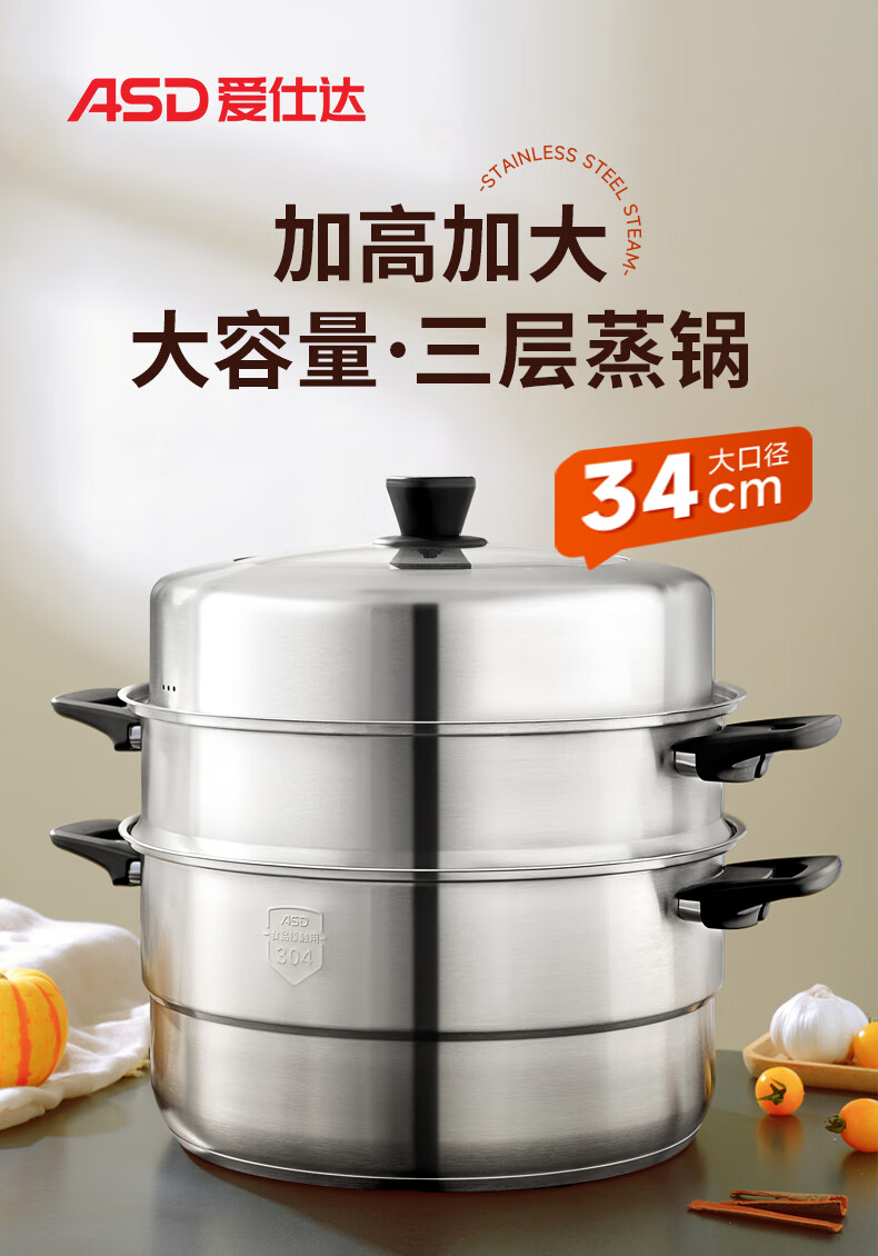 ASD steamer 304 stainless steel true three-layer heightened steamer large capacity steamed bun pot double bottom open flame induction cooker universal large size large capacity steamer 3 layers 34cm
