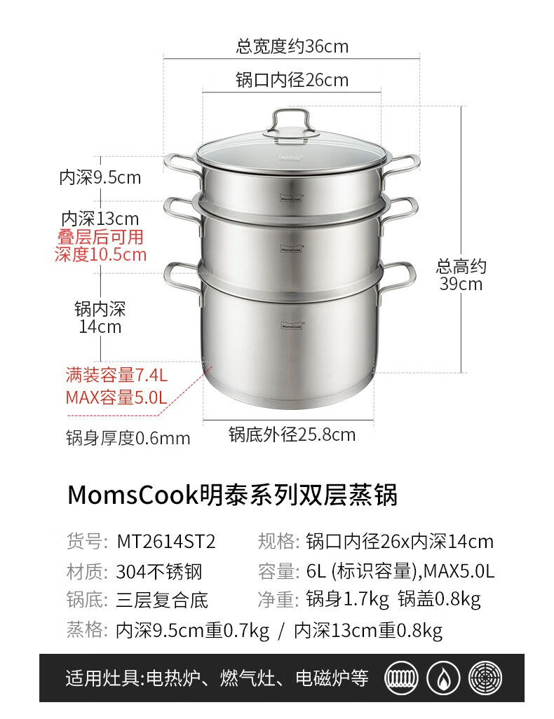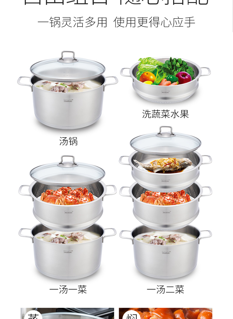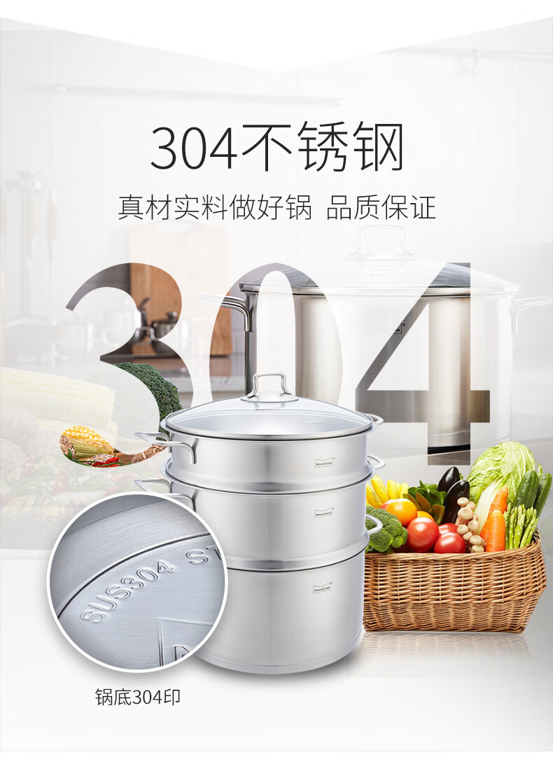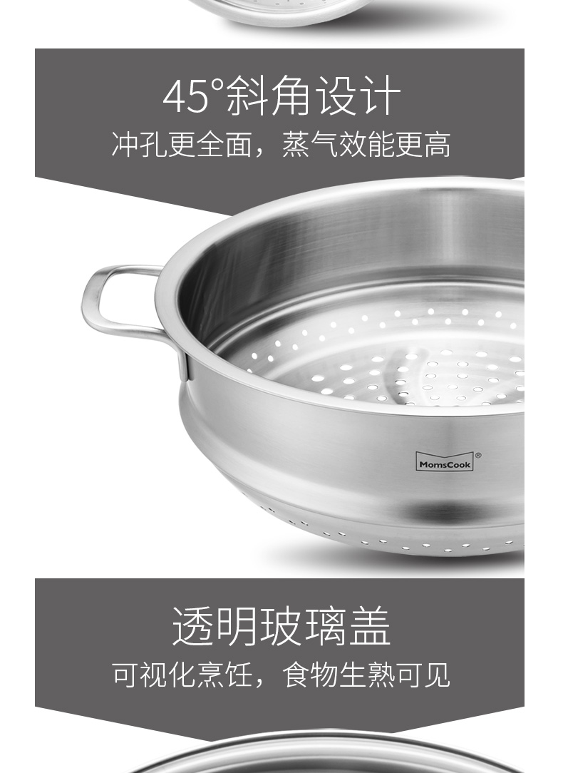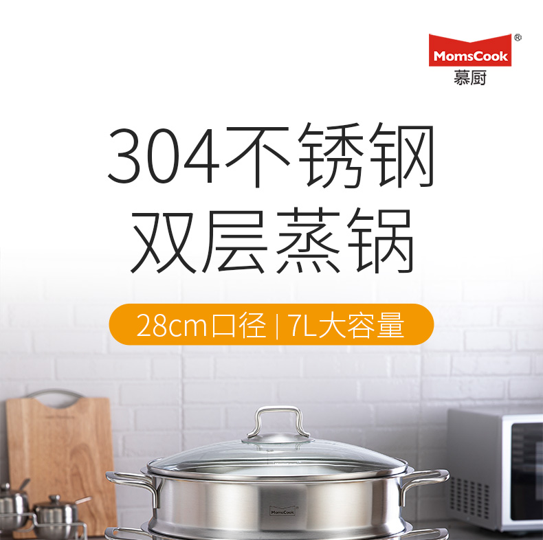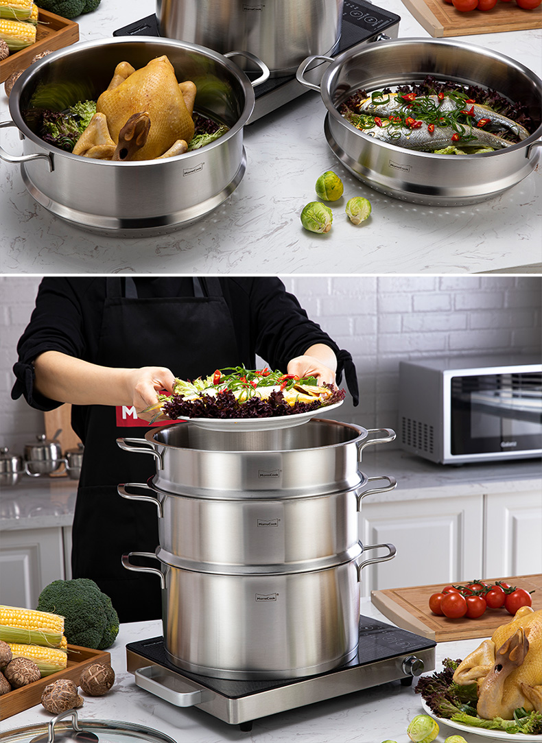 Momscook stainless steel steamer 28cm multi-layer steamer steamer 304 double-layer thickened soup steamer dual-purpose bottom height 14cm 28x14cm double-layer steamer 2 layers 28cm