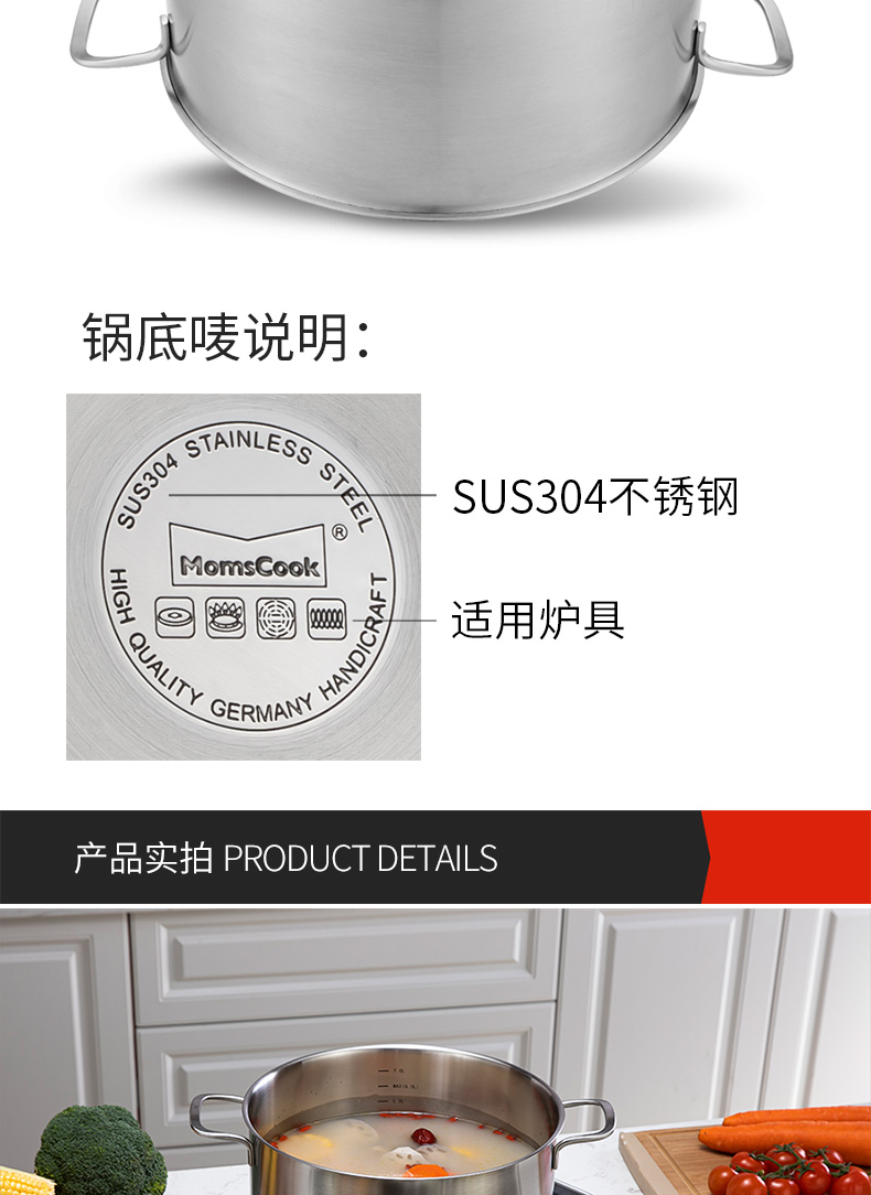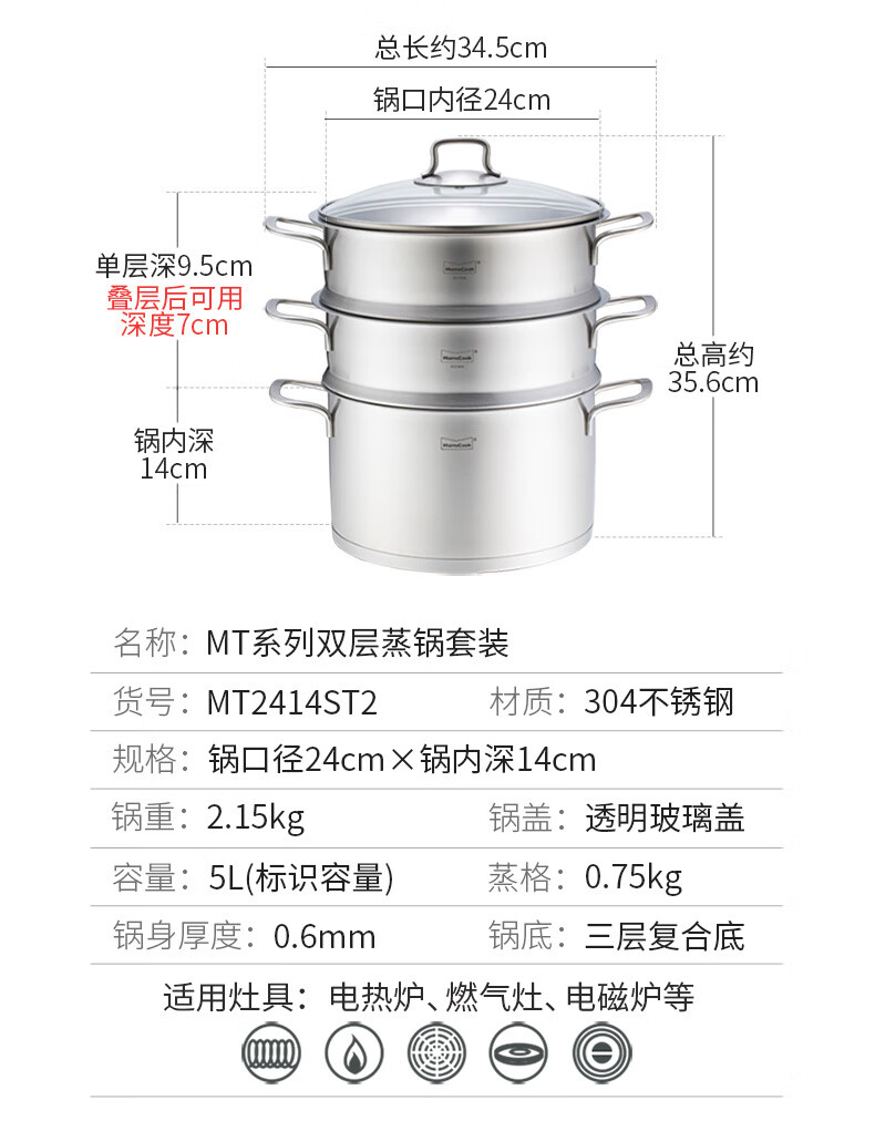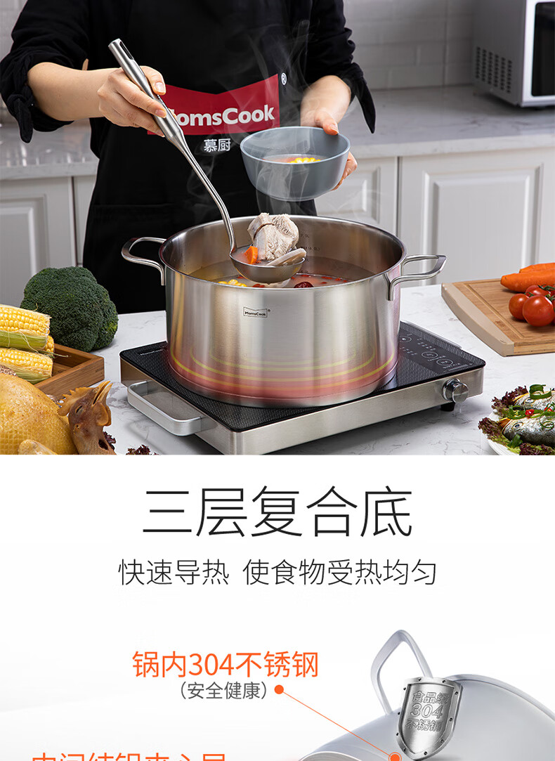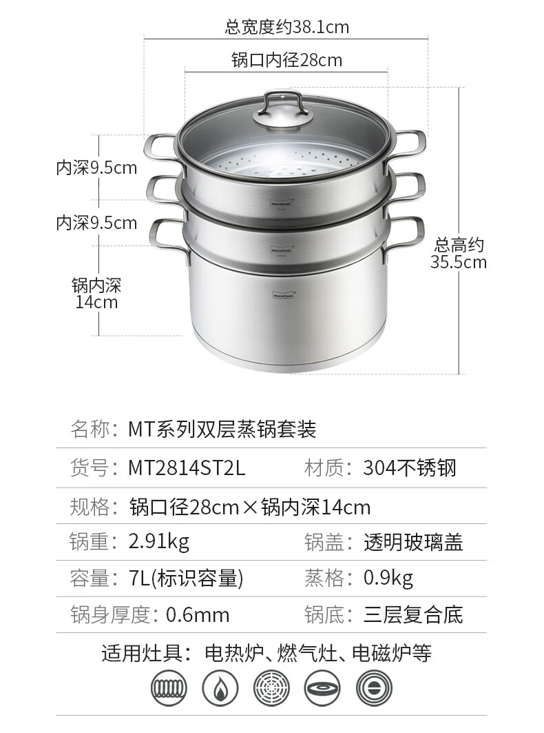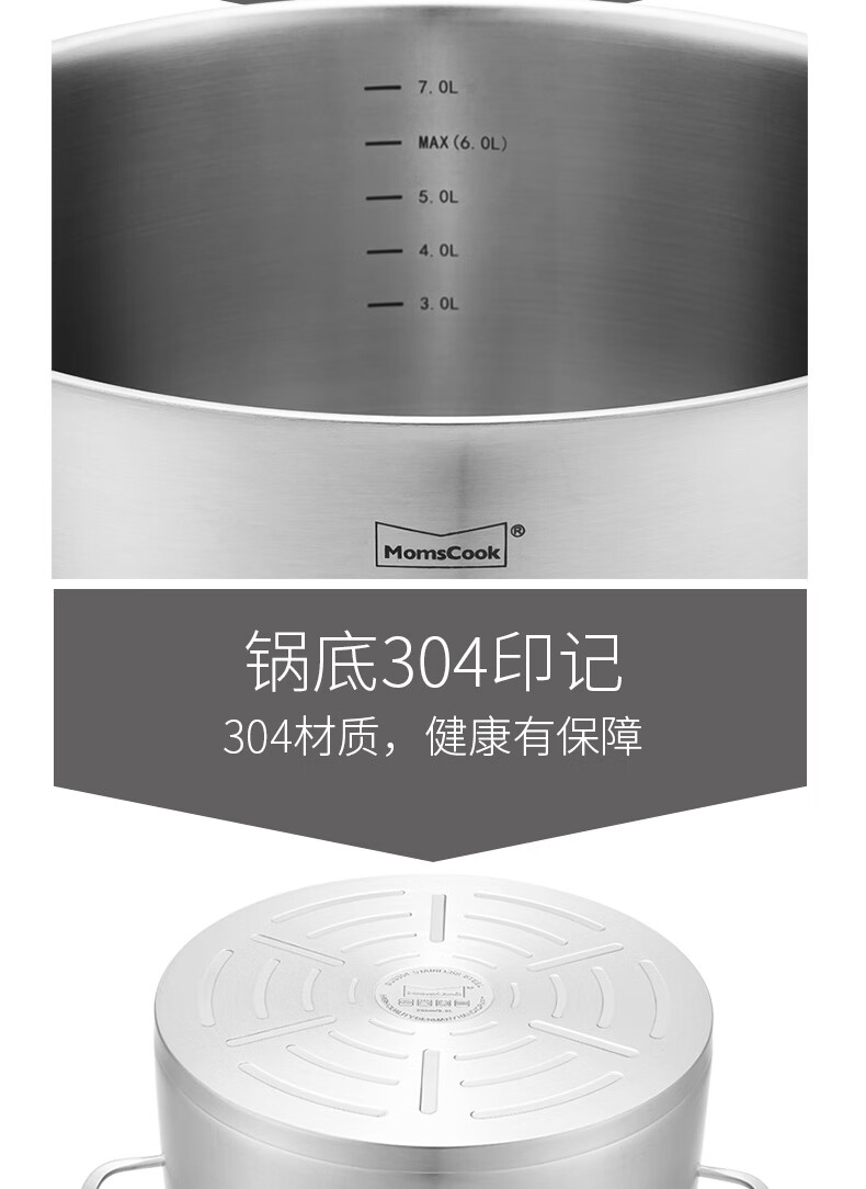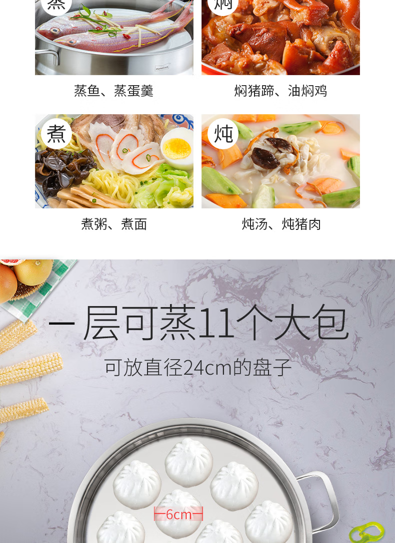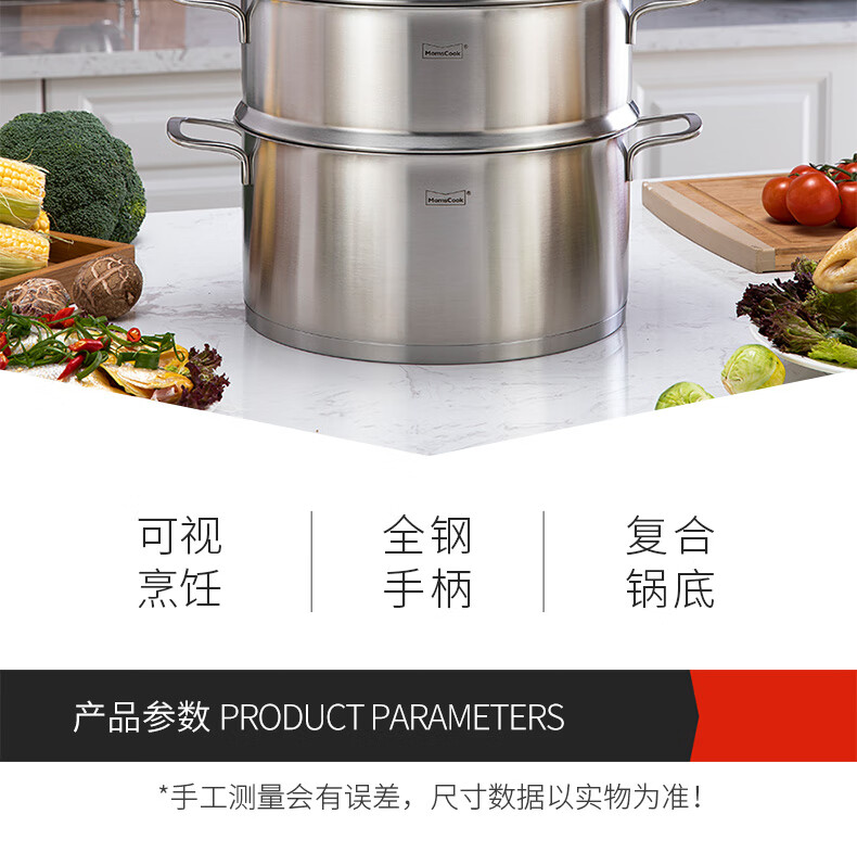 Momscook stainless steel steamer 28cm multi-layer steamer steamer 304 double-layer thickened soup steamer dual-purpose bottom height 14cm 28x14cm double-layer steamer 2 layers 28cm