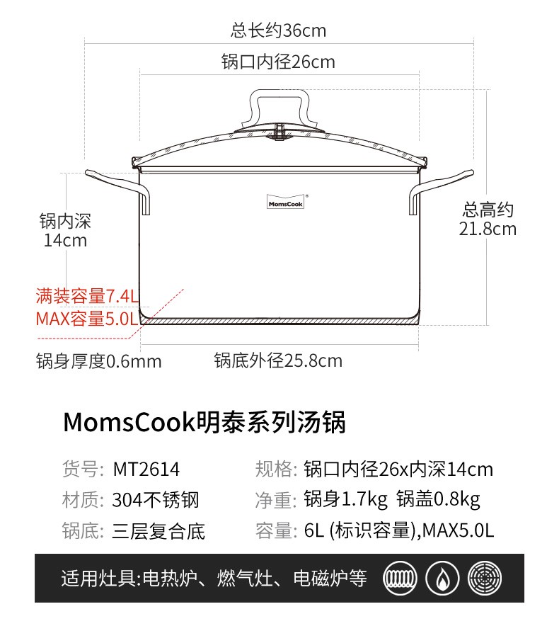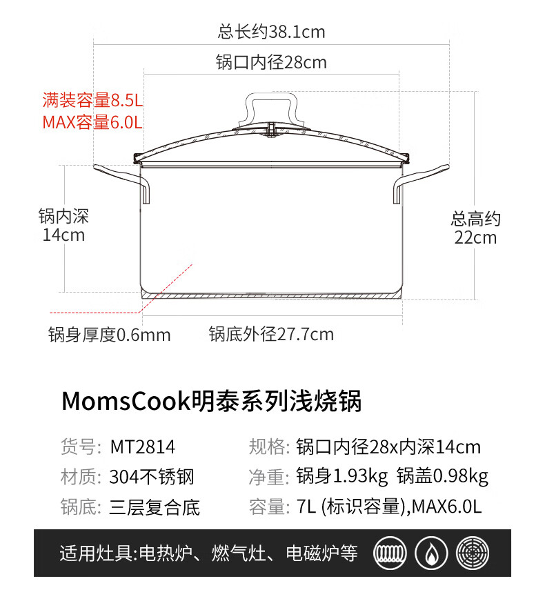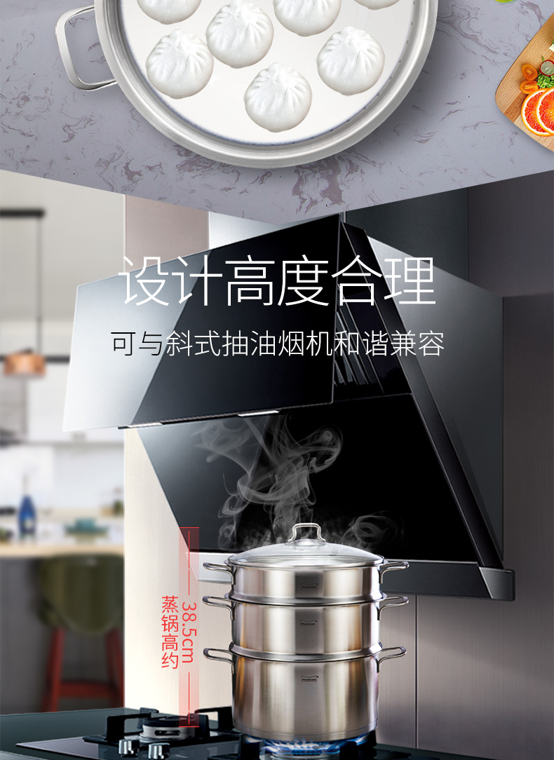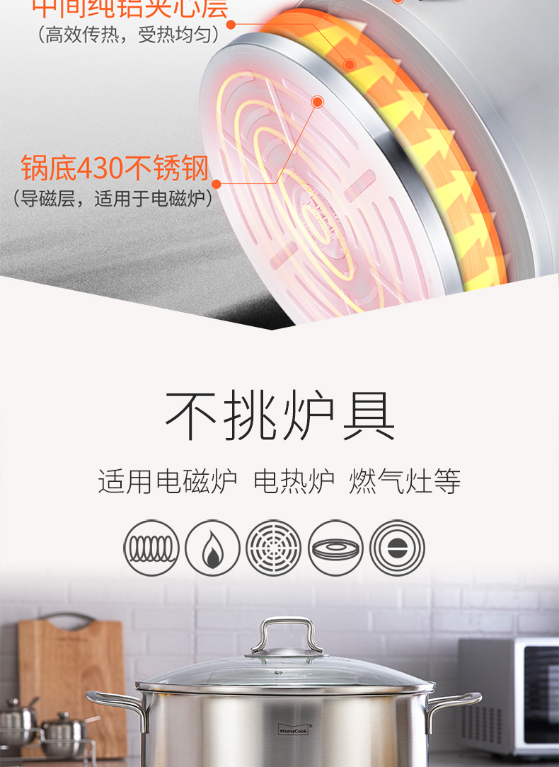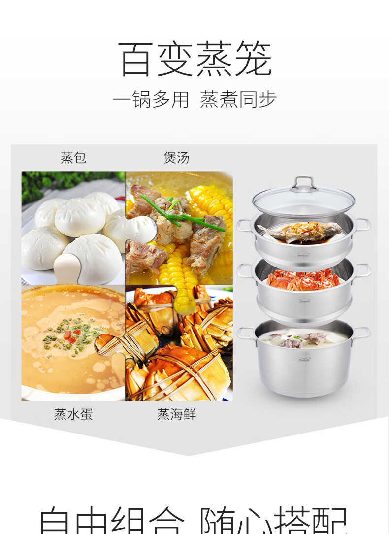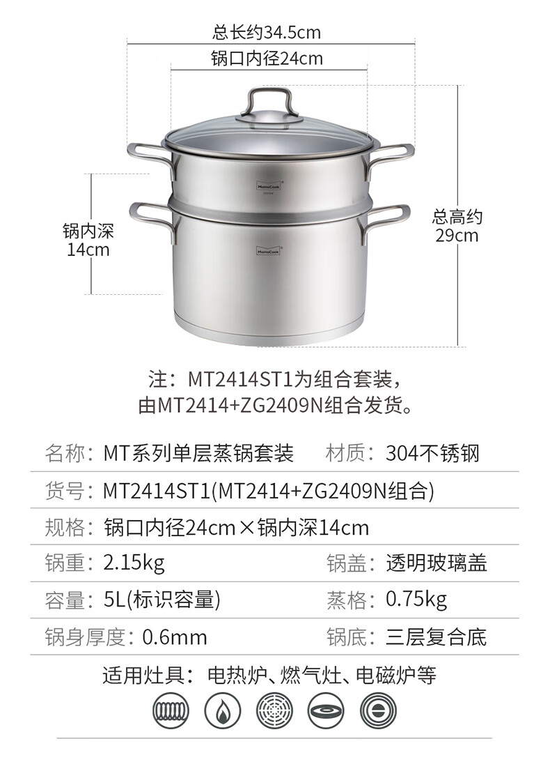 Momscook stainless steel steamer 28cm multi-layer steamer steamer 304 double-layer thickened soup steamer dual-purpose bottom height 14cm 28x14cm double-layer steamer 2 layers 28cm
