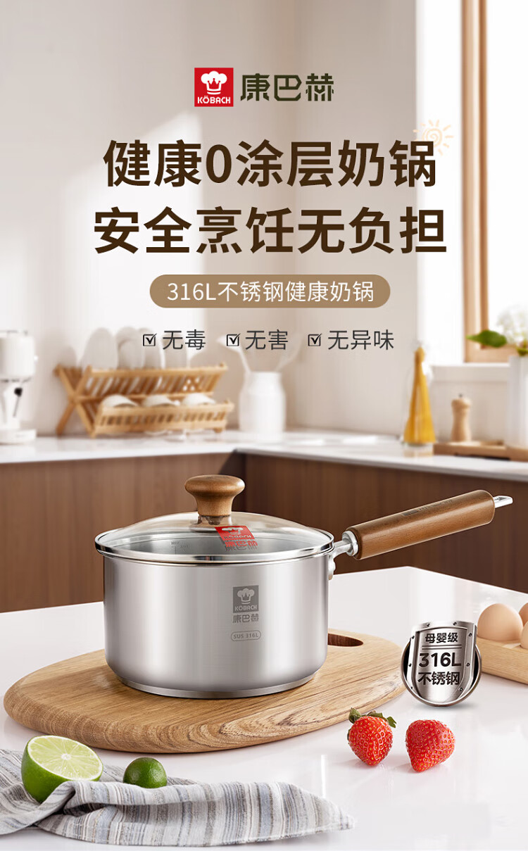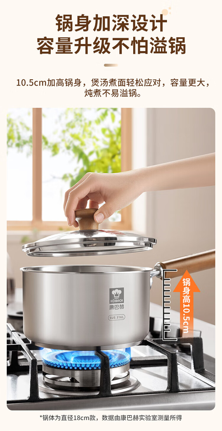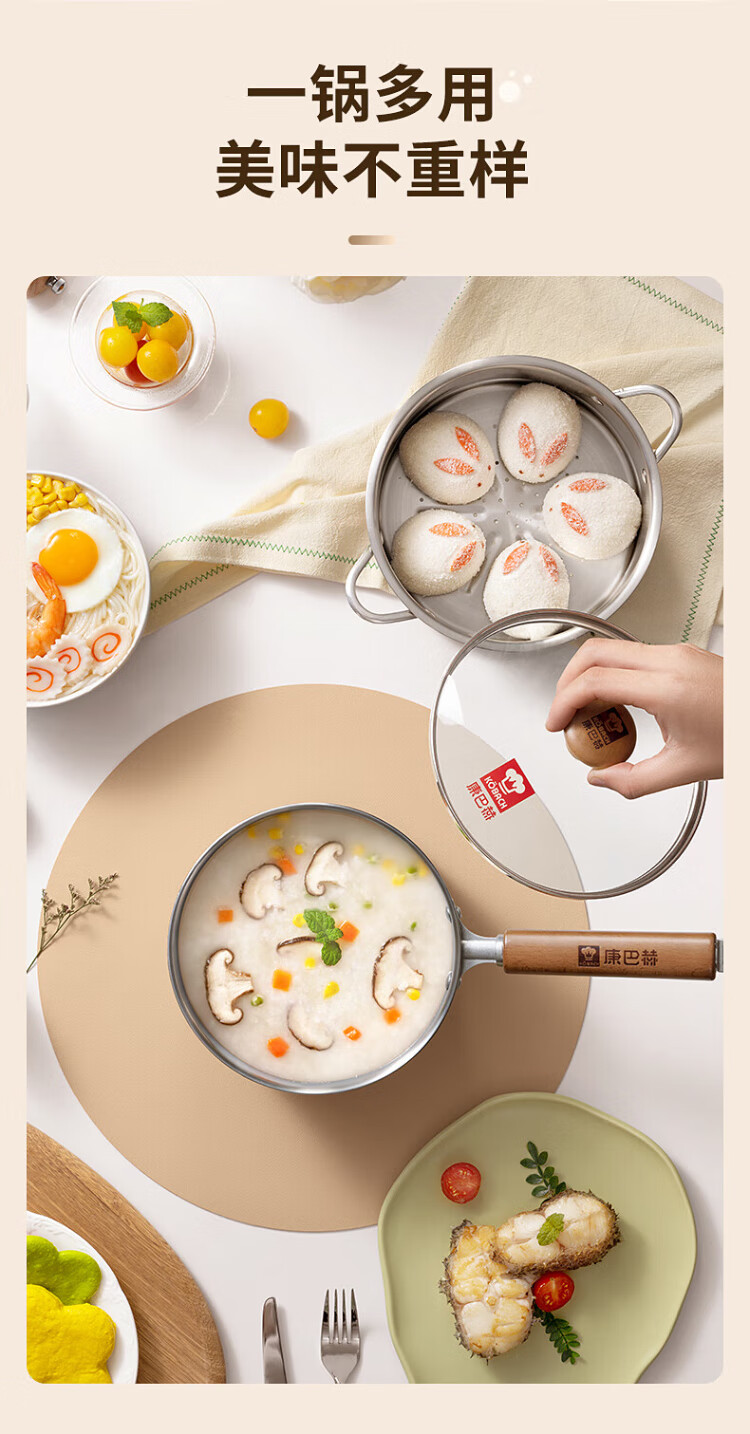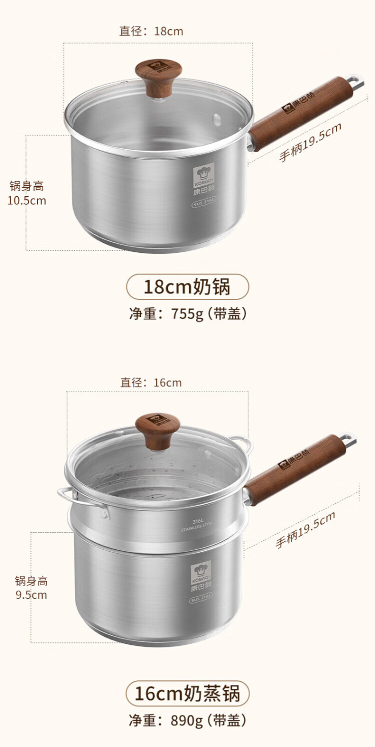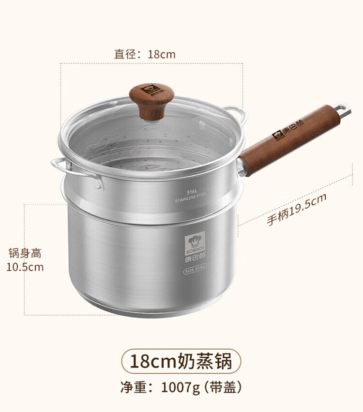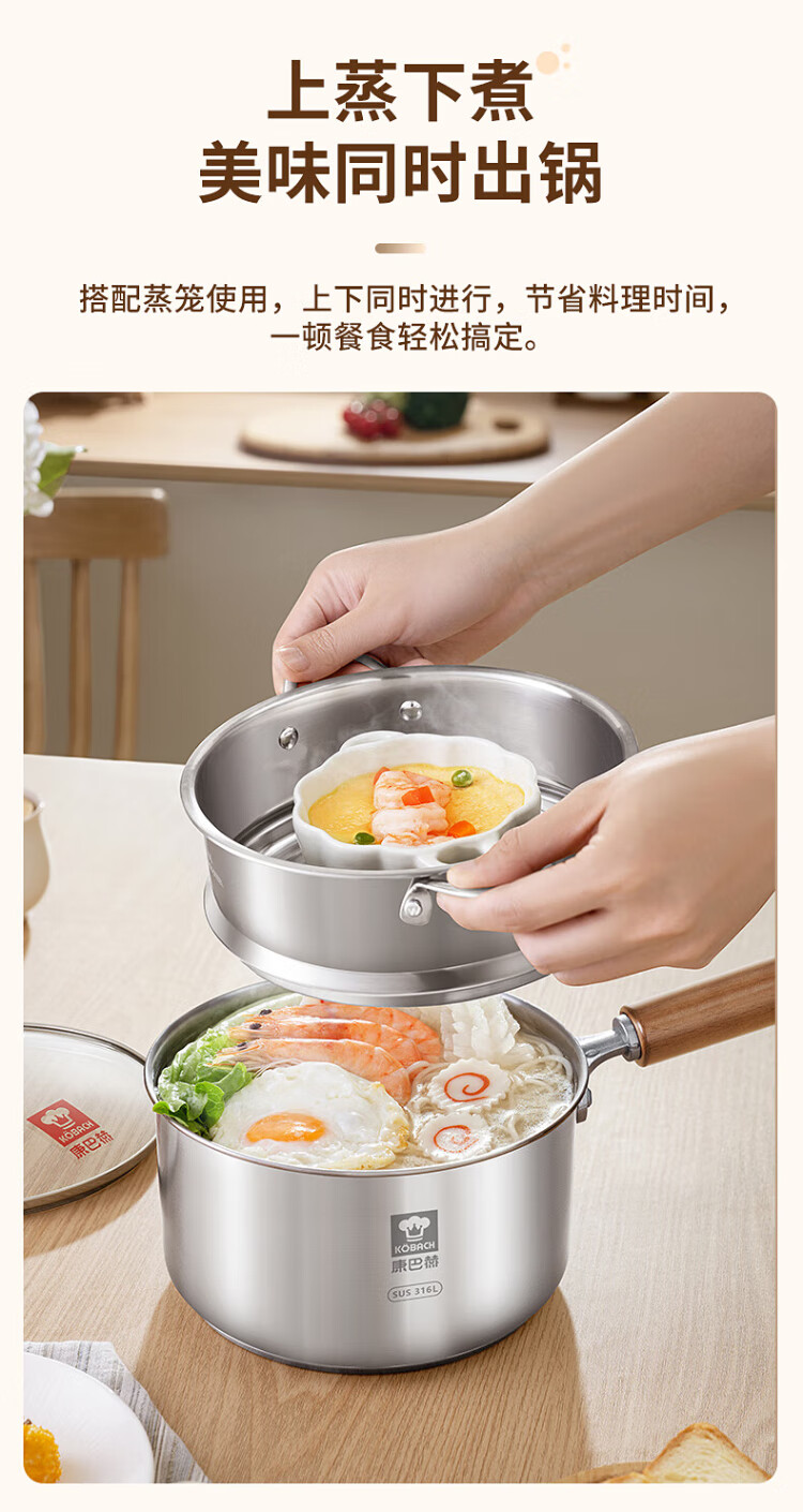 Konbach (KBH) 316L stainless steel milk pot baby food supplement pot with steamer baby frying all-in-one small milk pot noodle pot 18cm