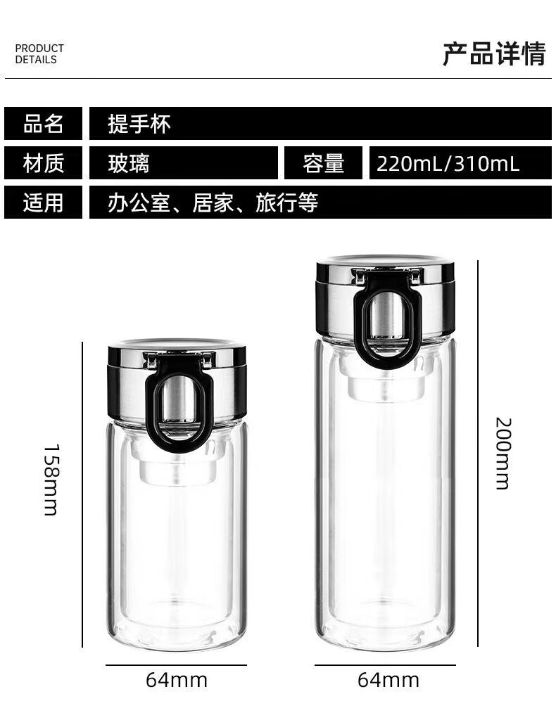 New double-layer insulated glass cup, high temperature resistant tea cup, portable tea and water separation universal mini drinking cup, black mini handle cup, 288ml 1 piece