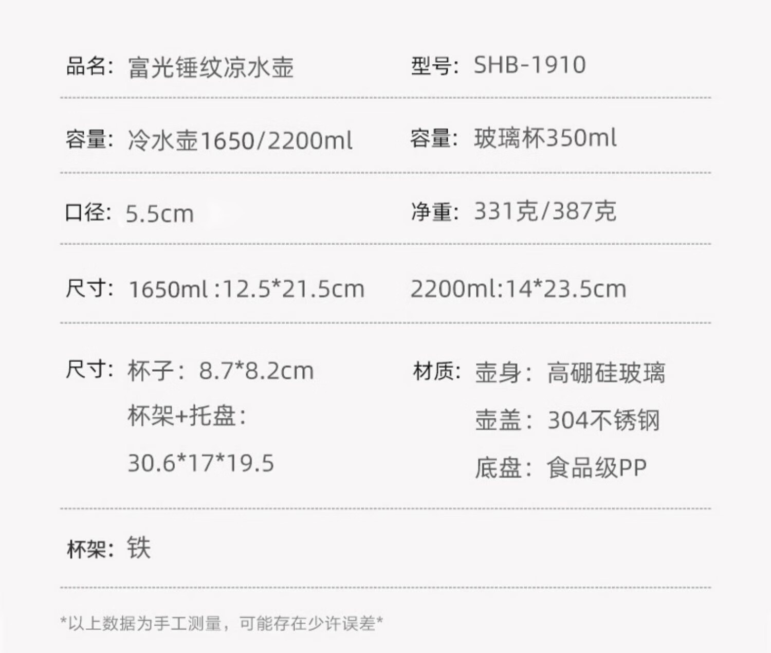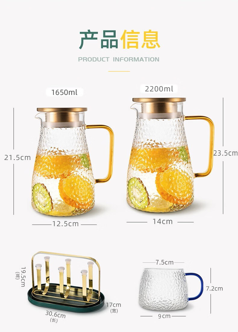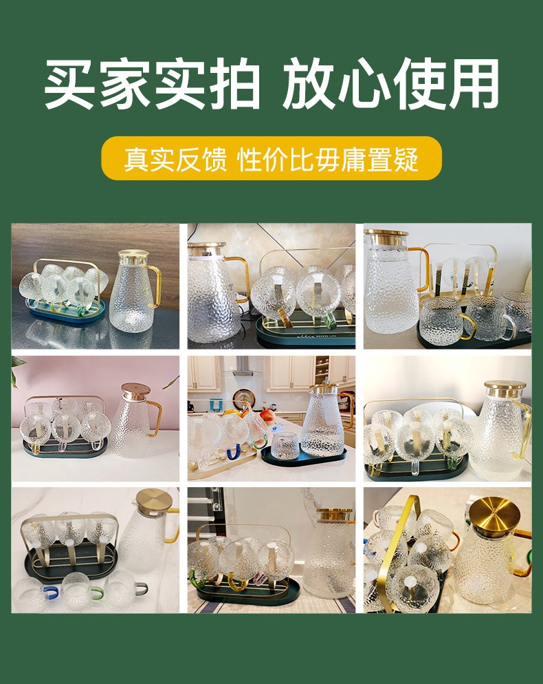 Fuguang glass cold kettle, household heat-resistant high-temperature large-capacity tea kettle, cold boiled water cup, family set, kettle 2200ml + water cups (6 pieces) + shelf + plate