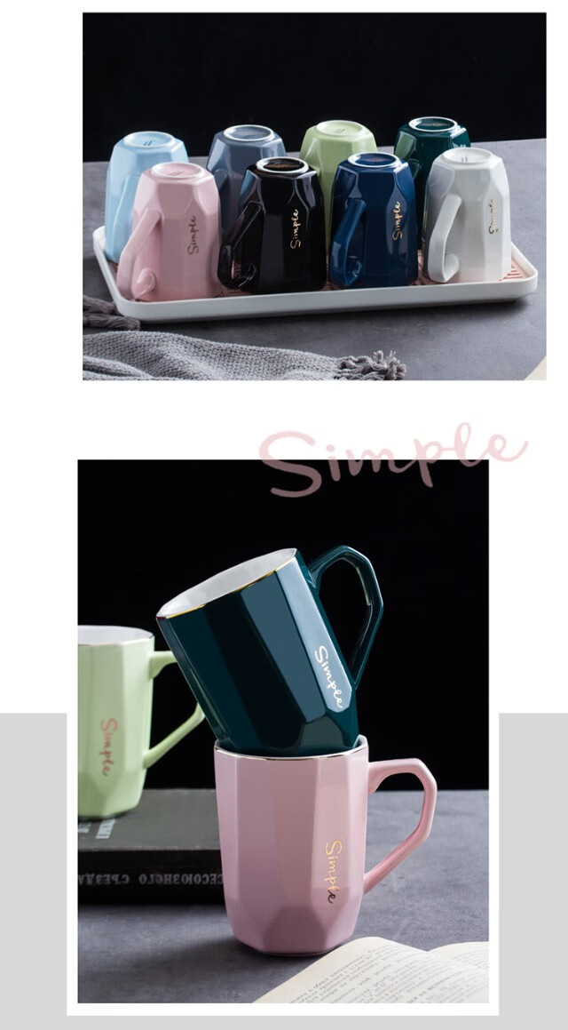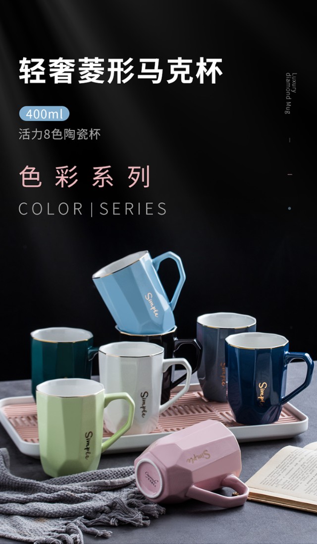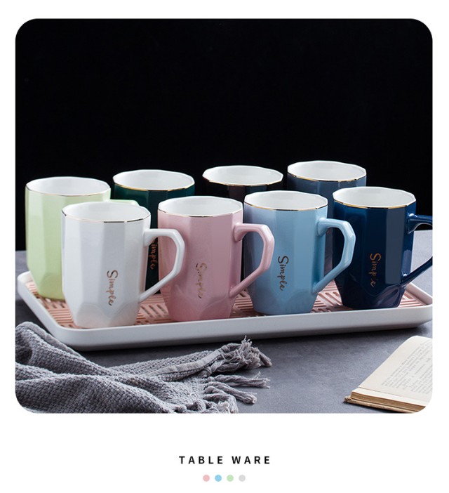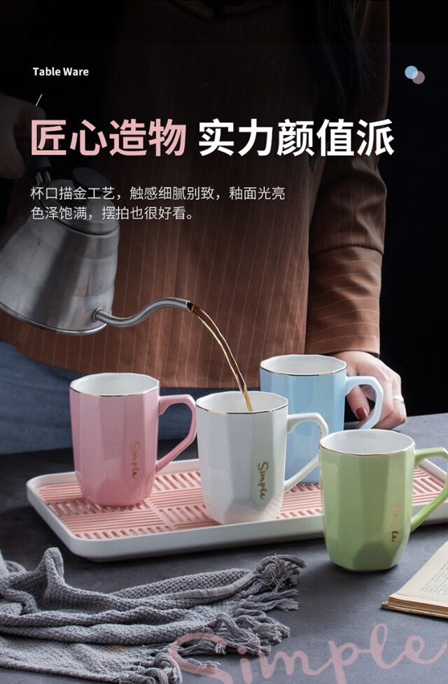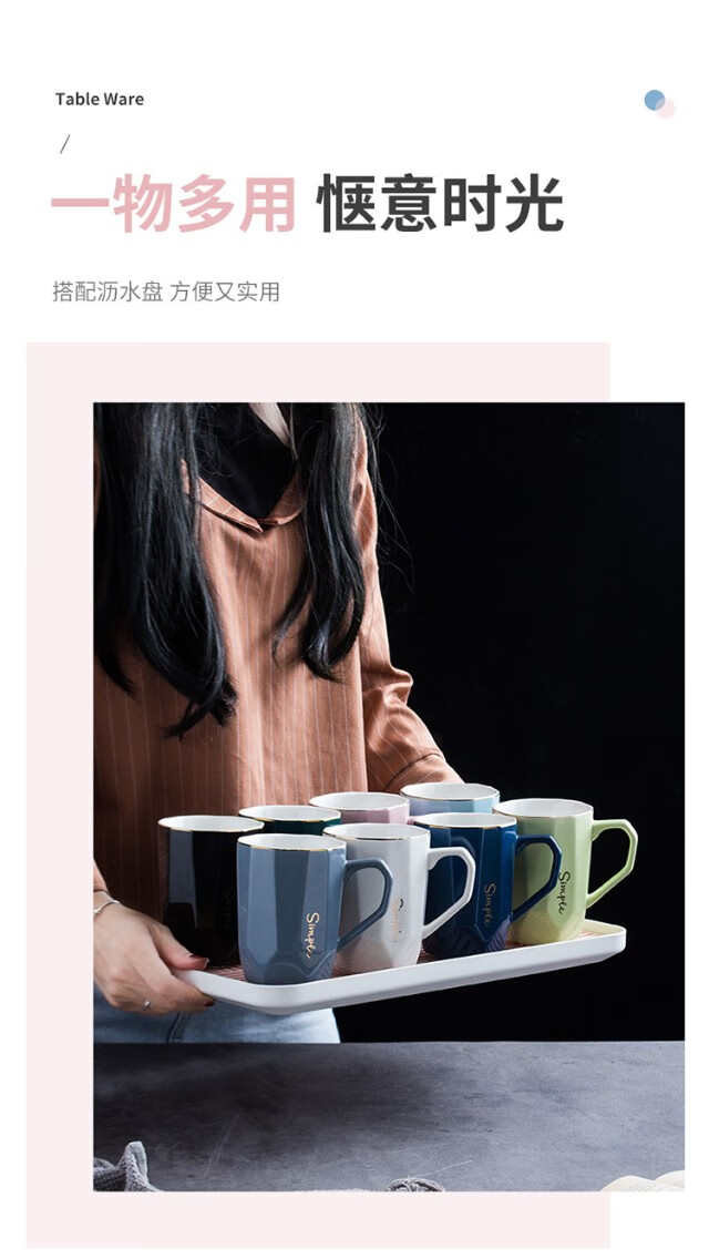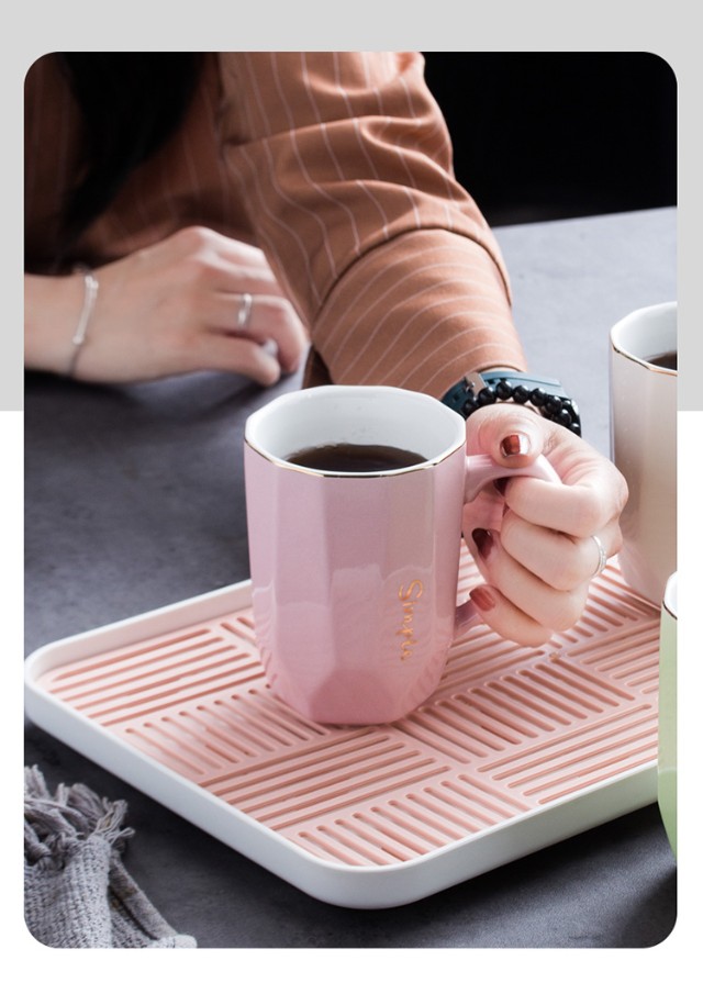 Guai ceramic mug set, simple home living room with tray, high-looking office mug, tea cup color distinction, 4 light-colored cups and plates, pink, blue, green and white