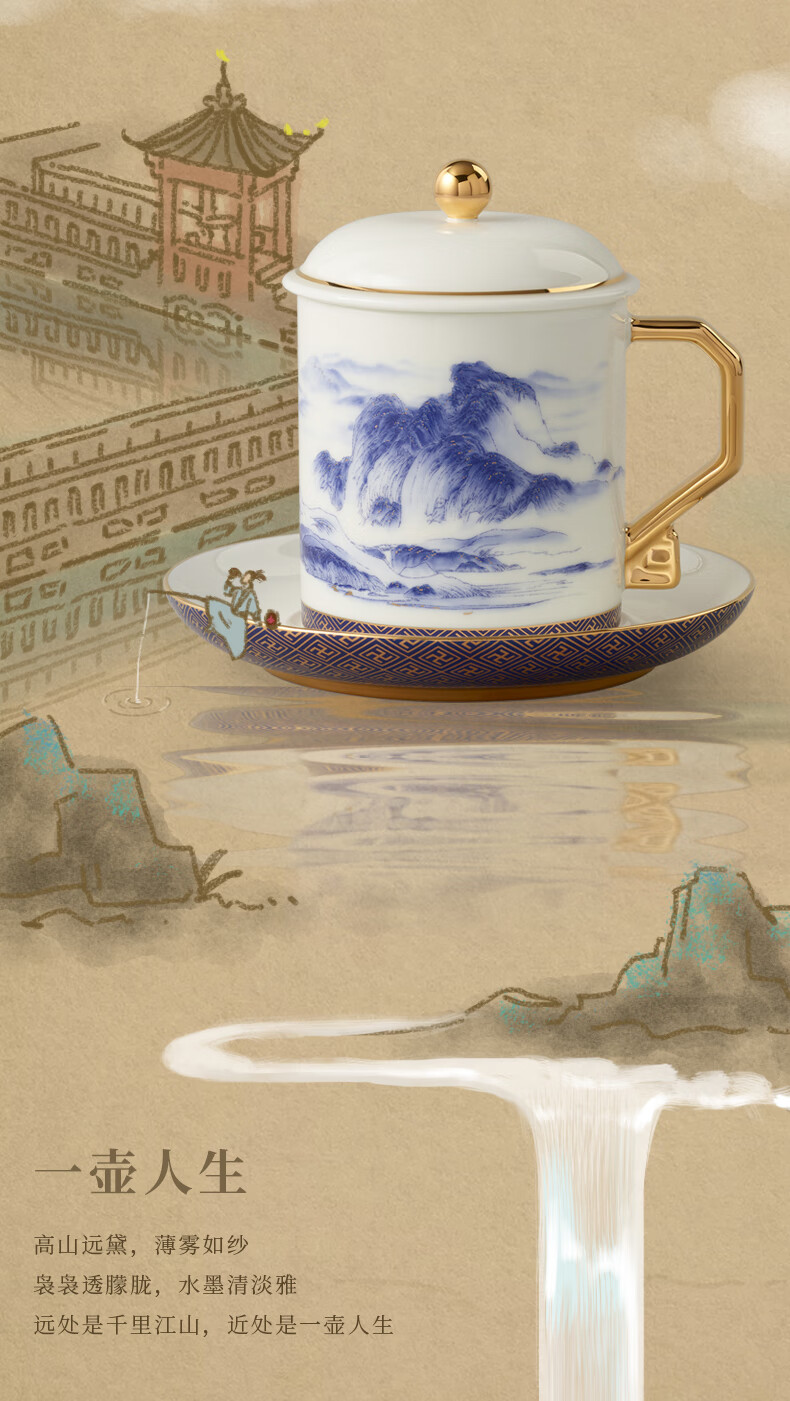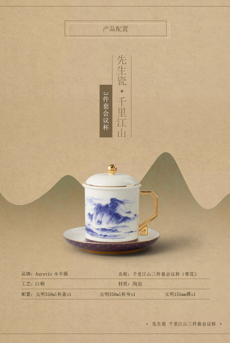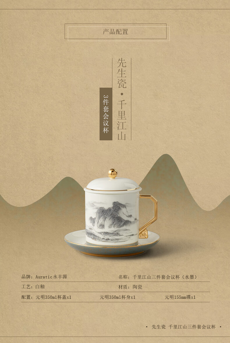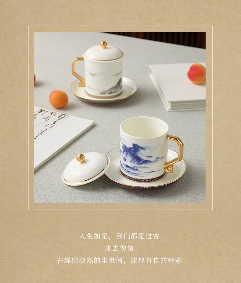 Yongfengyuan (auratic) Qianli Jiangshan Ceramic Cup Office Cup Conference Cup with Lid Business Meeting Water Cup Gift Box (350ml-ink)