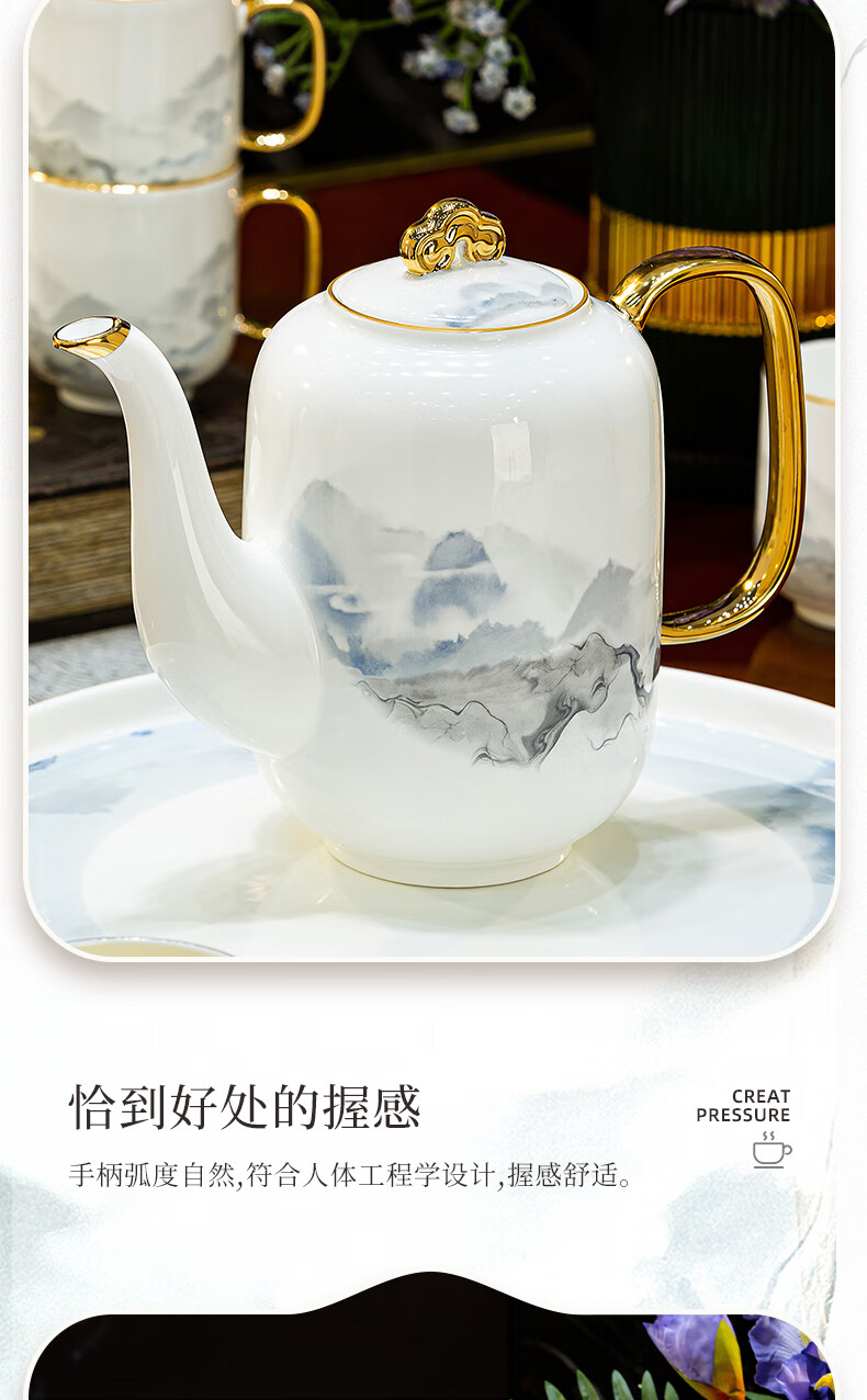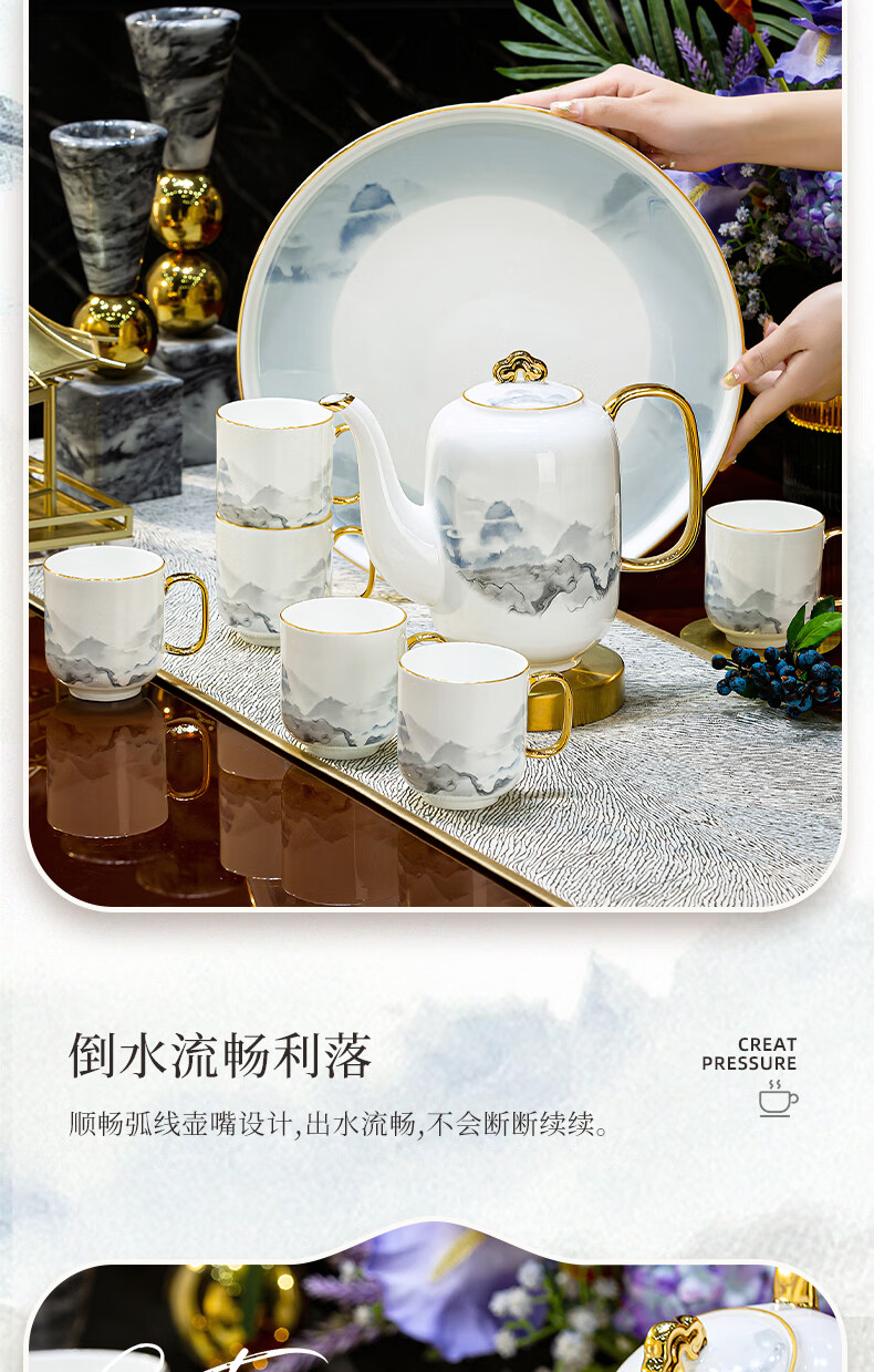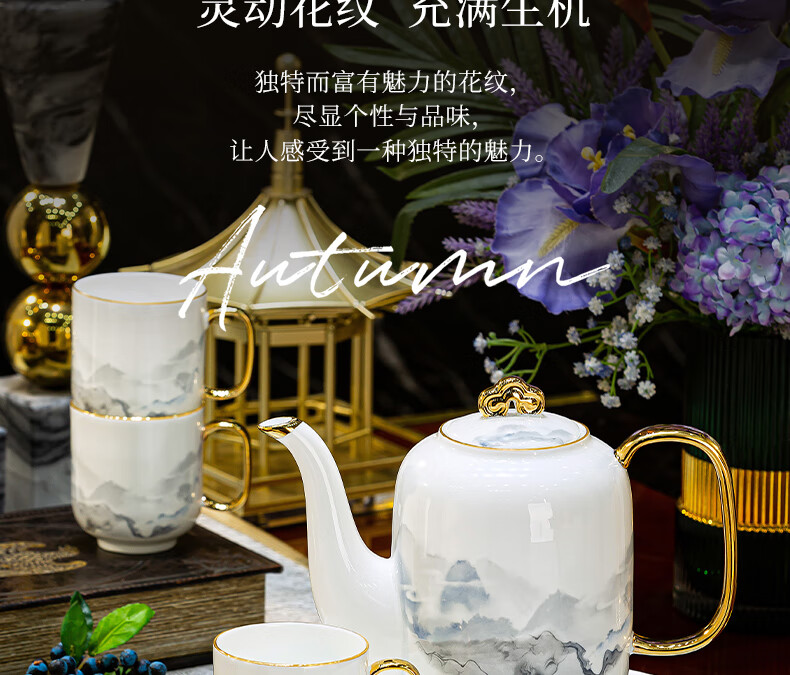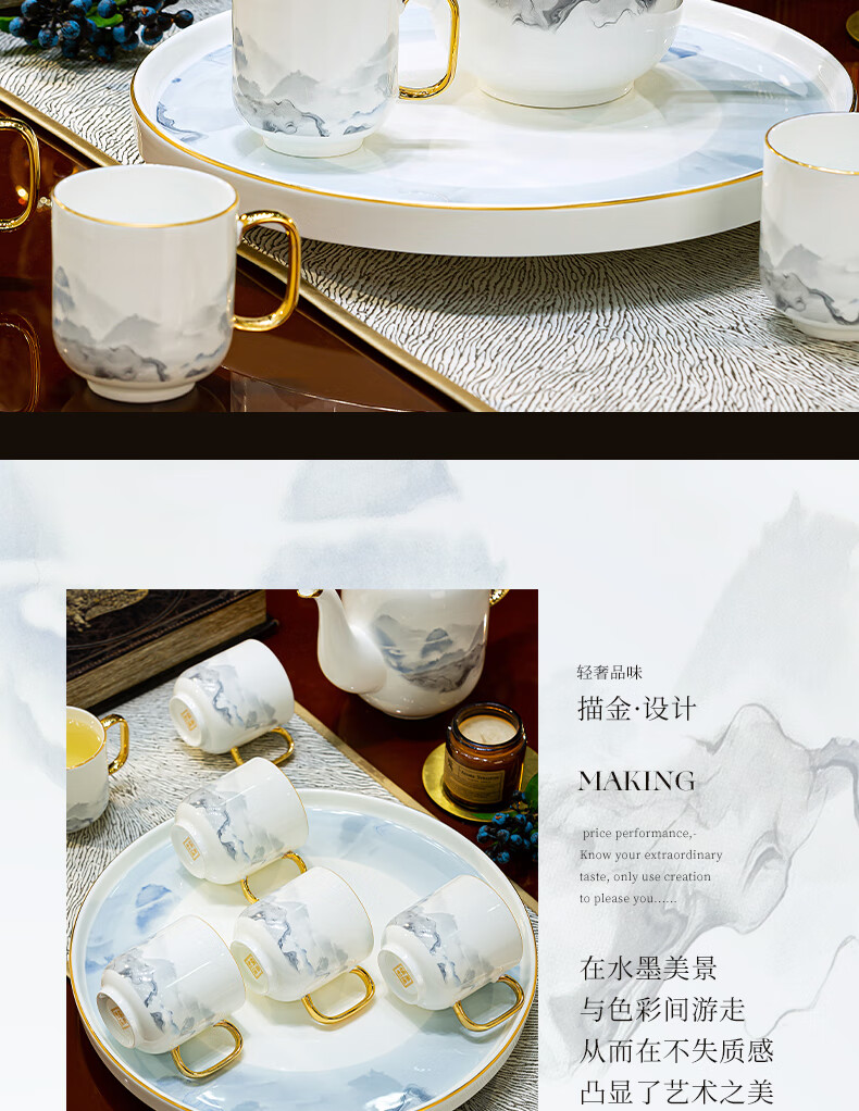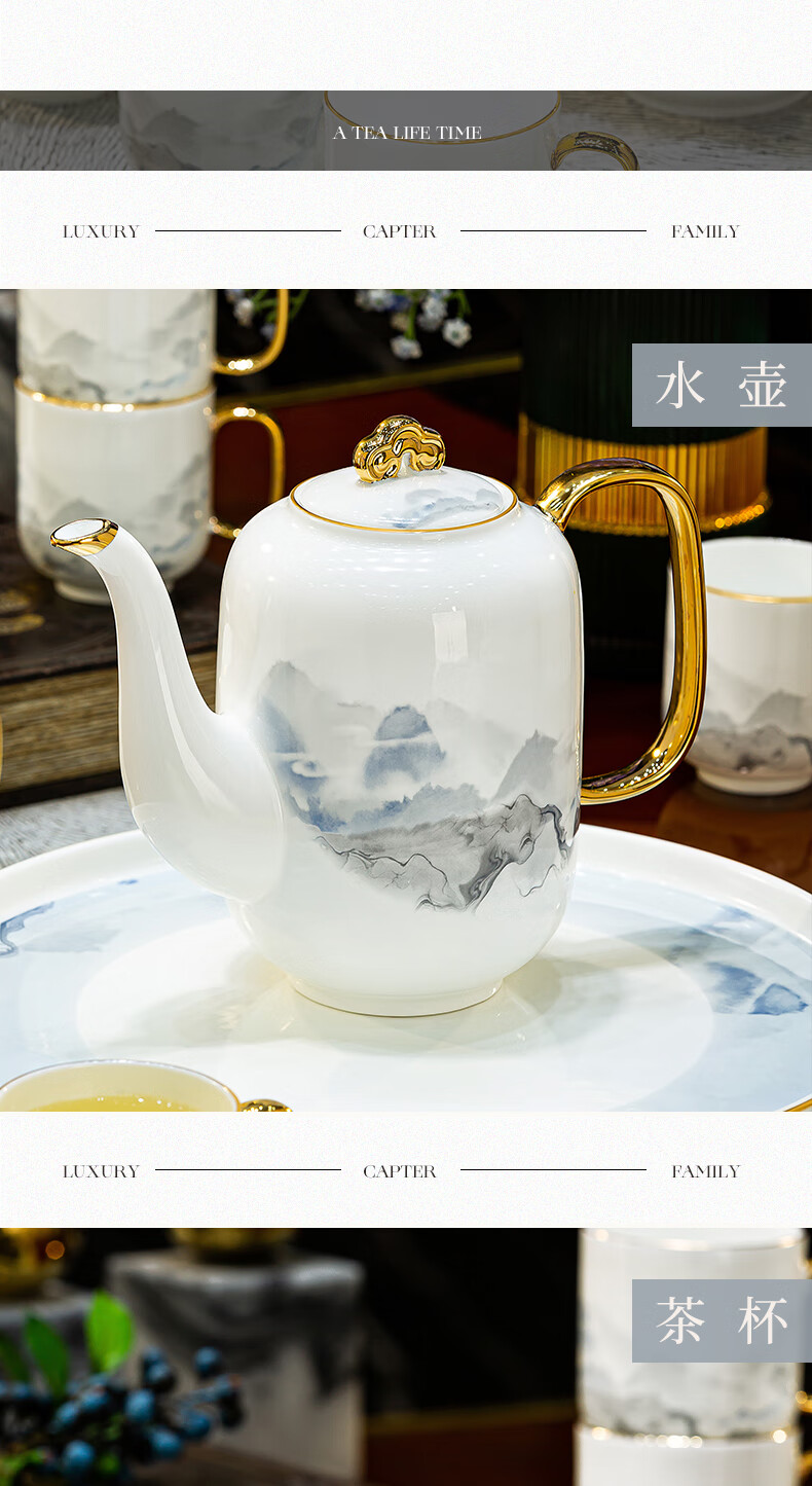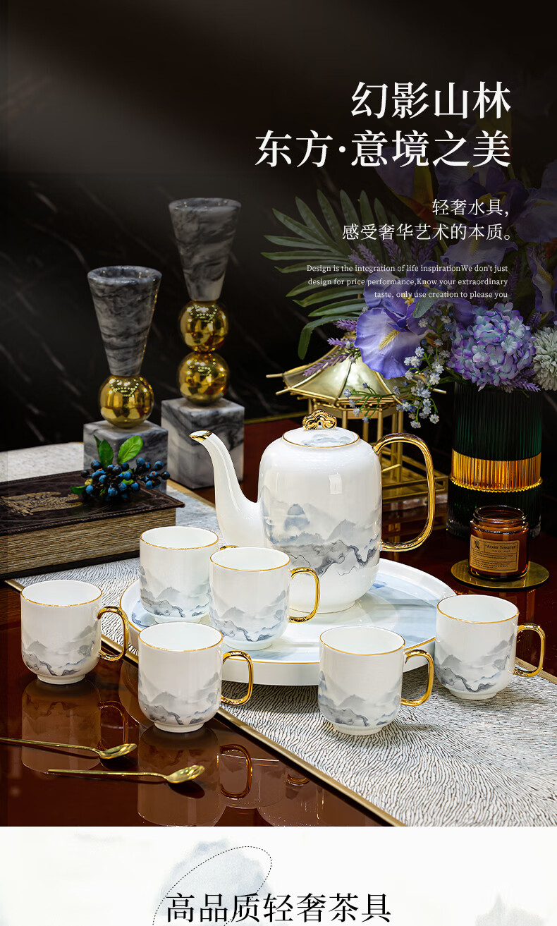 Han Ming new Chinese style tea set complete set for housewarming gift Jingdezhen water cup teapot living room household high-end ceramic cup set high-end bone china tea set 8-piece gift box