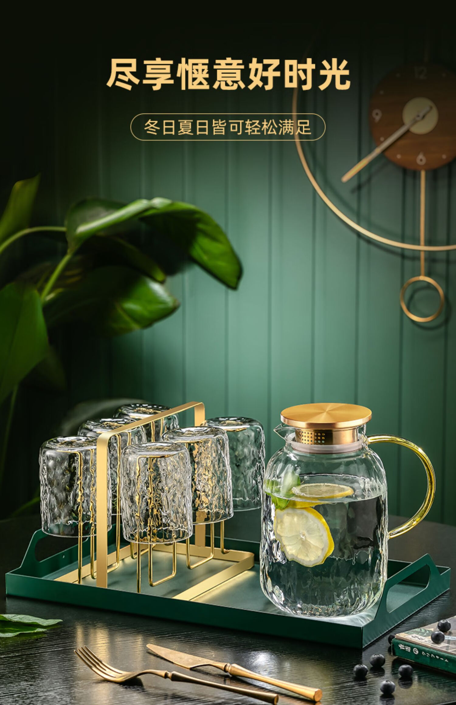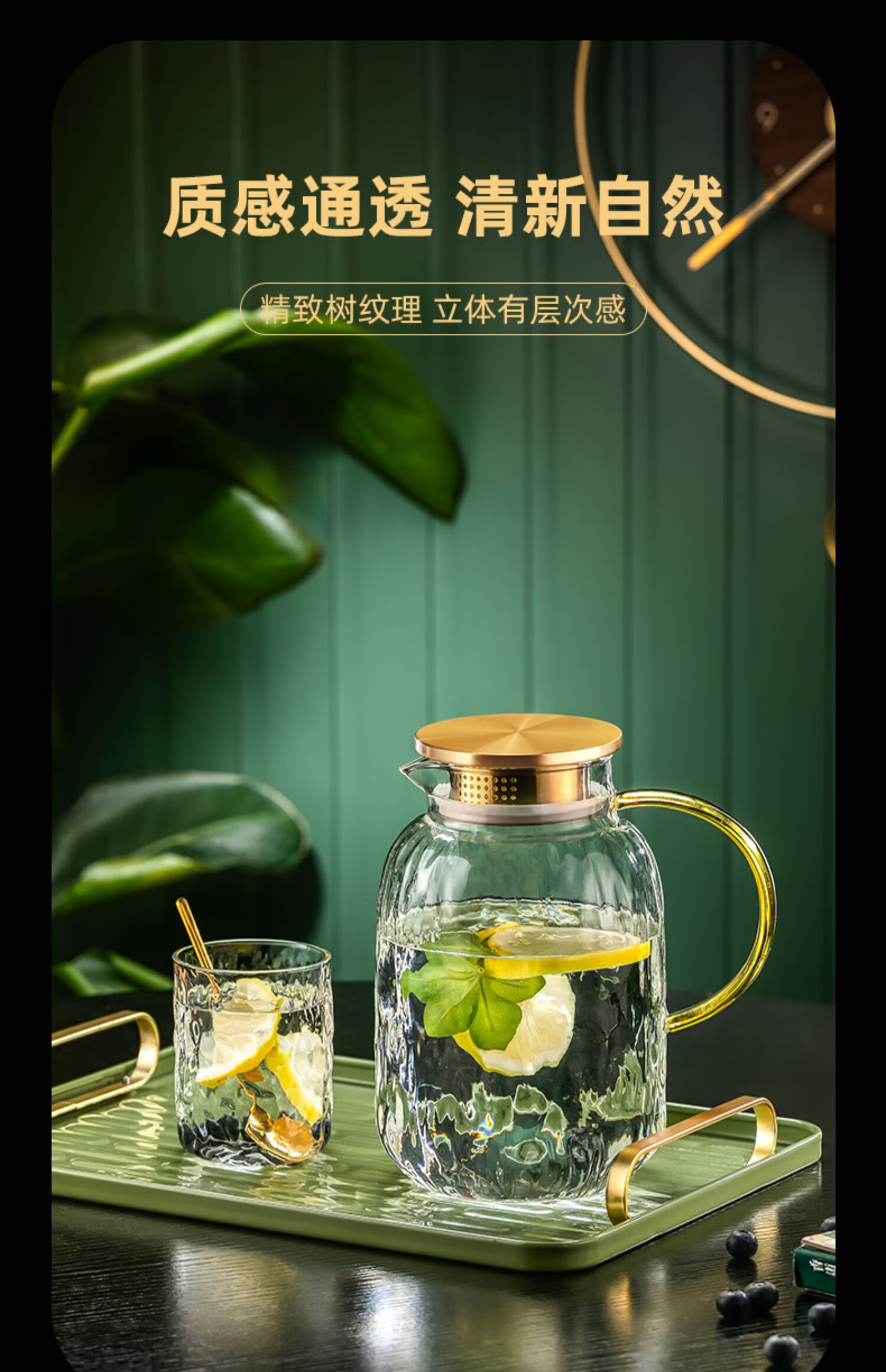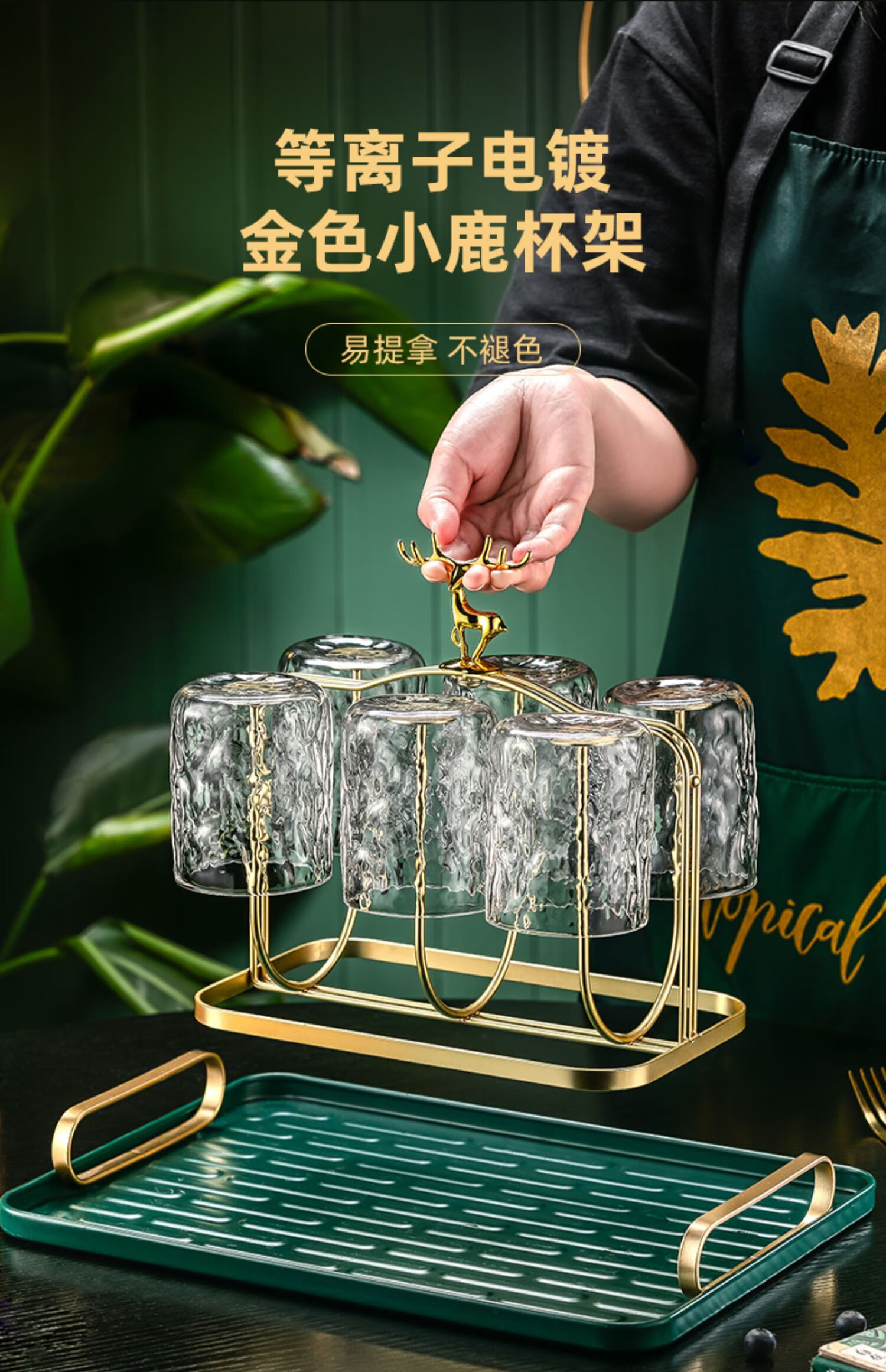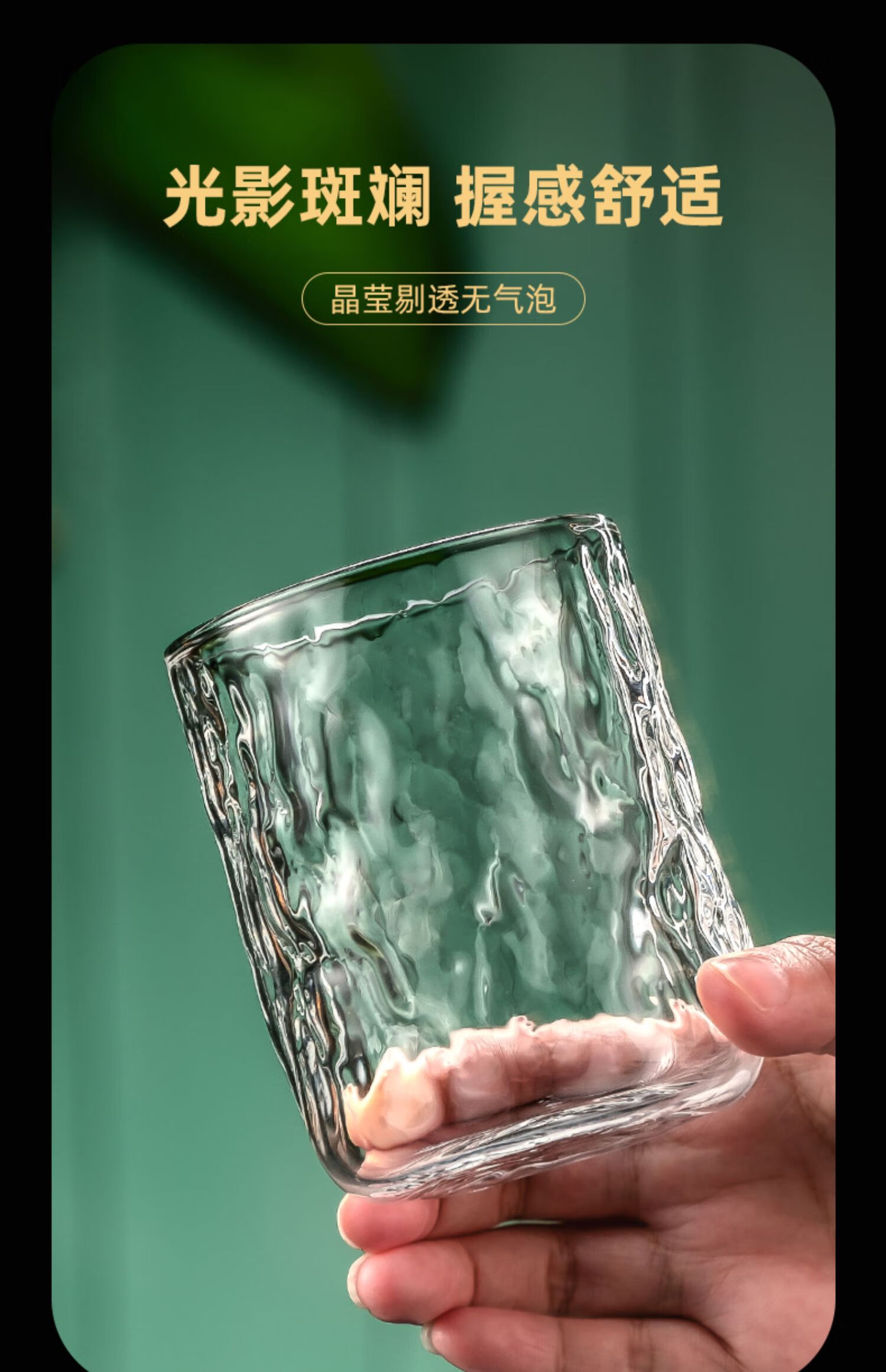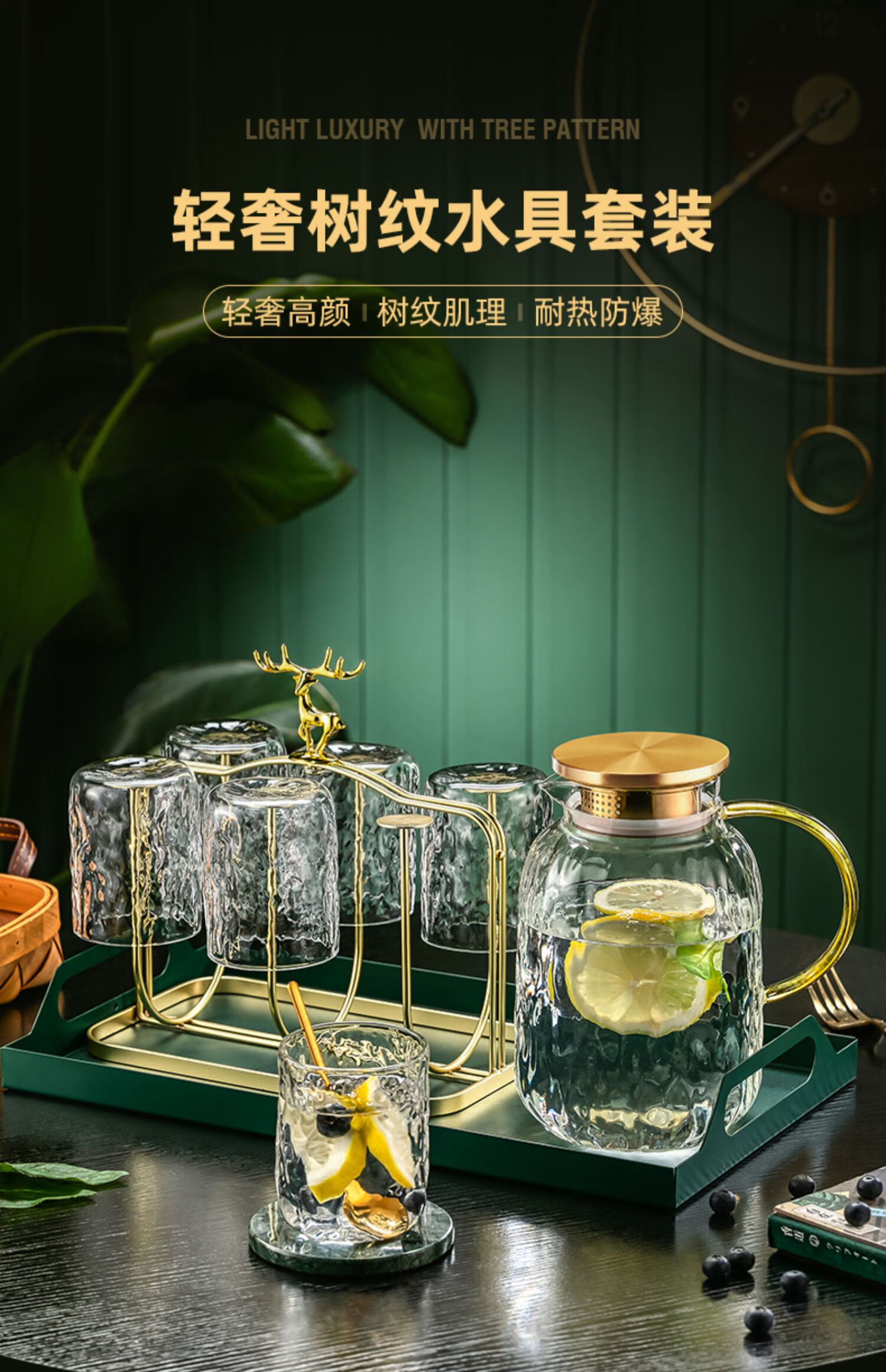 MIDOC light luxury glass water cup, home tea cup, high-looking bark pattern heat-resistant living room drinking cup set for entertaining guests, 6 tree pattern cups + gold frame + tree pattern pot + green tray