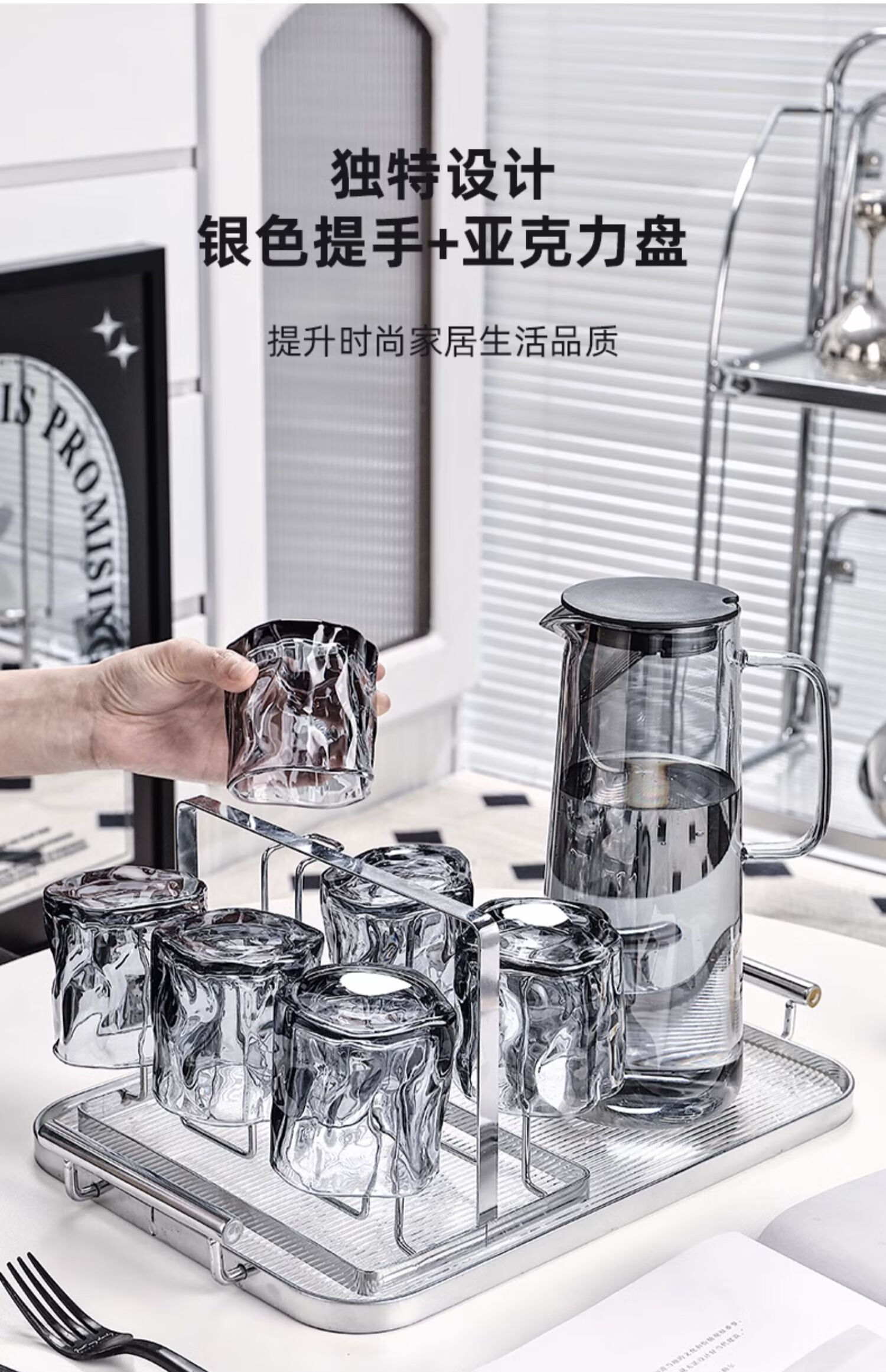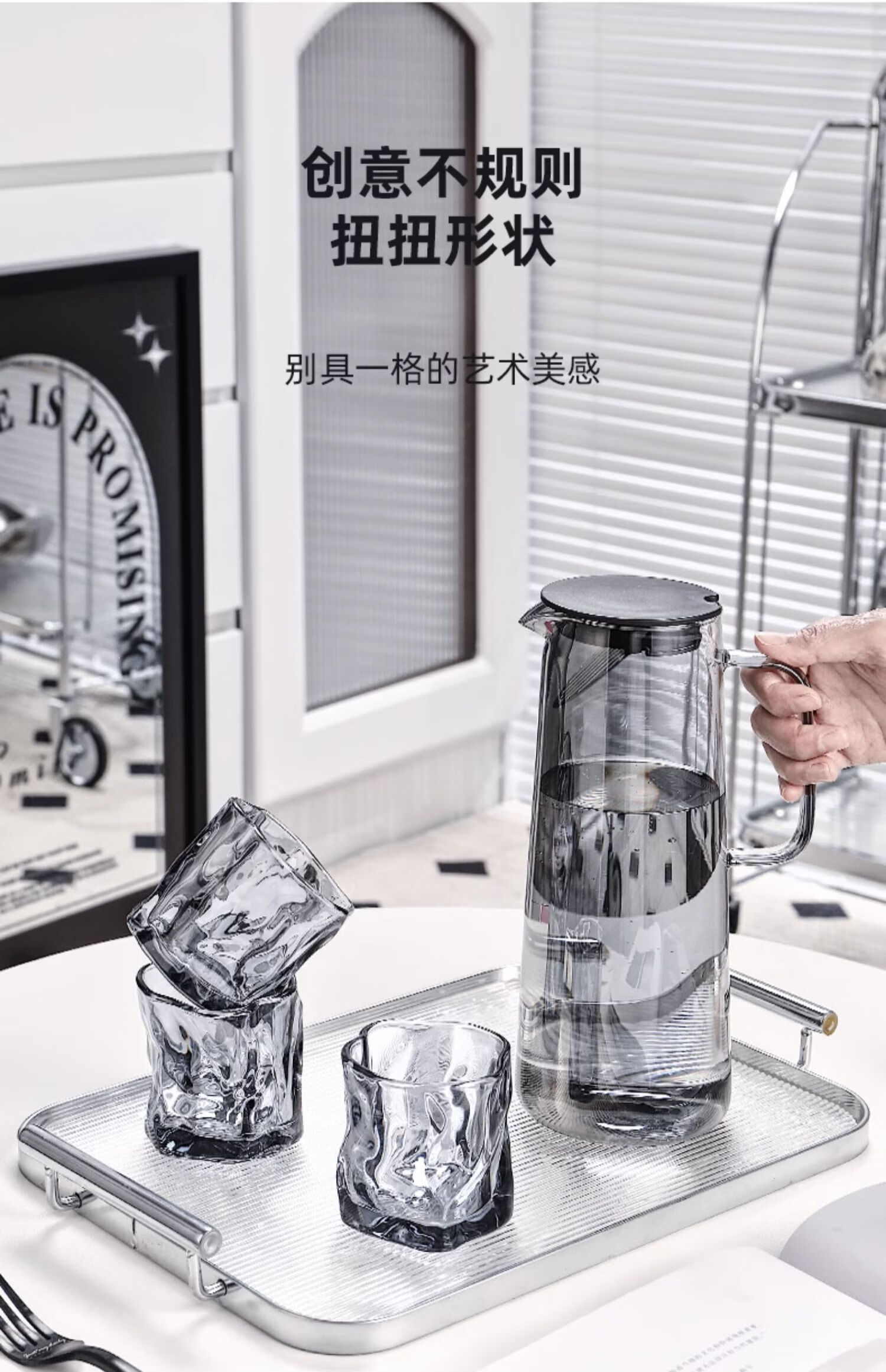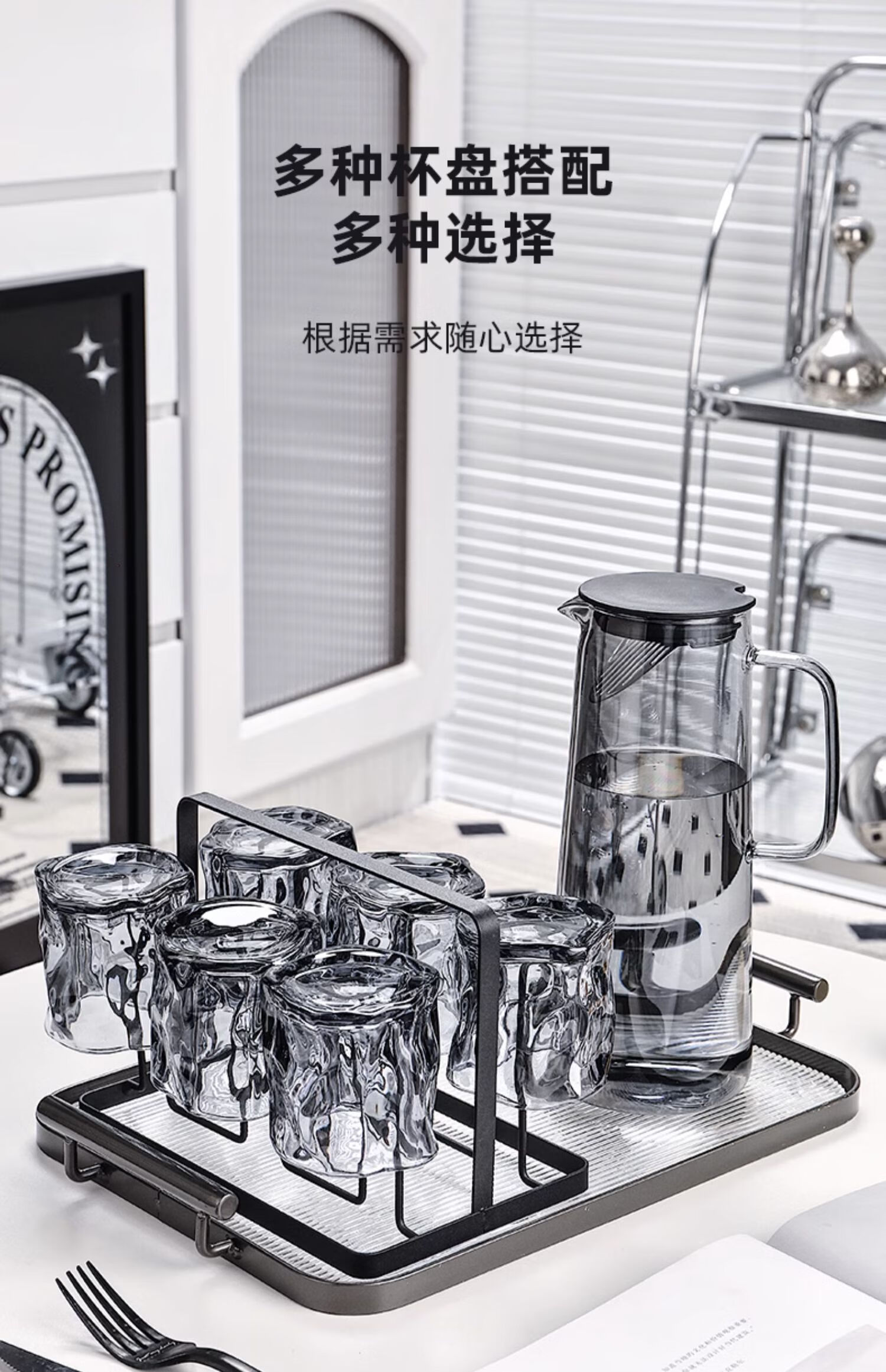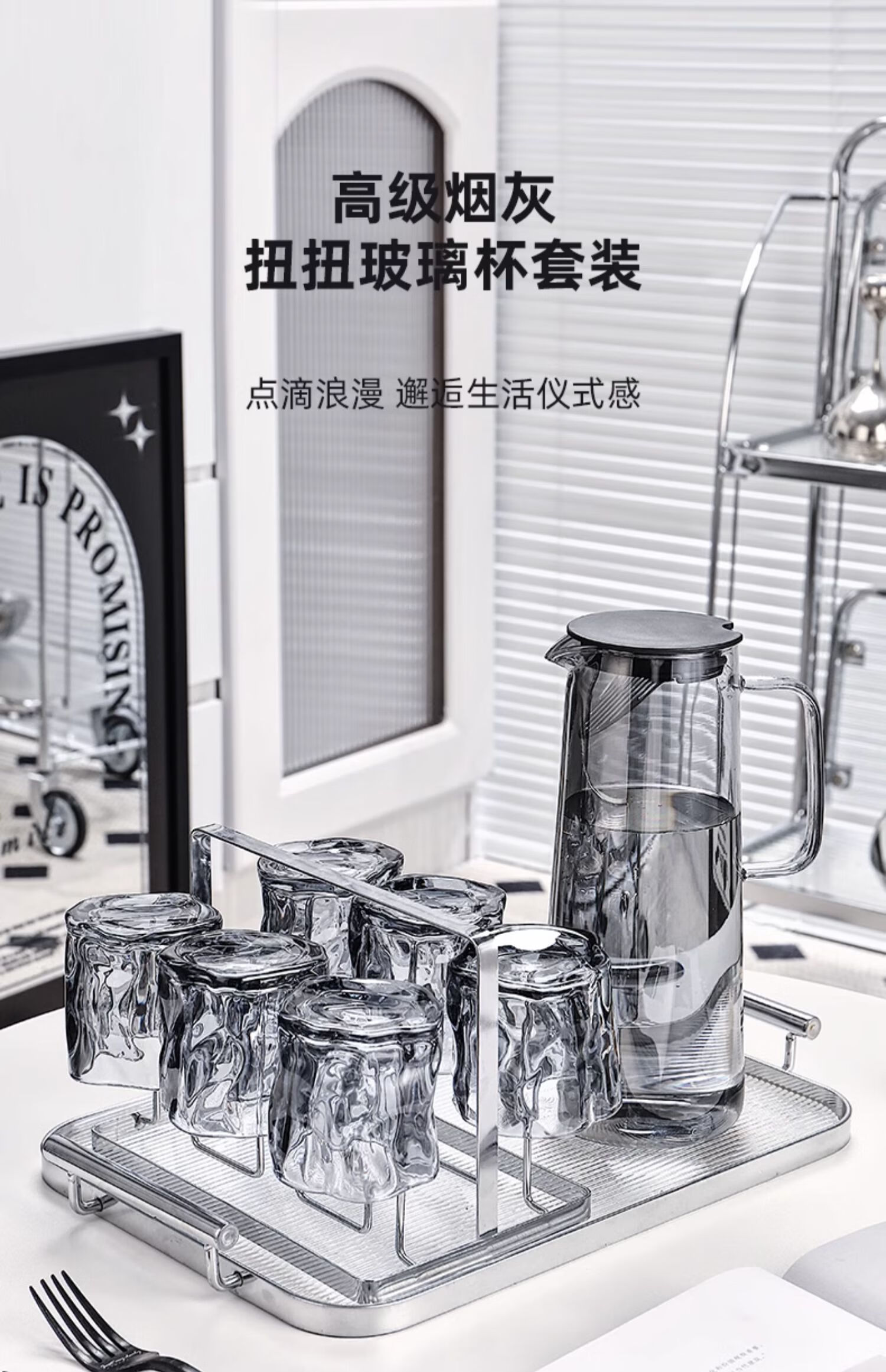 MIDOC glass cup, high-end home water cup set, living room room temperature tea cup, drinking cup, family tea cup set, cigarette ash twist 6 + black frame + black iron plate + gray triangle kettle