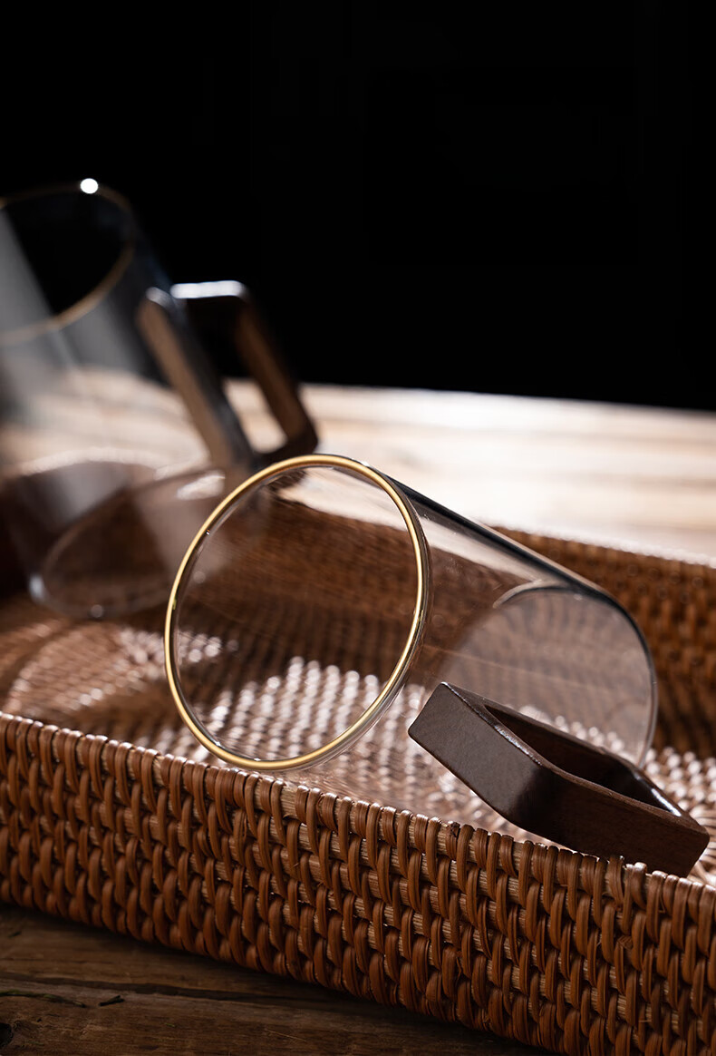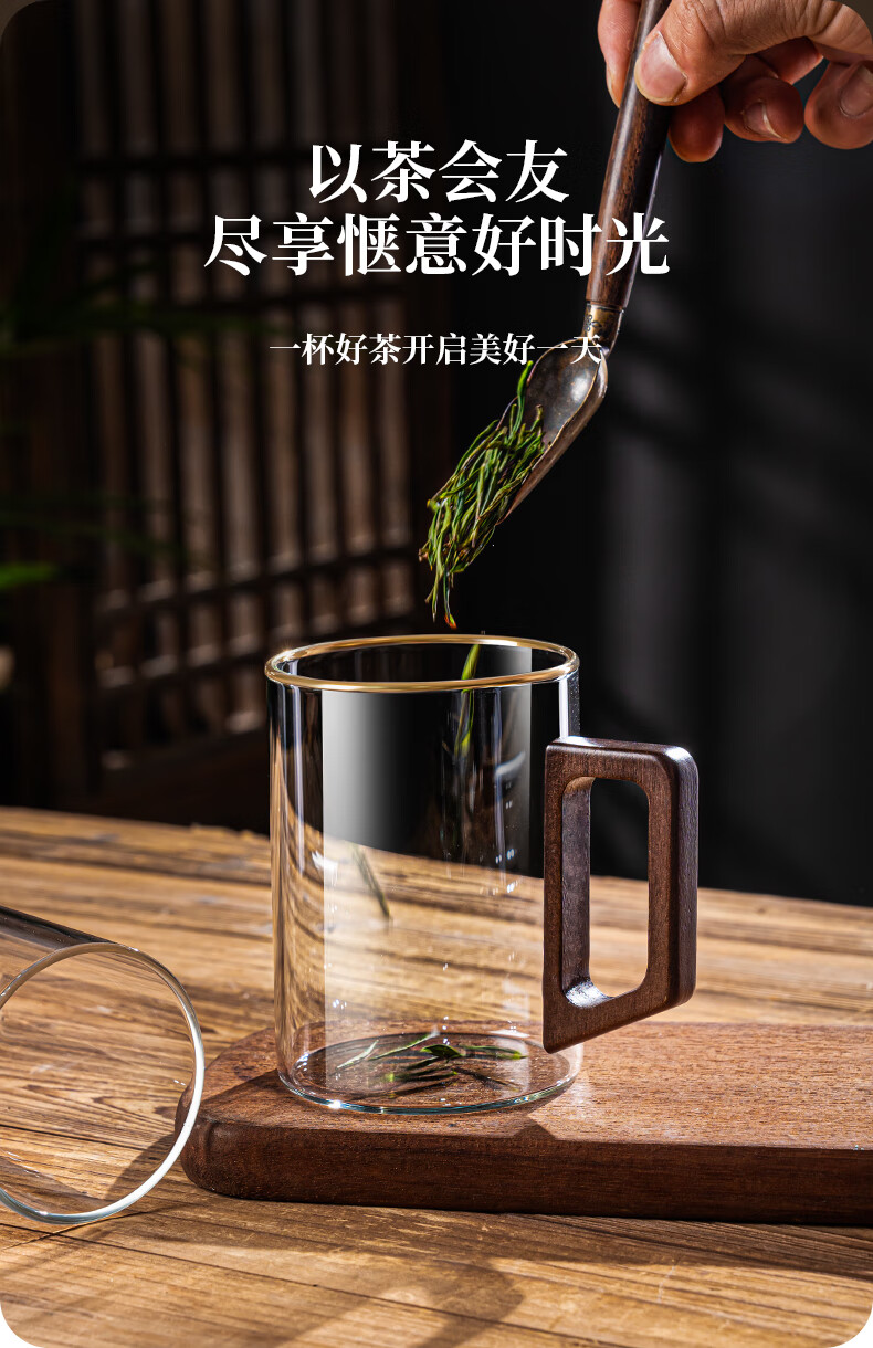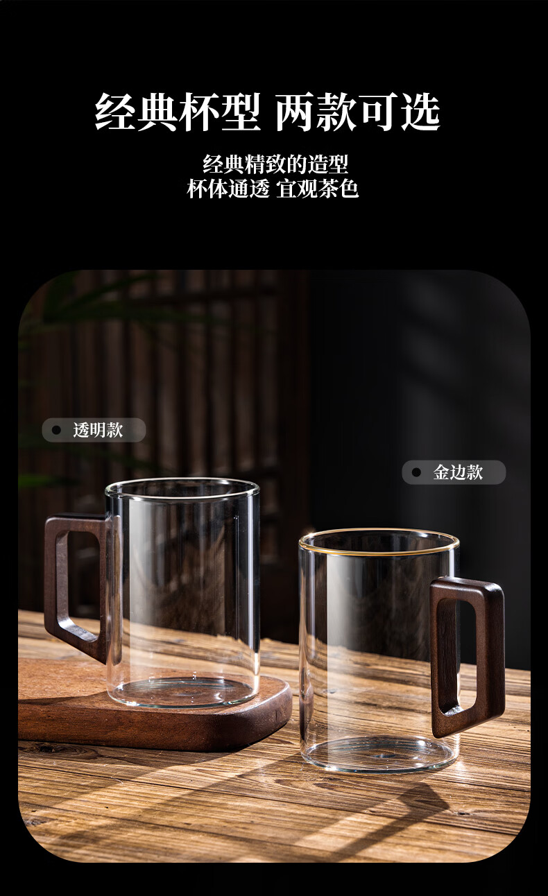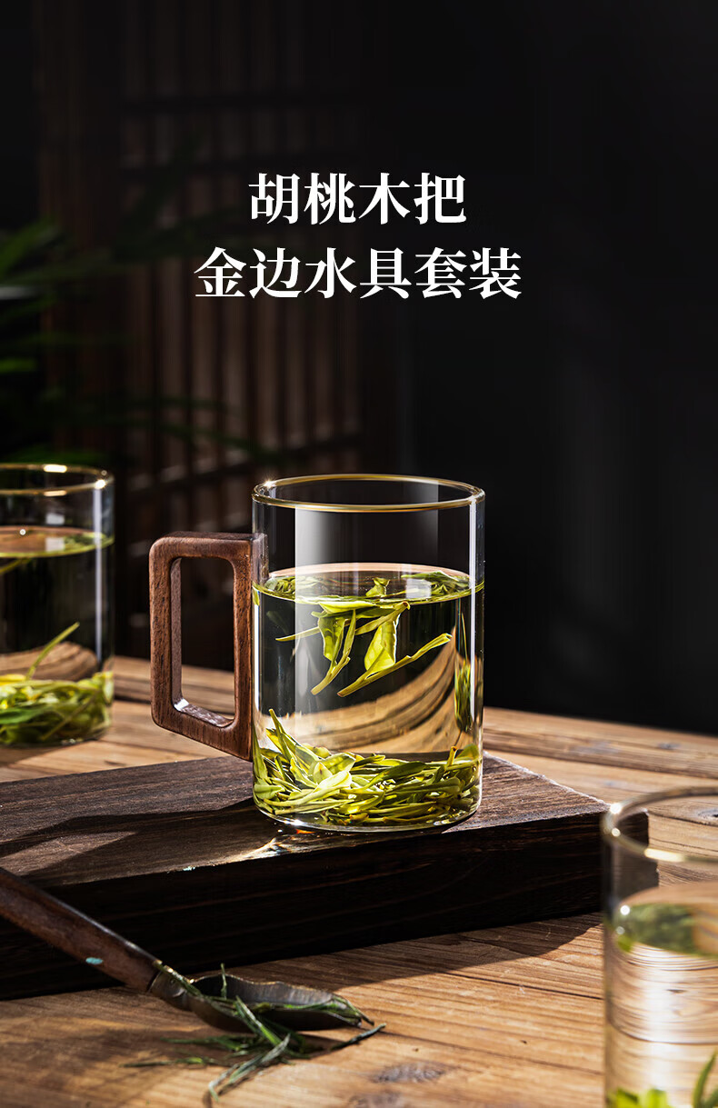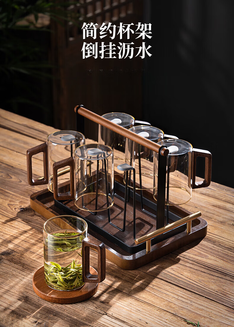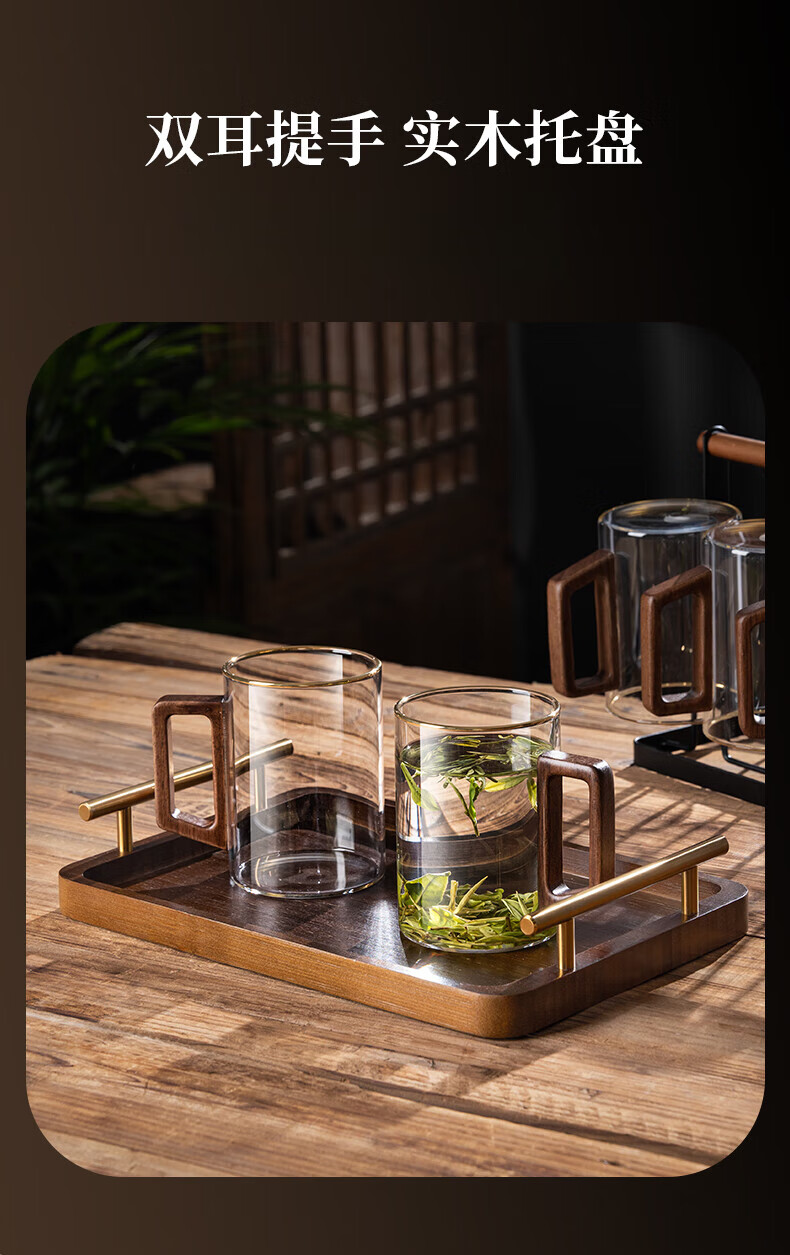 Pulian glass set for home living room green tea cup large capacity drinking cup Chinese style wooden handle 310ml walnut handle cup 6 pieces + cup holder + wooden tray