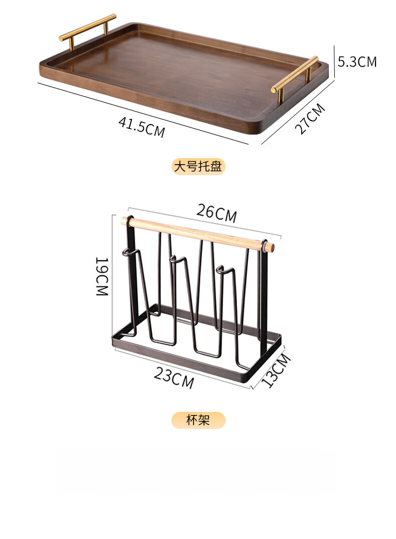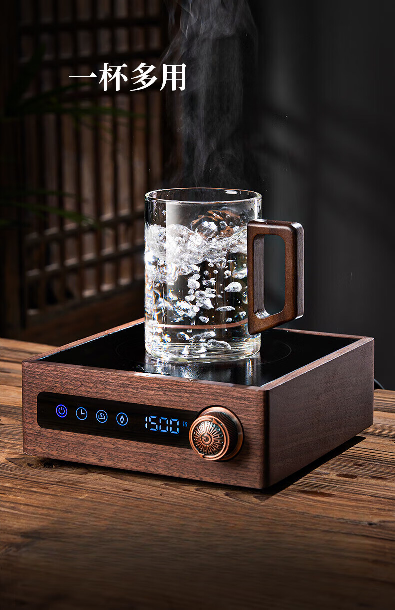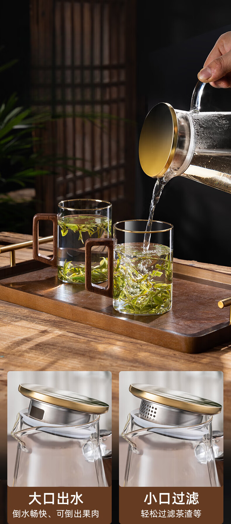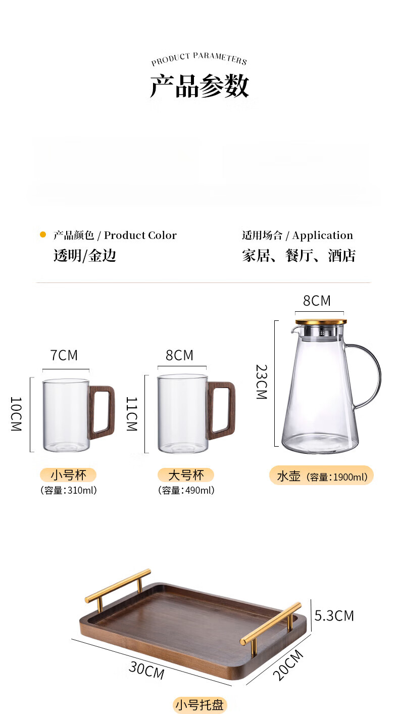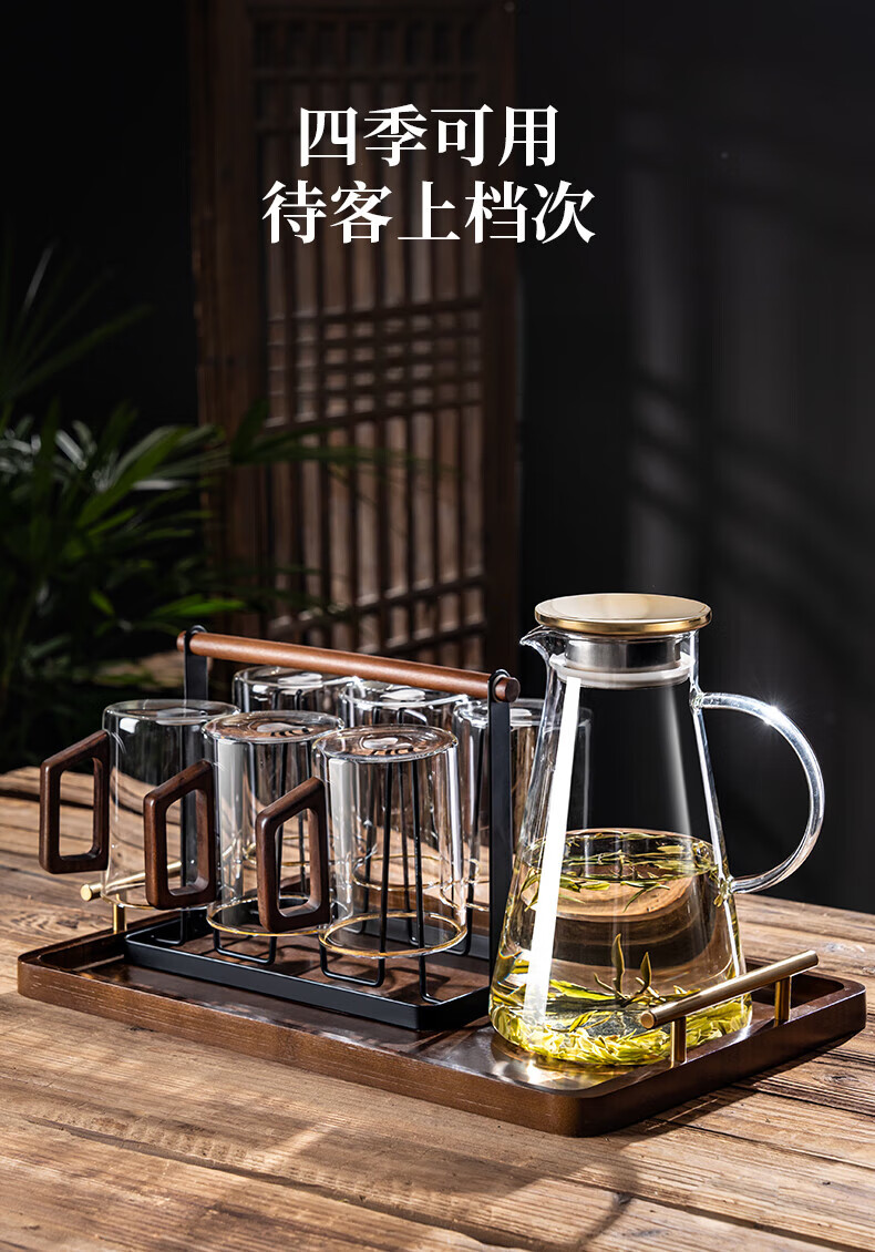 Pulian glass set for home living room green tea cup large capacity drinking cup Chinese style wooden handle 310ml walnut handle cup 6 pieces + cup holder + wooden tray