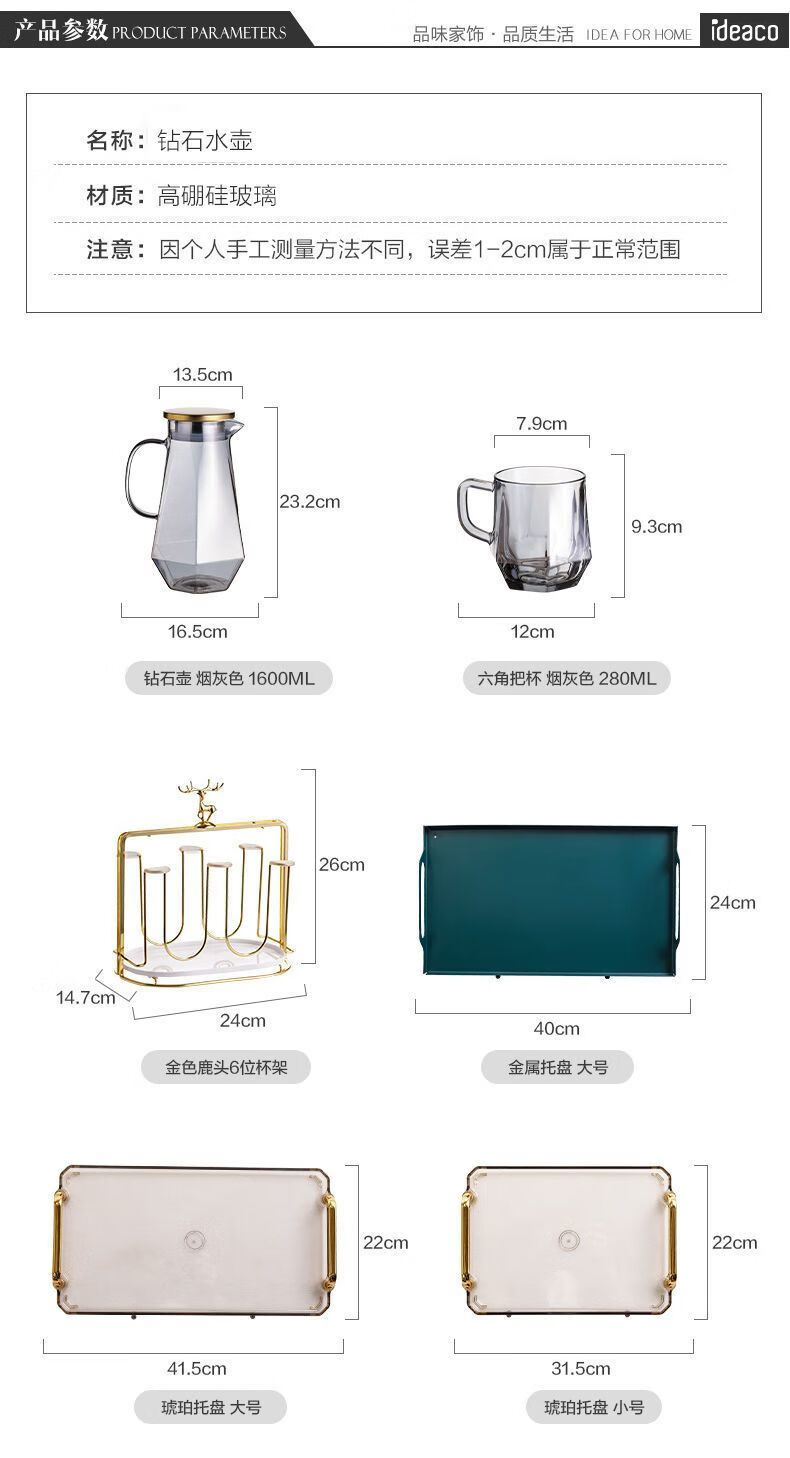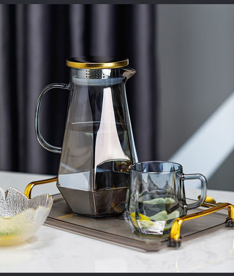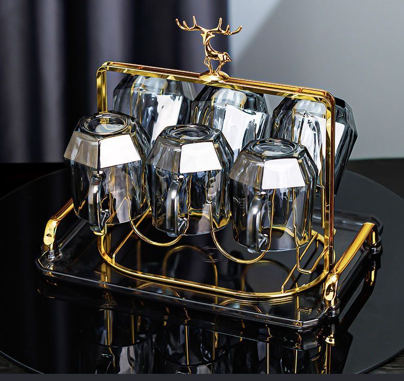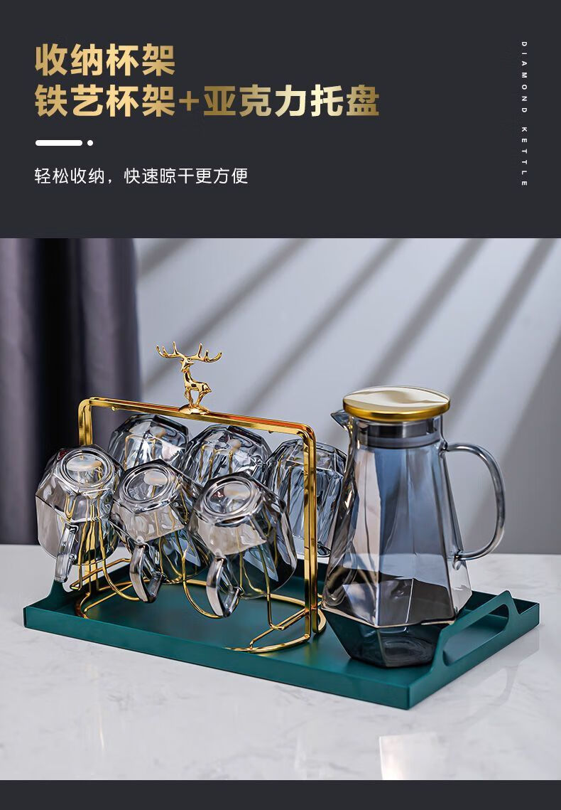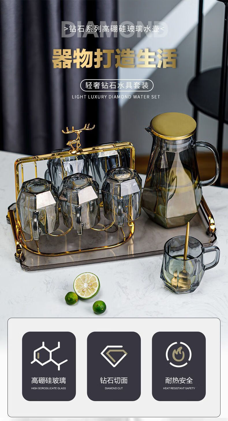 Enshousu simple Nordic style high temperature resistant cold kettle diamond glass water cup home set living room cold kettle cup cup holder diamond pot (elegant gray) + 6 cups + deer stand + tray