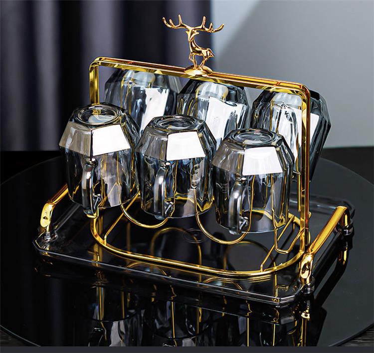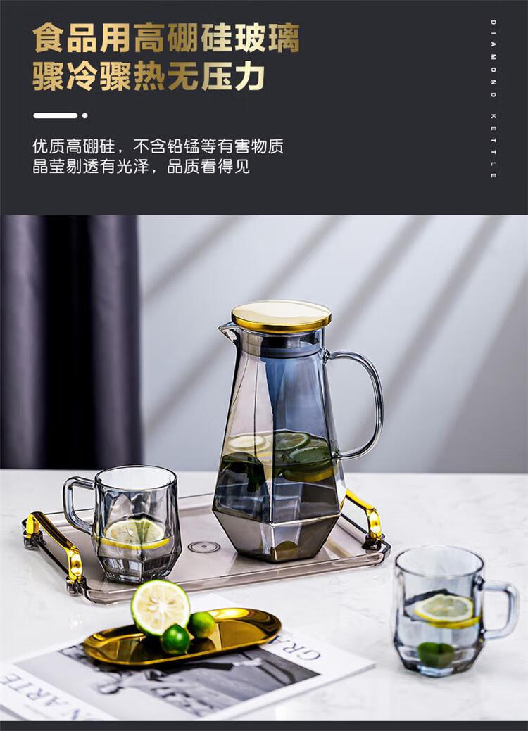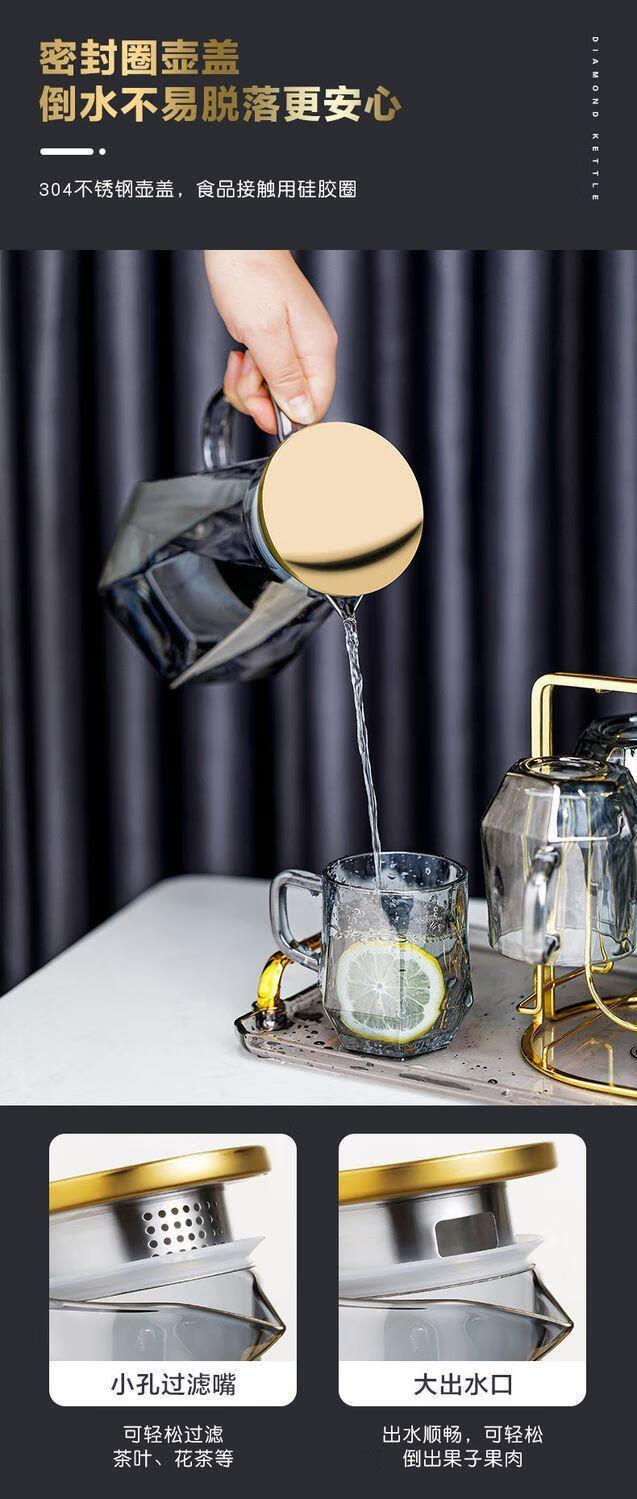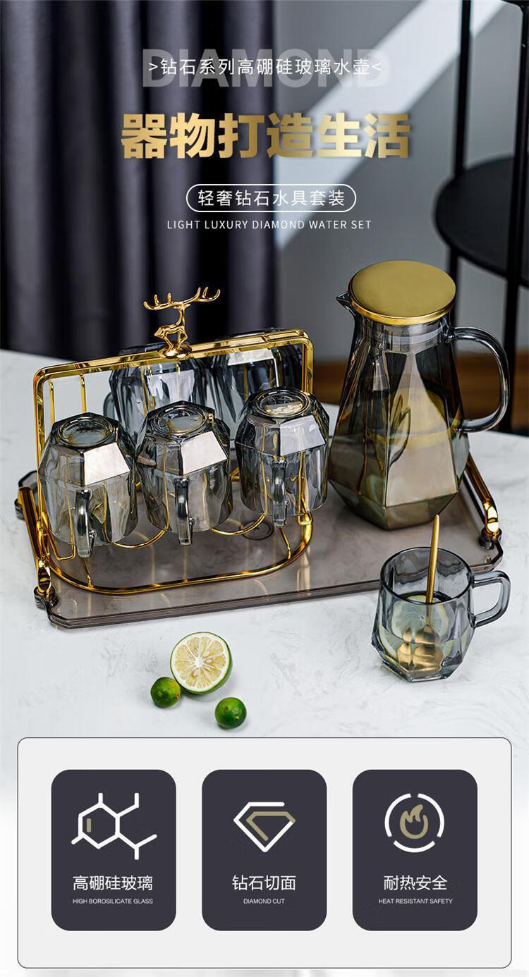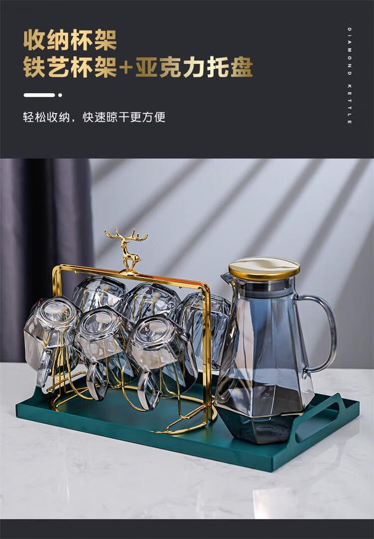 Cold kettle glass cup home set living room cold kettle cup holder light luxury high temperature resistant diamond kettle (elegant gray) + 6 cups + deer stand + tray