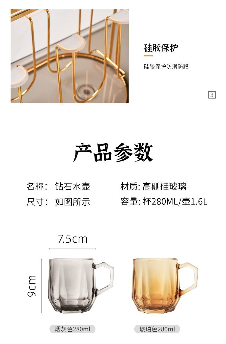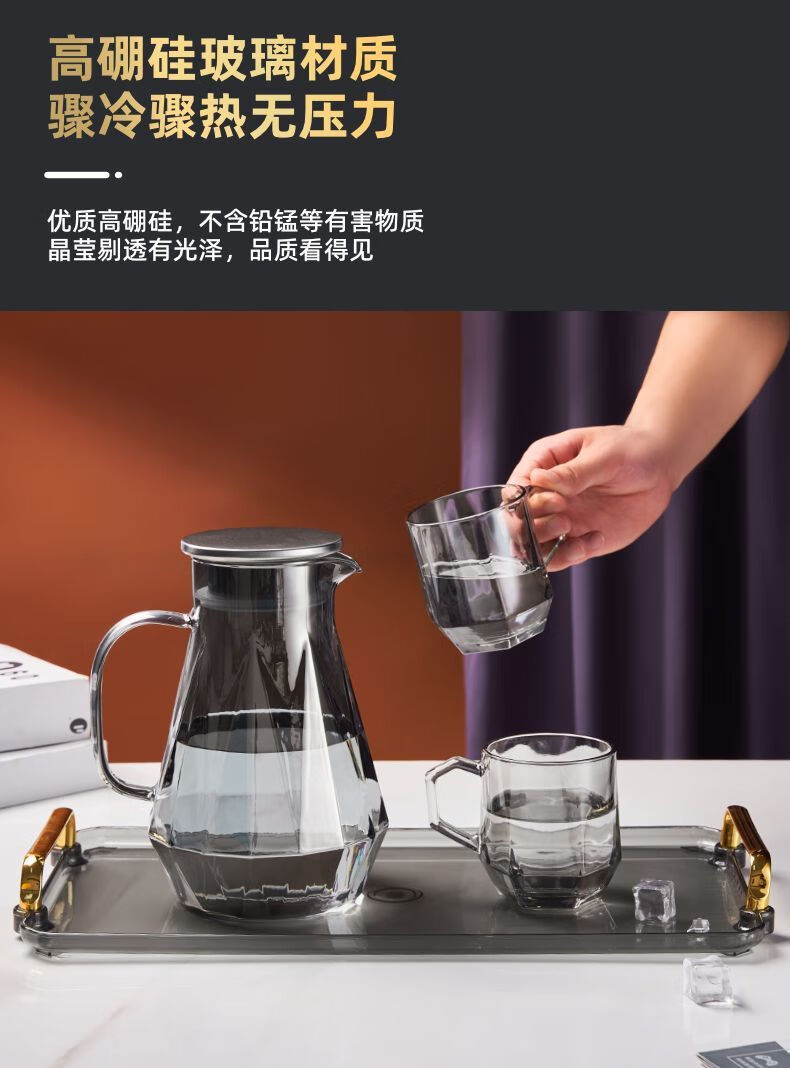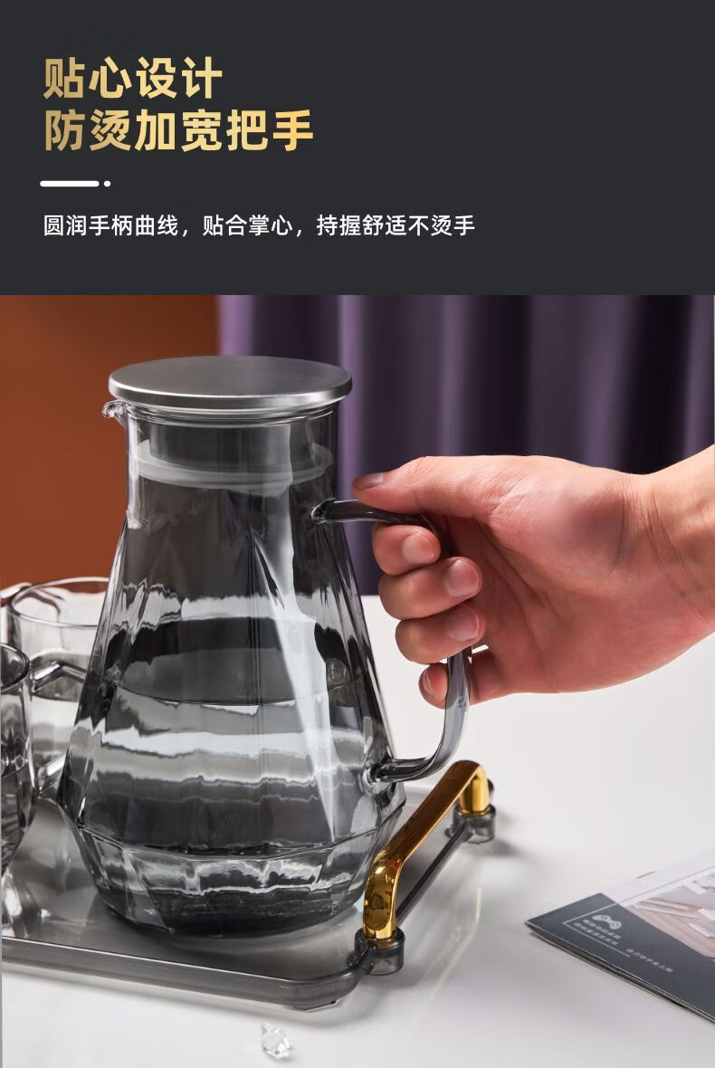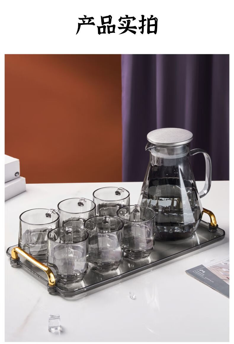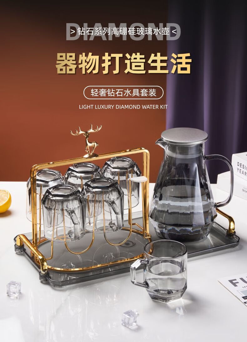 FANCYCHIC cold kettle diamond glass water cup home set living room cold kettle cup holder light luxury high temperature resistant smoke gray high temperature resistant electric ceramic stove diamond kettle + six diamond handle cups home set