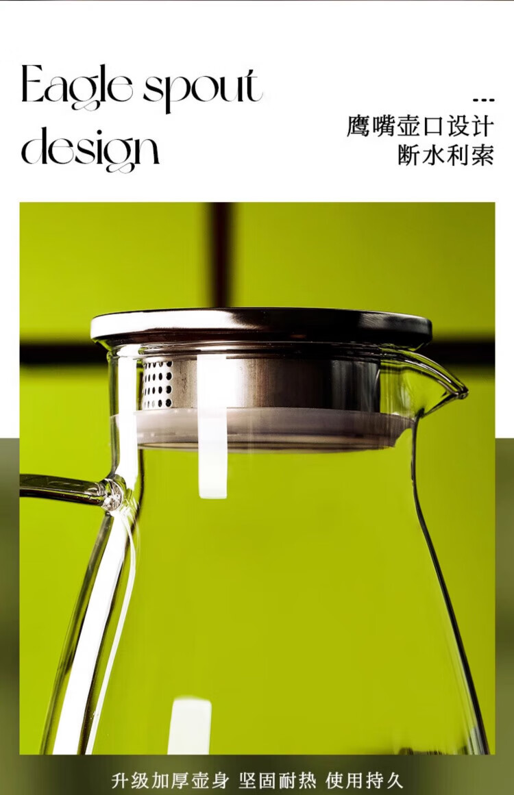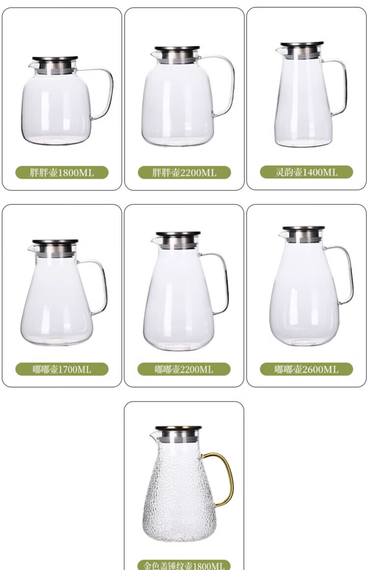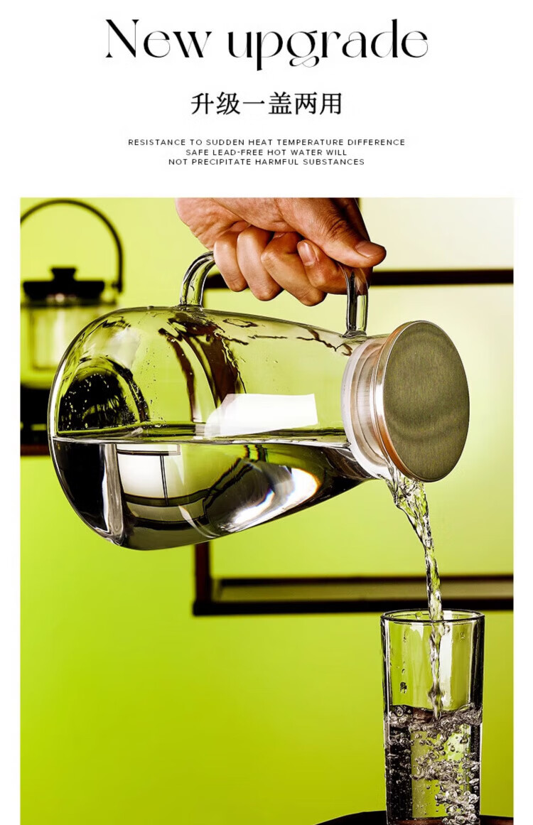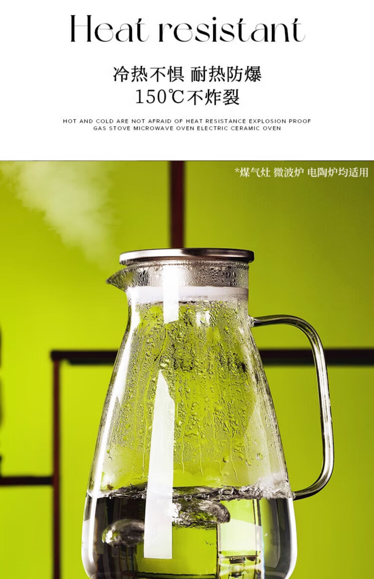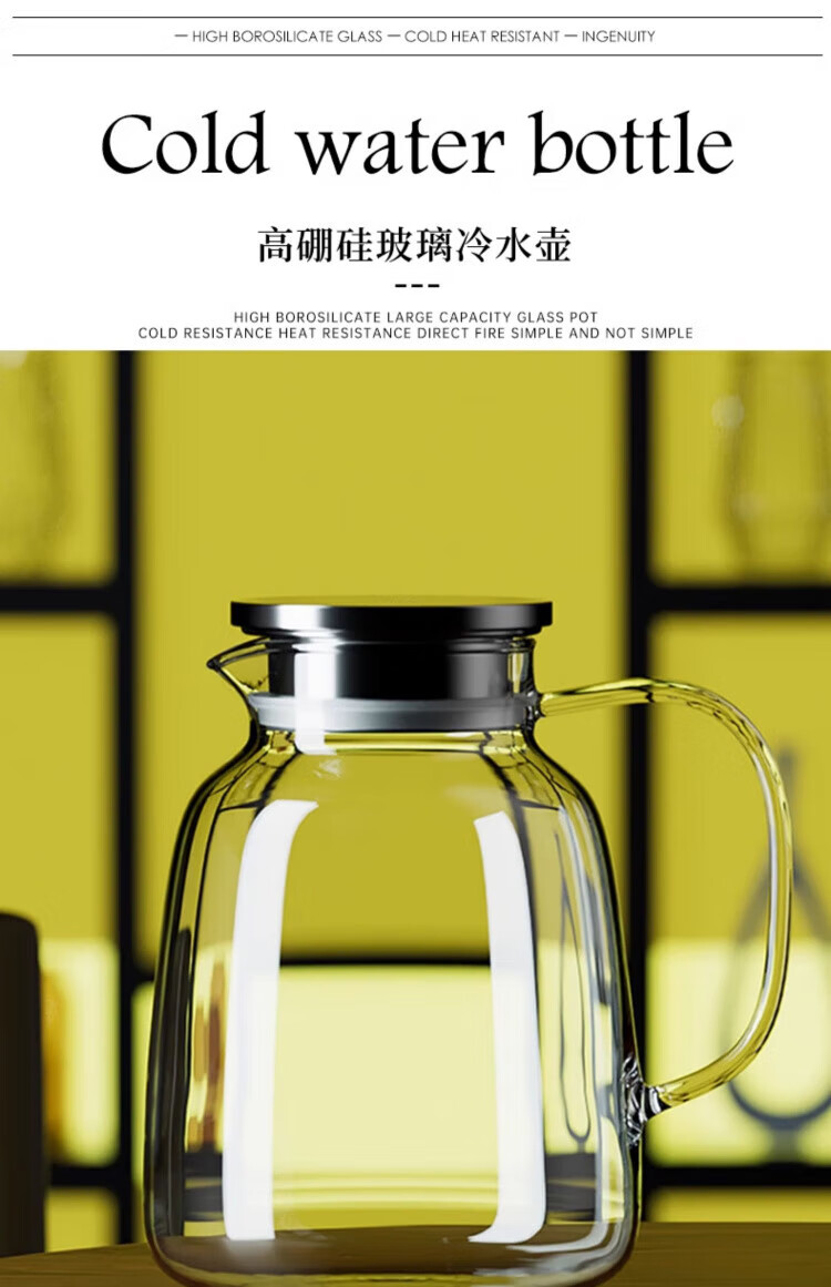 Yaofeng large-capacity heat-resistant high borosilicate glass kettle, high-temperature-resistant household cold water cup, teapot, boiling water bottle, cold water kettle, 50% thickened glass, fat pot 1.8 liters + dual-purpose steel lid