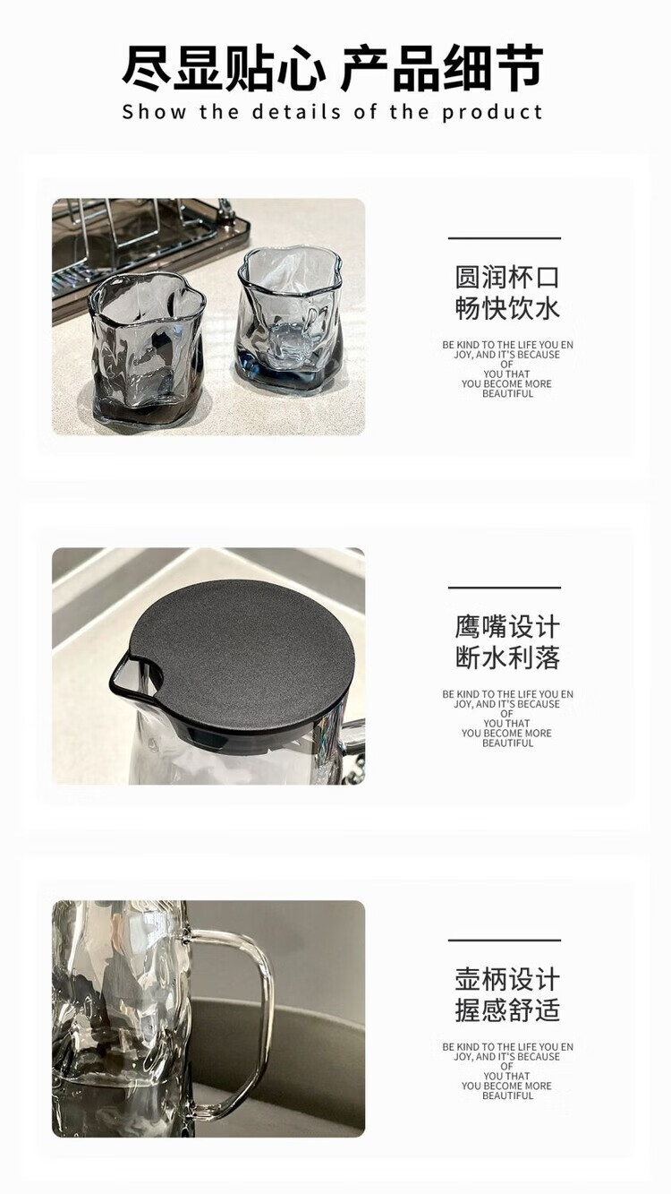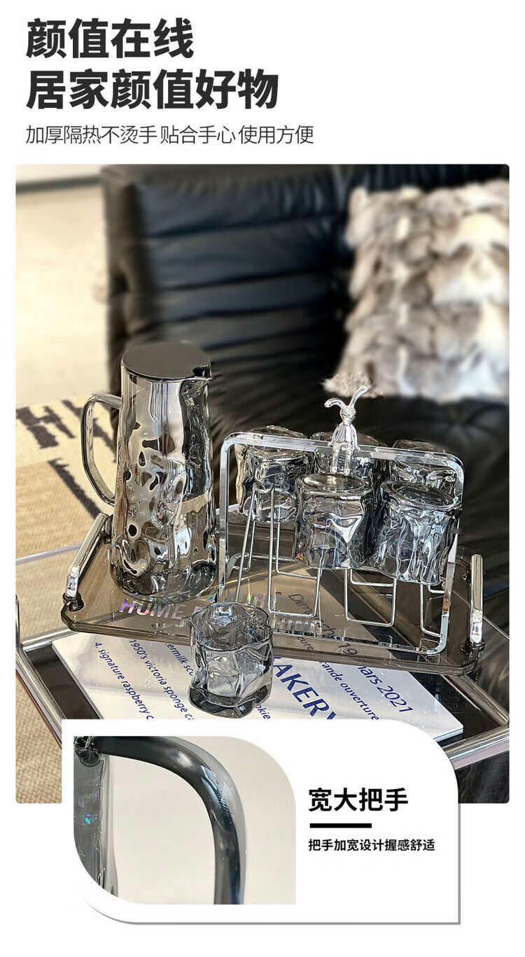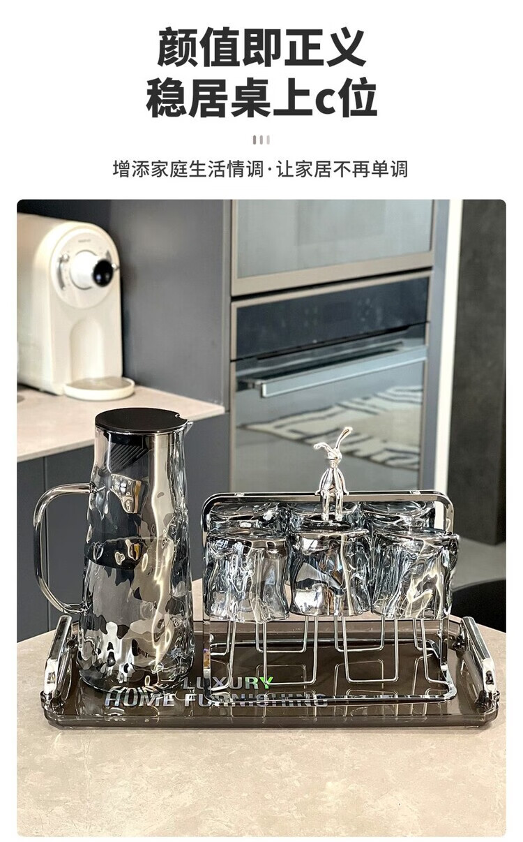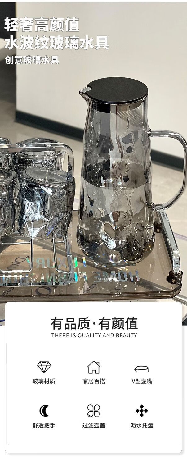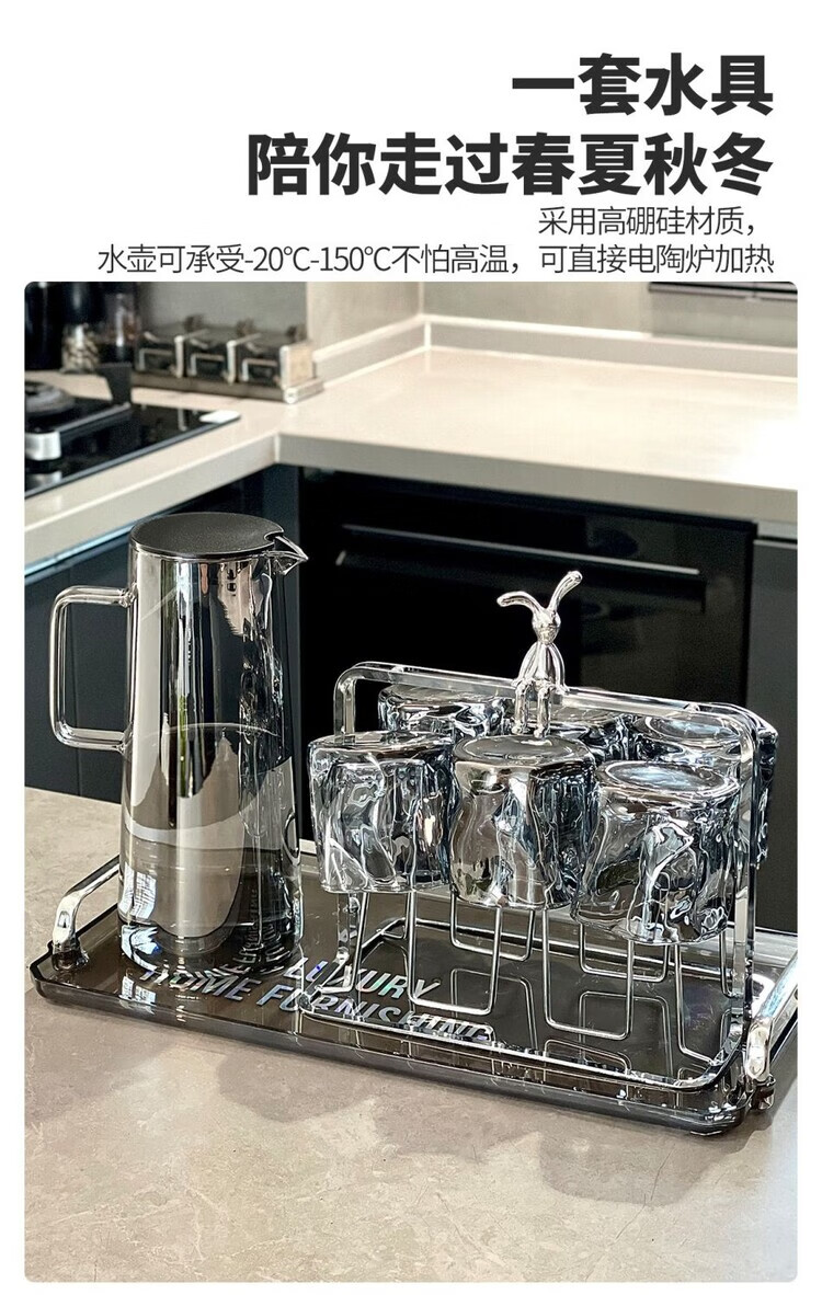 Renowned Nordic Feng Shui set household cold kettle glass living room drinking cup family hospitality tea cup high-end 1 glacier pot + 6 ice pattern cups + tray + cup holder