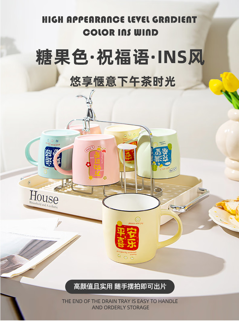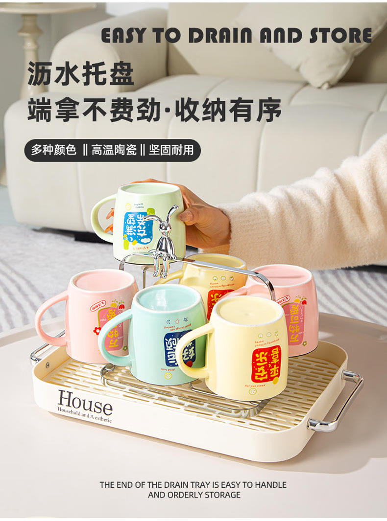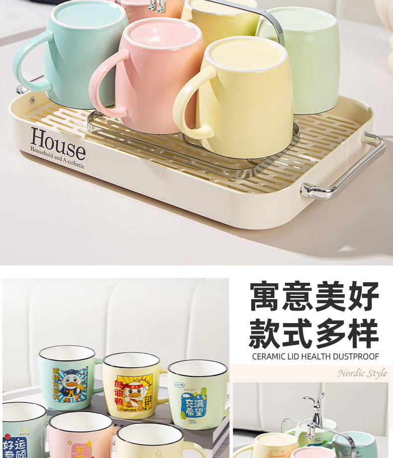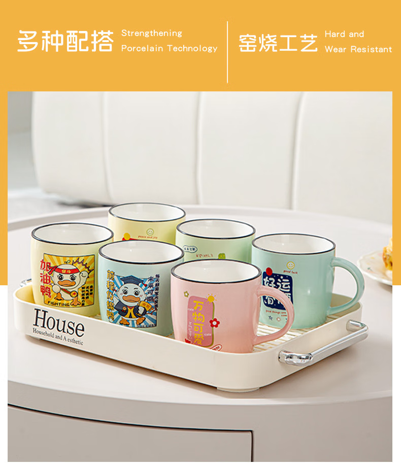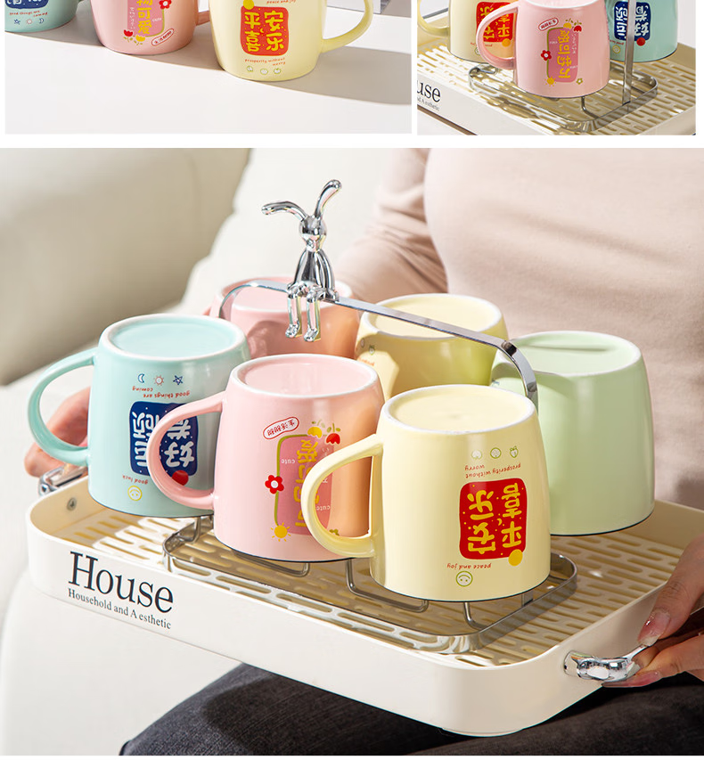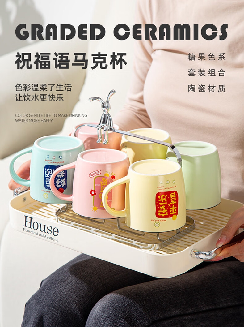 Fantasy housewarming new home living room family cup cup holder household drinking water family ceramic cup water cup set high blessing style 6 cups (6 patterns) handle drain tray