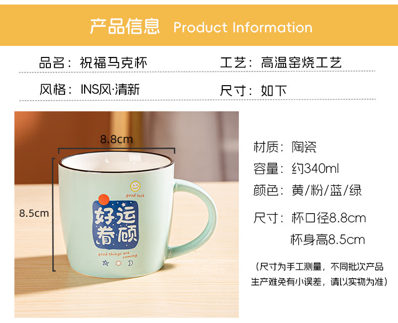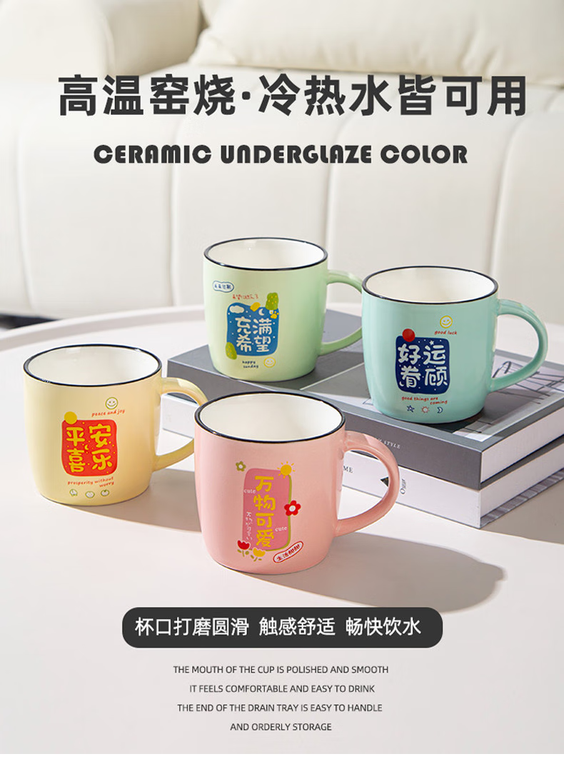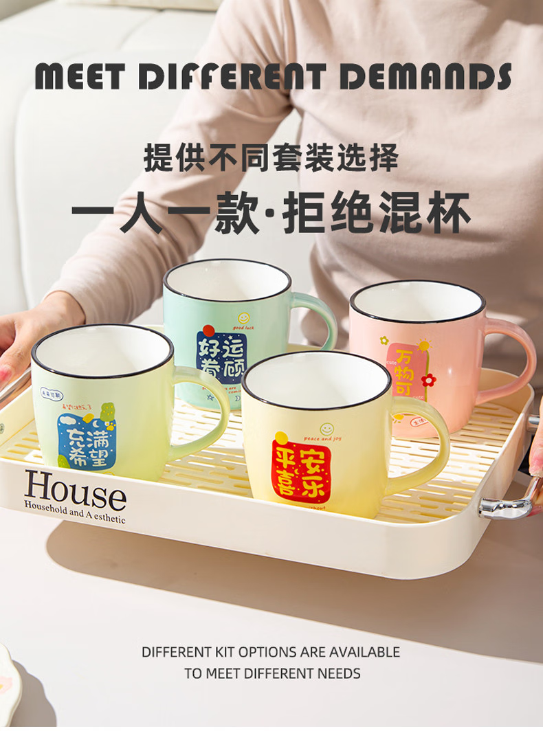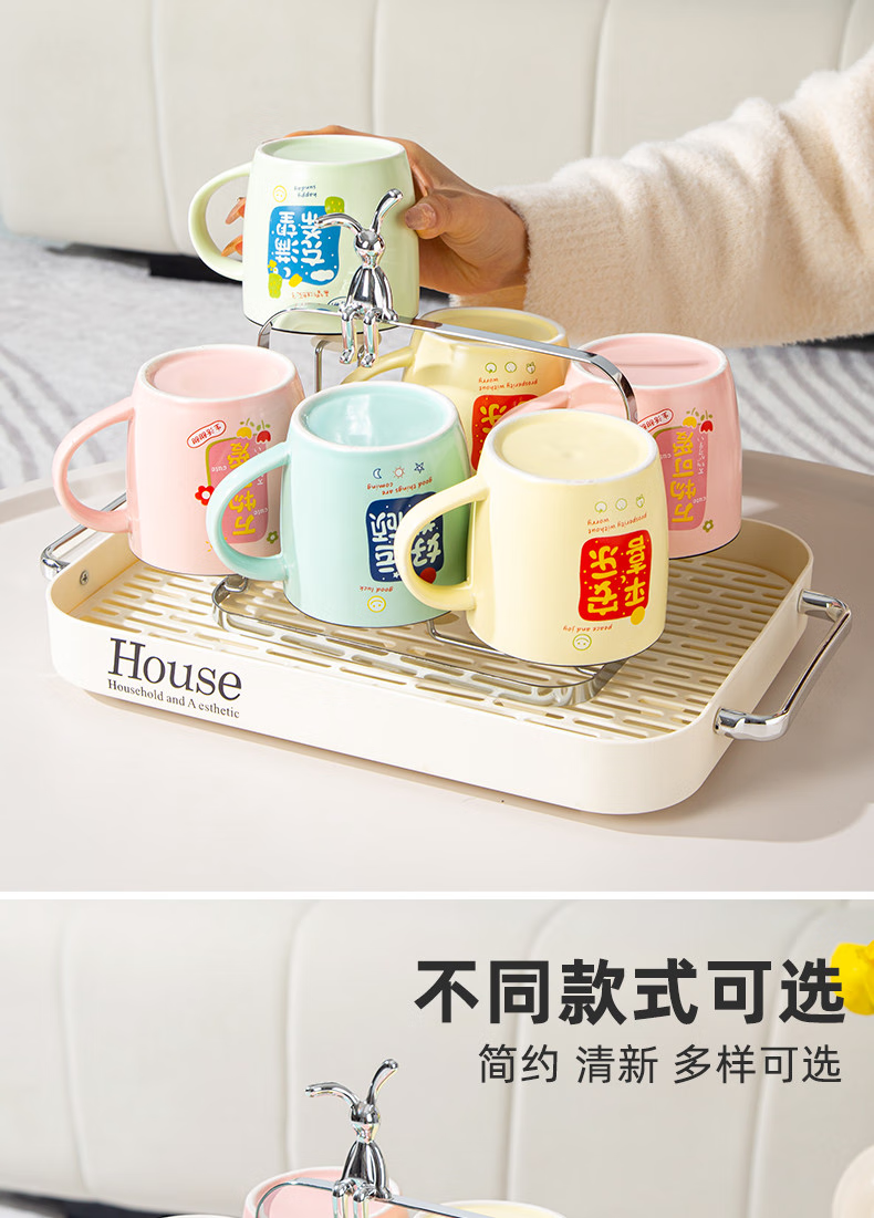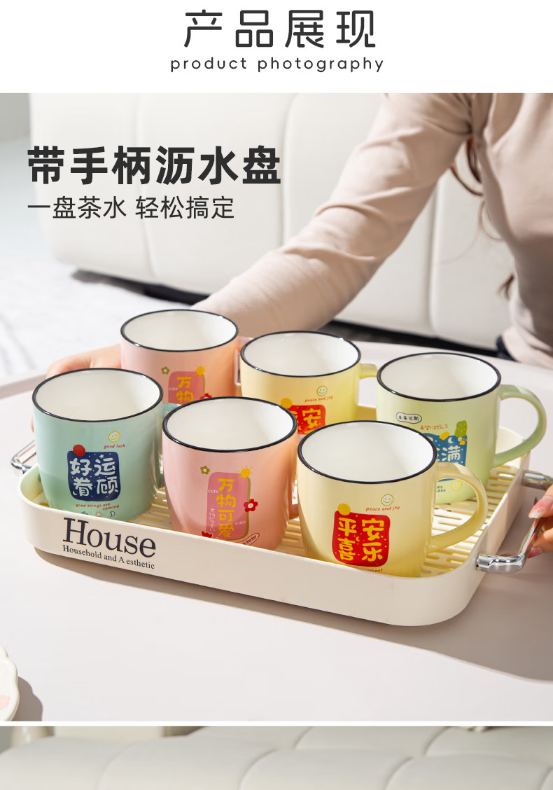 Fantasy housewarming new home living room family cup cup holder household drinking water family ceramic cup water cup set high blessing style 6 cups (6 patterns) handle drain tray