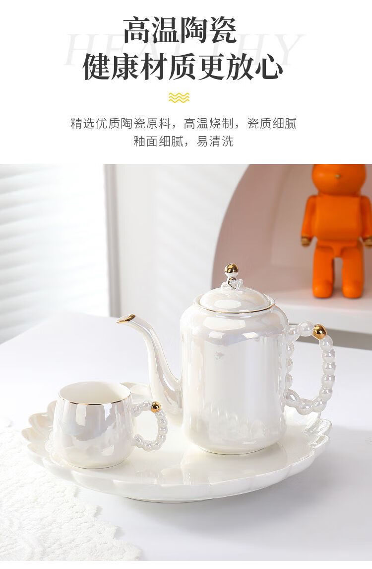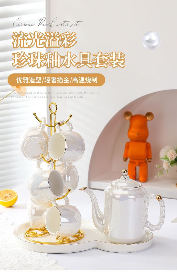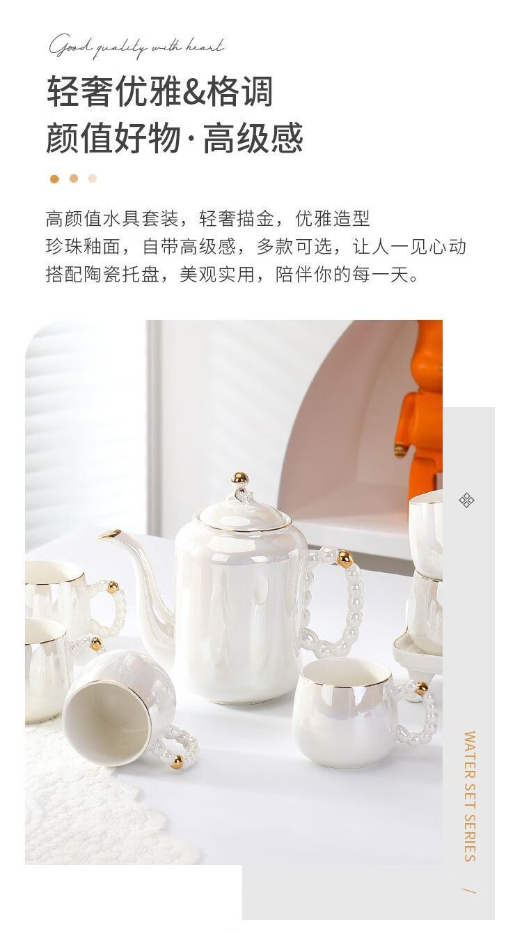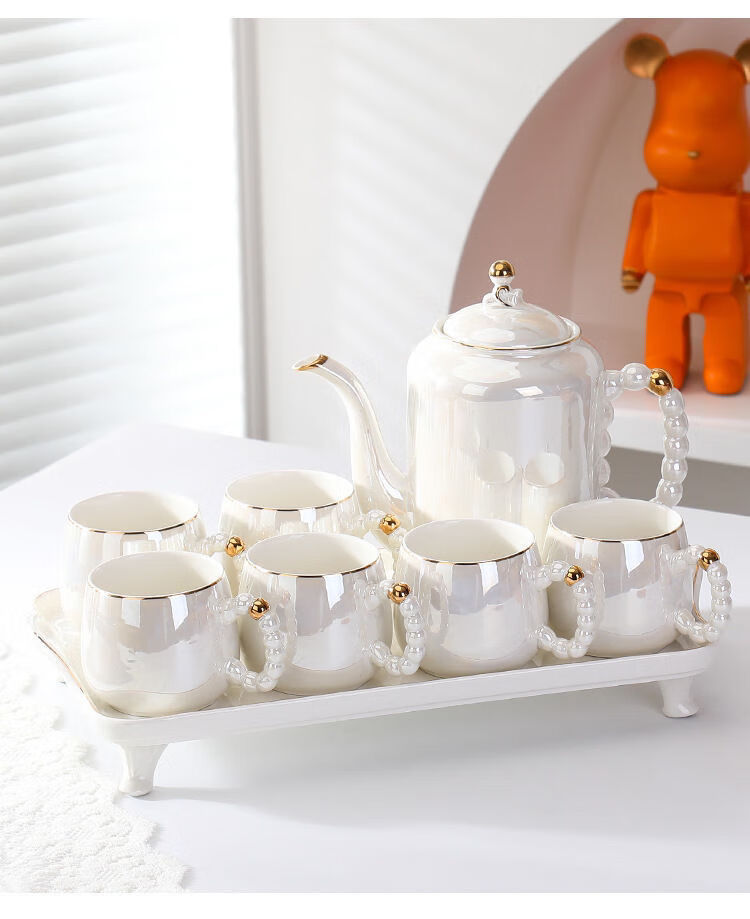 Cool season light luxury high-end housewarming ceramic water set tea cup household tea set Nordic living room teapot cup water cup complete set pearl high-end white 6 cups