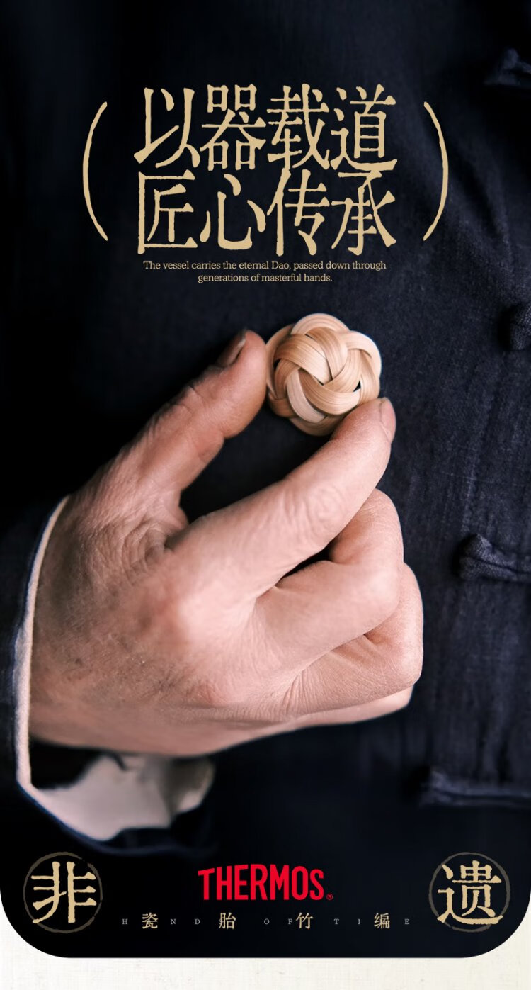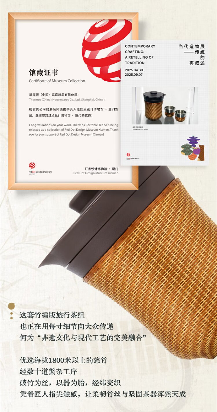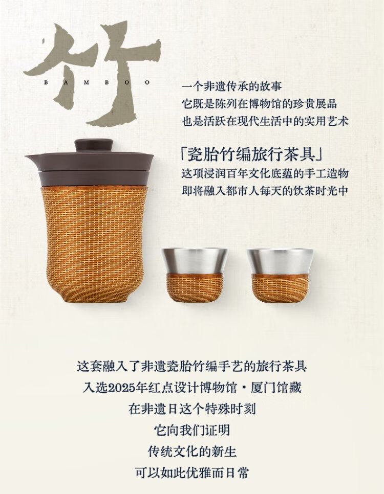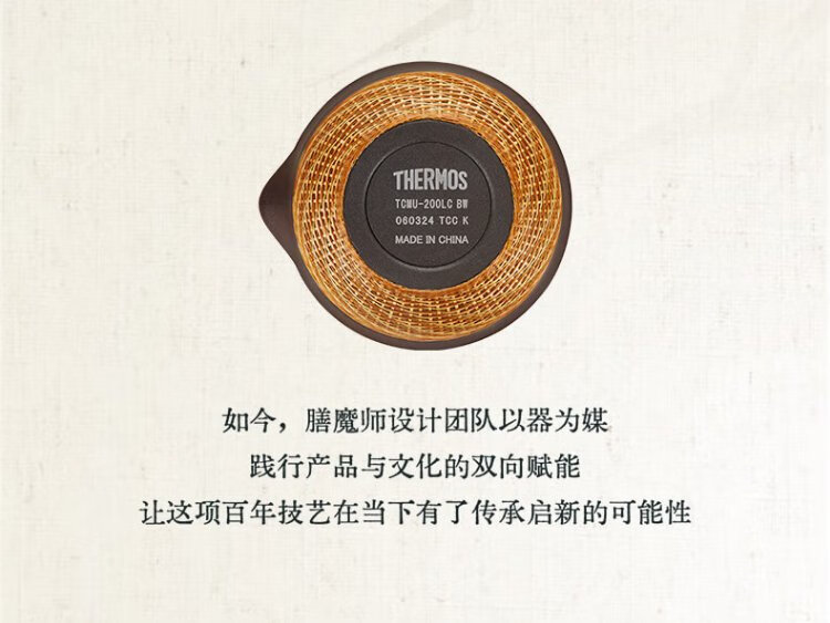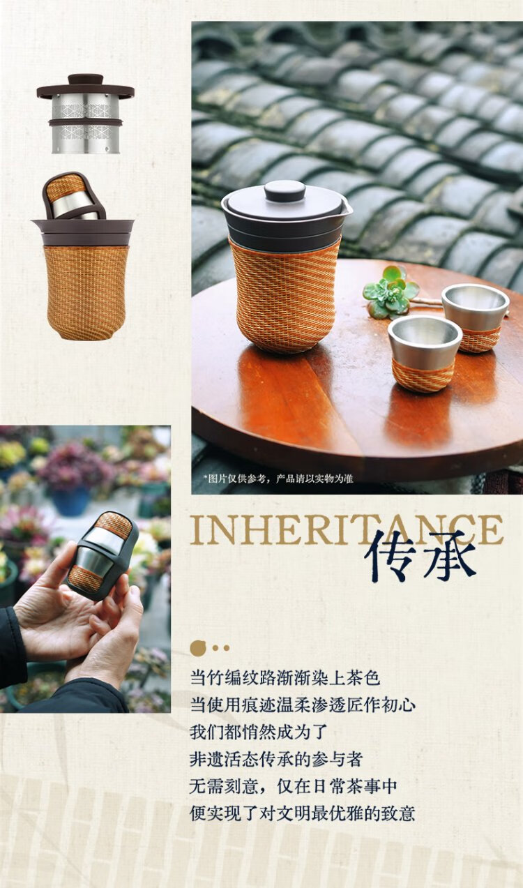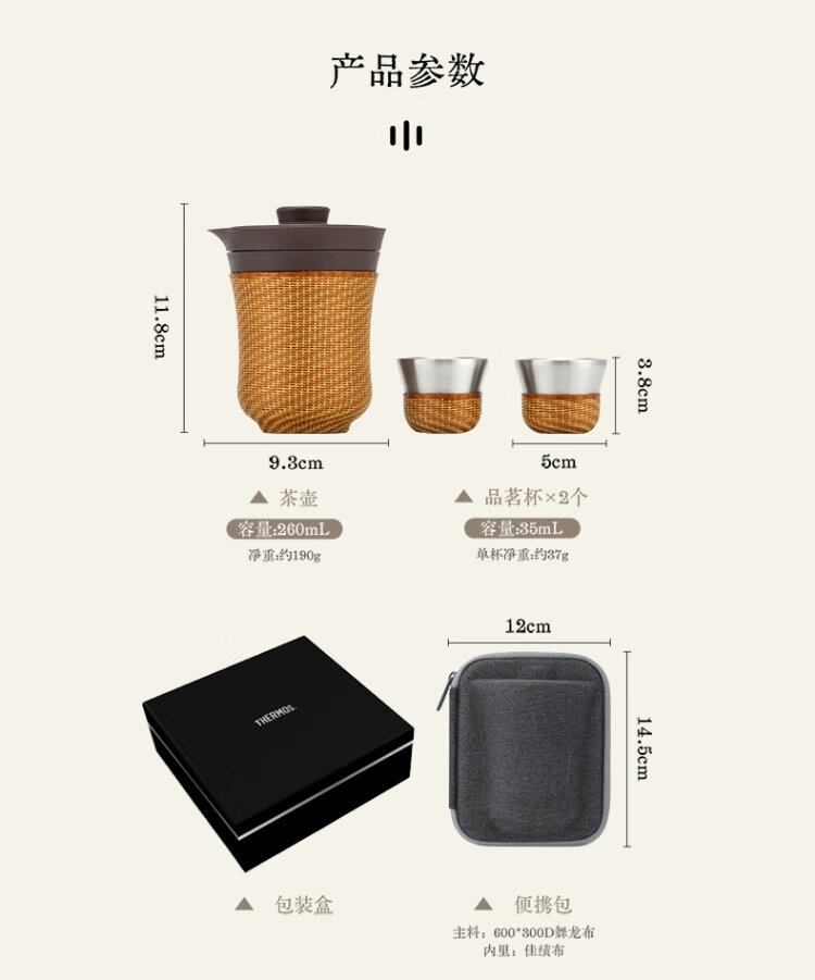 Thermos Travel Tea Set Outdoor Camping Portable Teapot Teacup Set Intangible Cultural Heritage Porcelain Body Bamboo Woven Holiday Gift TCMU Coated Liner Matte Brown (No Base Version)