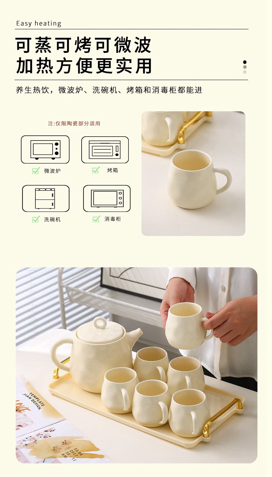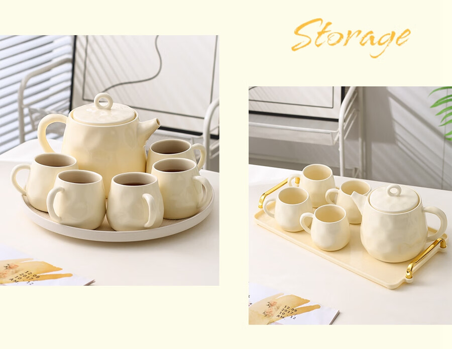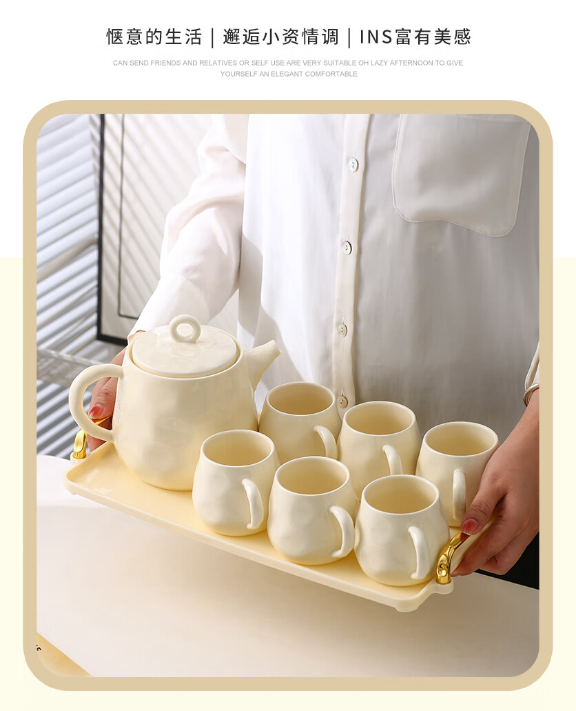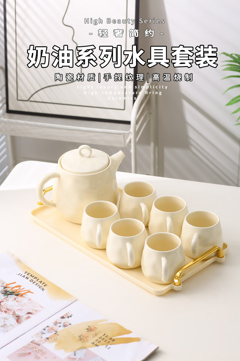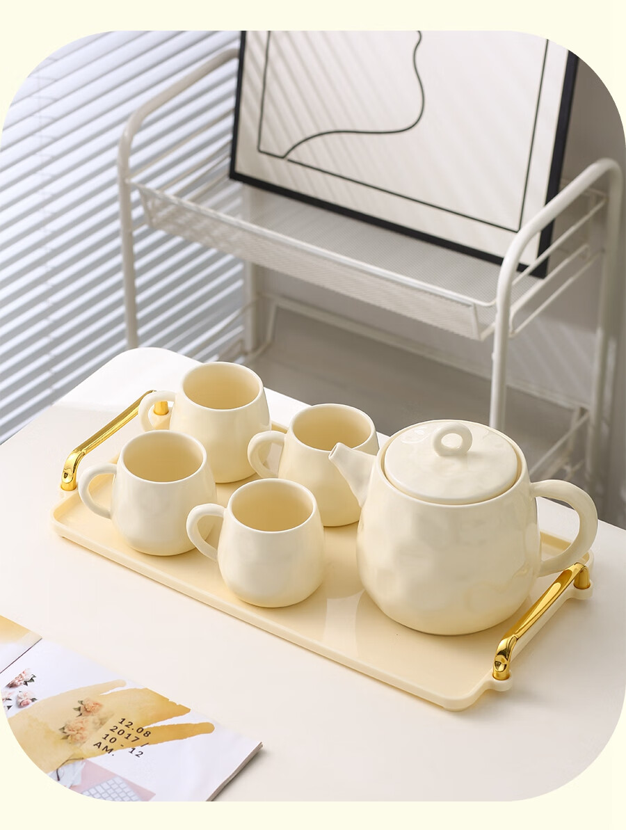 Light luxury household water set with tray, ceramic set, cup, family set, living room teacup, tea set, flower teapot, milky white, 1 pot, 6 cups + tray