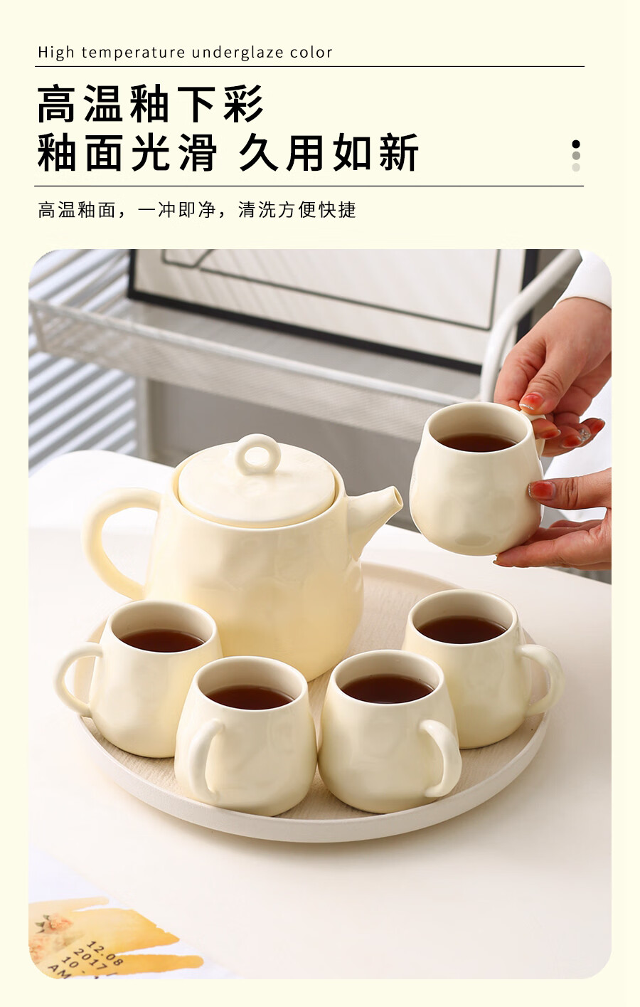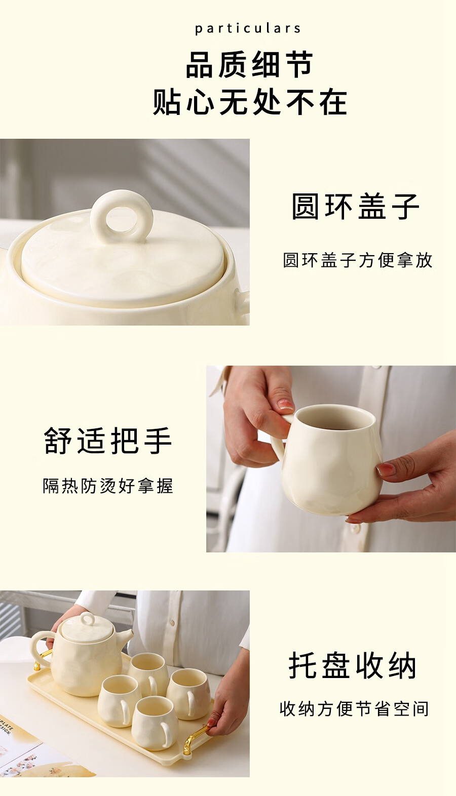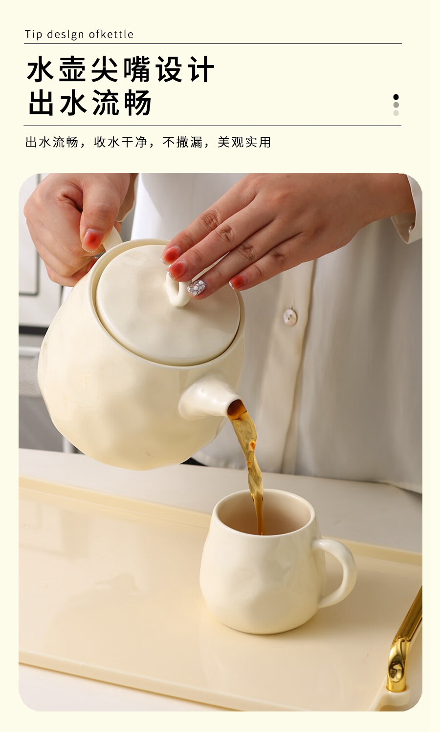 Light luxury household water set with tray, ceramic set, cup, family set, living room teacup, tea set, flower teapot, milky white, 1 pot, 6 cups + tray