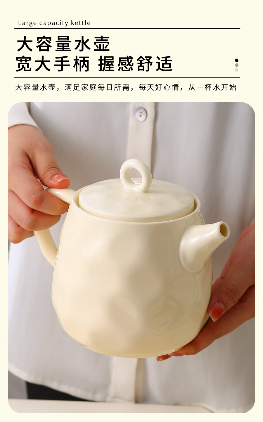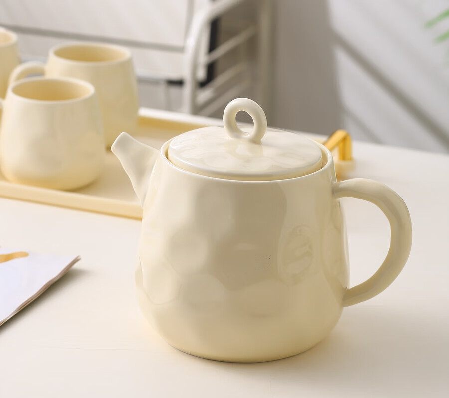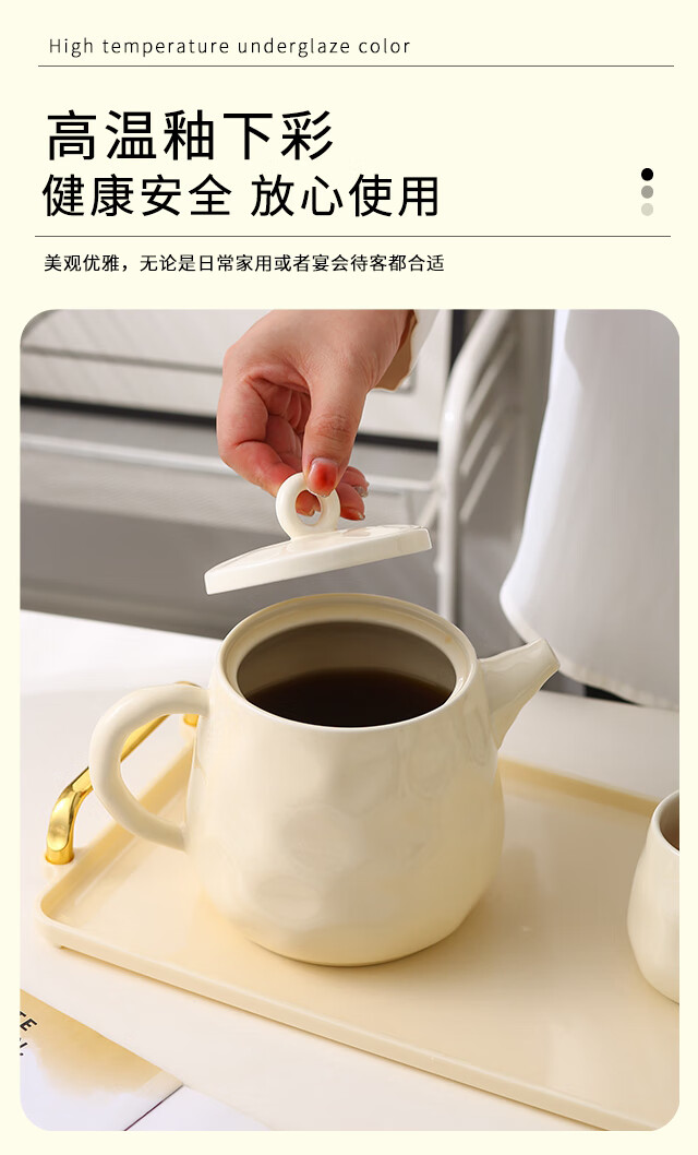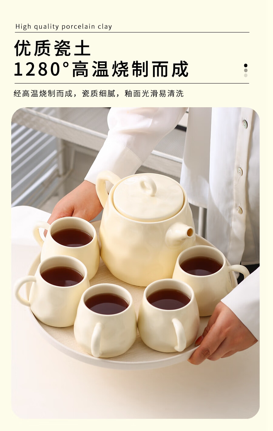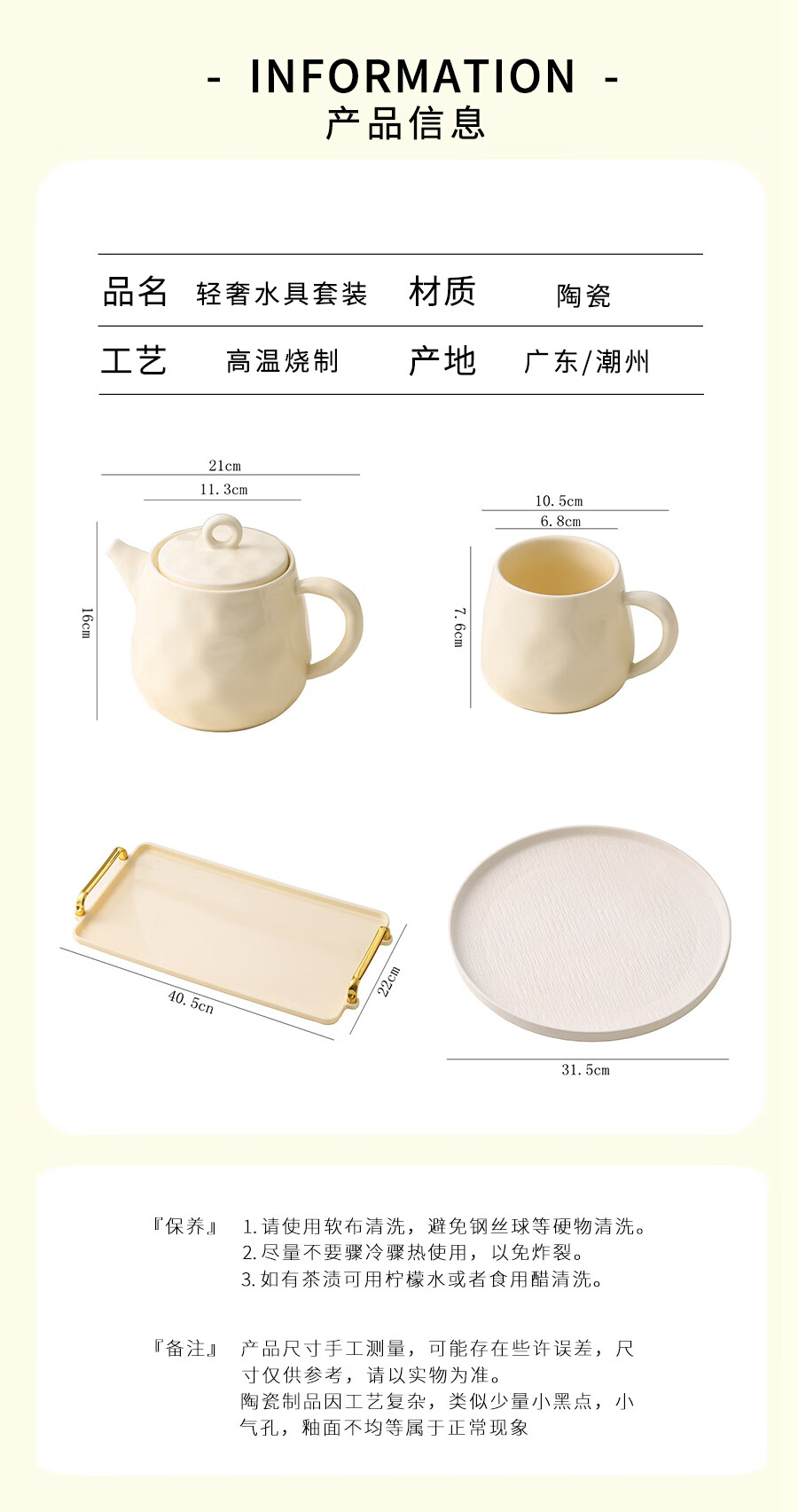 Light luxury household water set with tray, ceramic set, cup, family set, living room teacup, tea set, flower teapot, milky white, 1 pot, 6 cups + tray