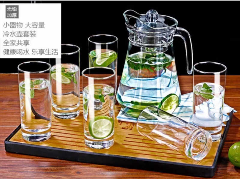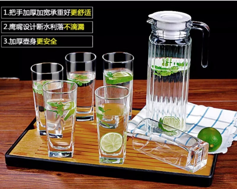 VTyee glass cup cold water cup cold kettle set large capacity cold kettle with lid explosion-proof juice jug duckbill kettle + 4 round tall cups