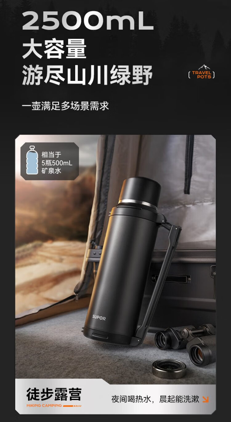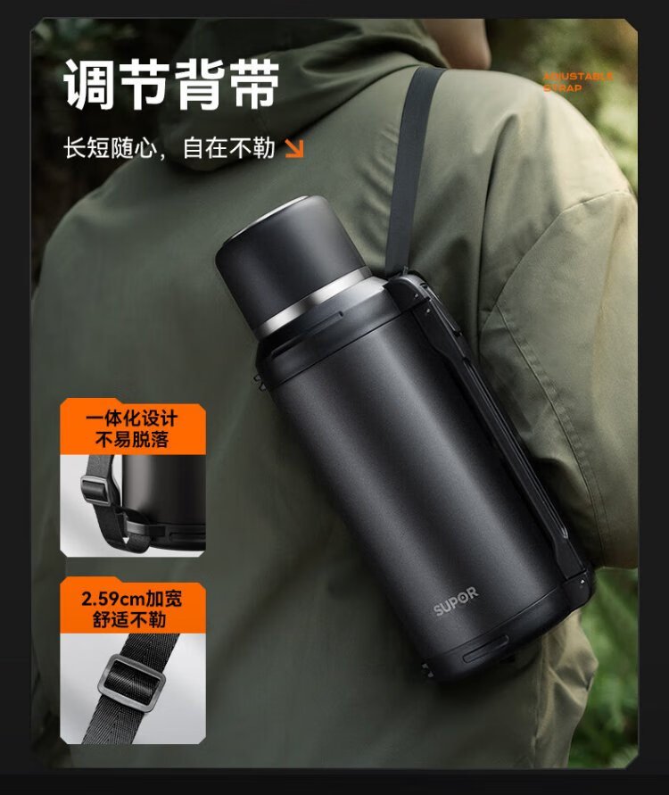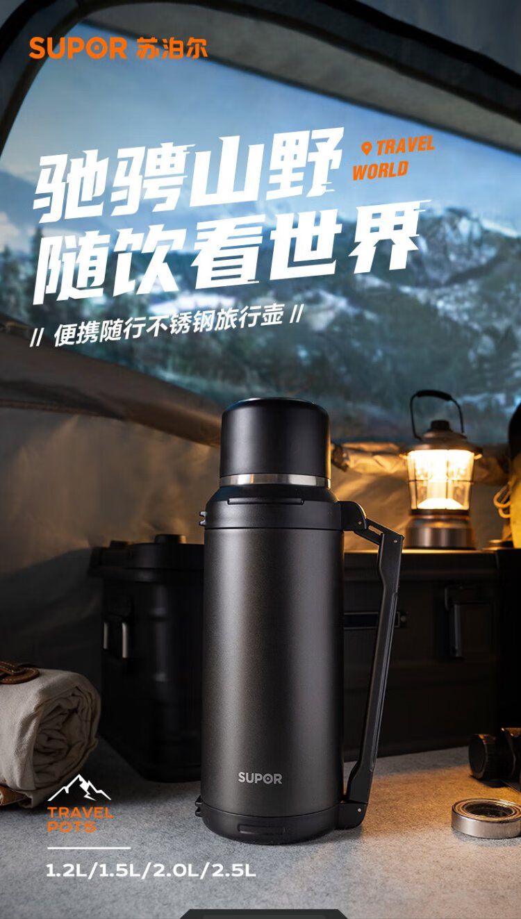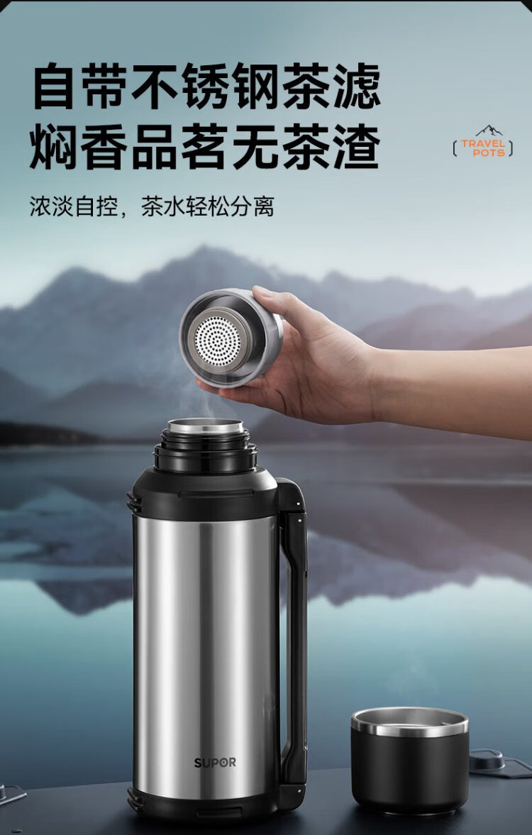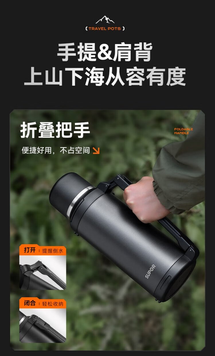 SUPOR thermos kettle large capacity stainless steel 72-hour thermos kettle thermos outdoor travel kettle portable car cup elegant black 2L upgraded 316L stainless steel + tea filter + strap